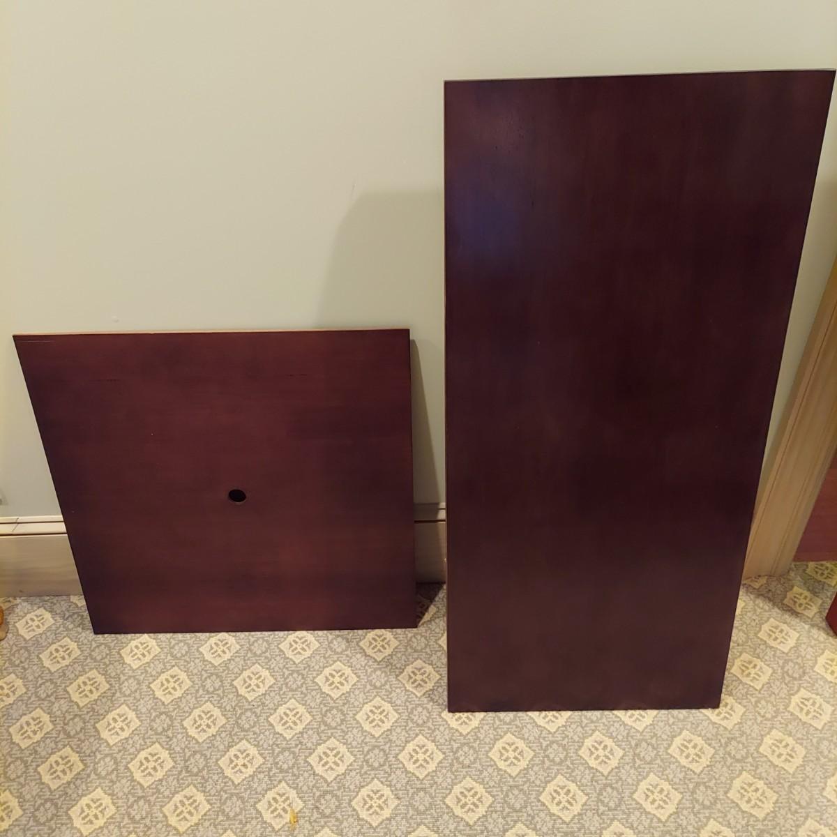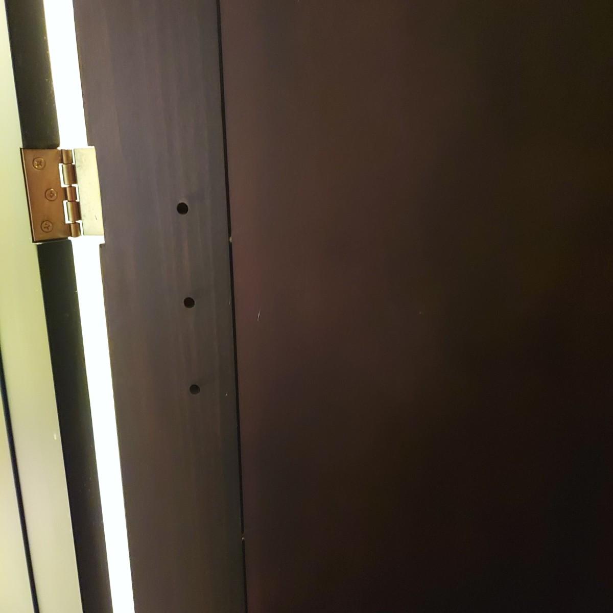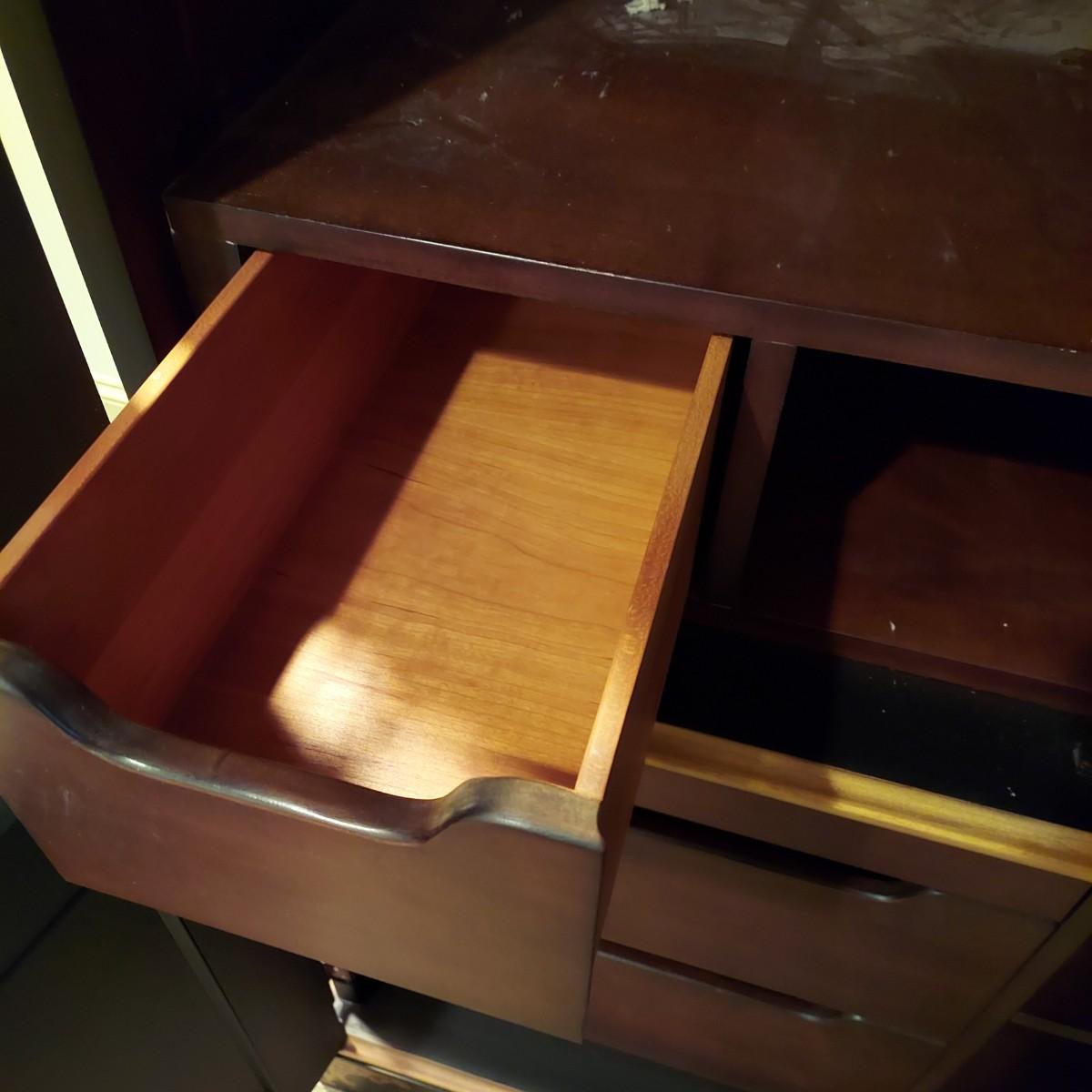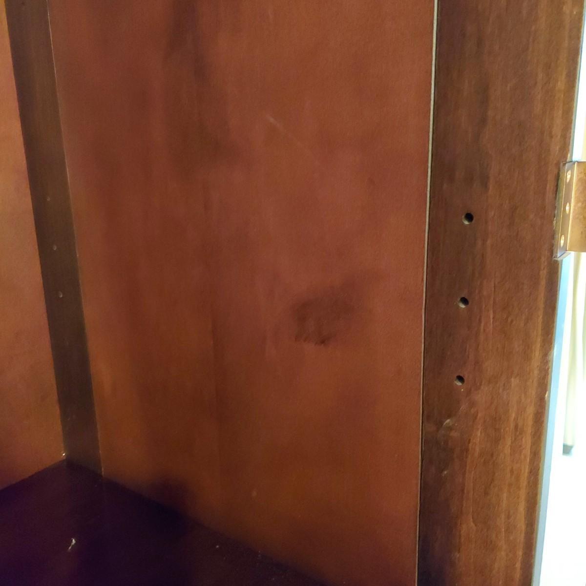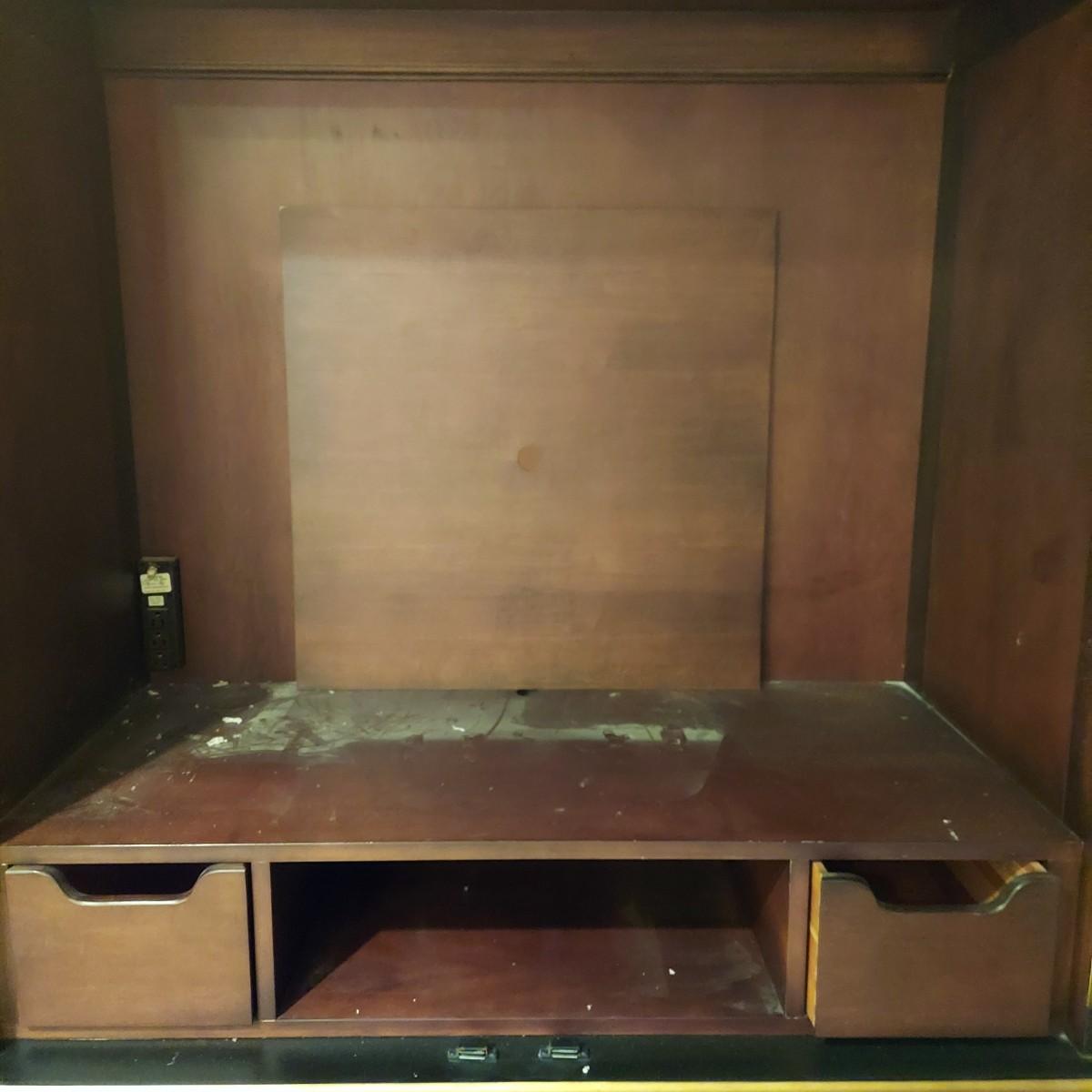Solid wood entertainment cabinet with black and gold finish and mirrored doors. Has beautiful Eastern Asian style design elements. Hardware appears to be brass. Measures 50" x 25" x 84"H. There are extra pieces including a shelf, several metal shelf pegs and the insert to fill the TV cutout. Very heavy. Located on the first floor but there are several steps down from the front door. Local Pickup Only. Winning bidder must bring assistance to help move and load this item due to its weight and/or size.