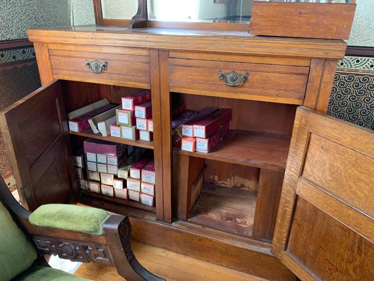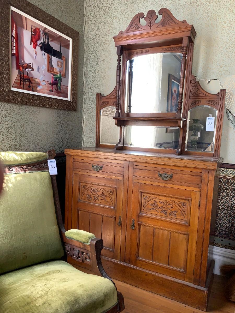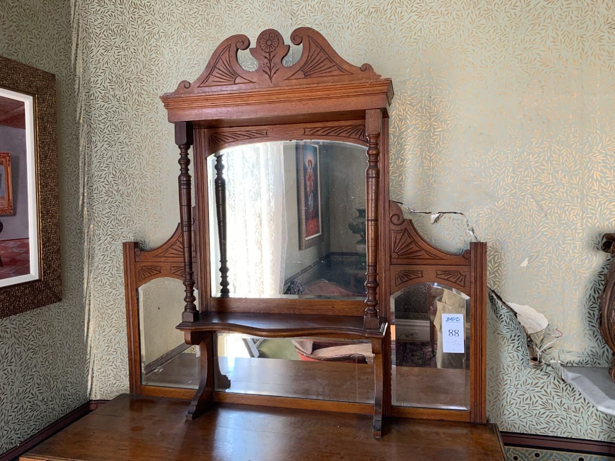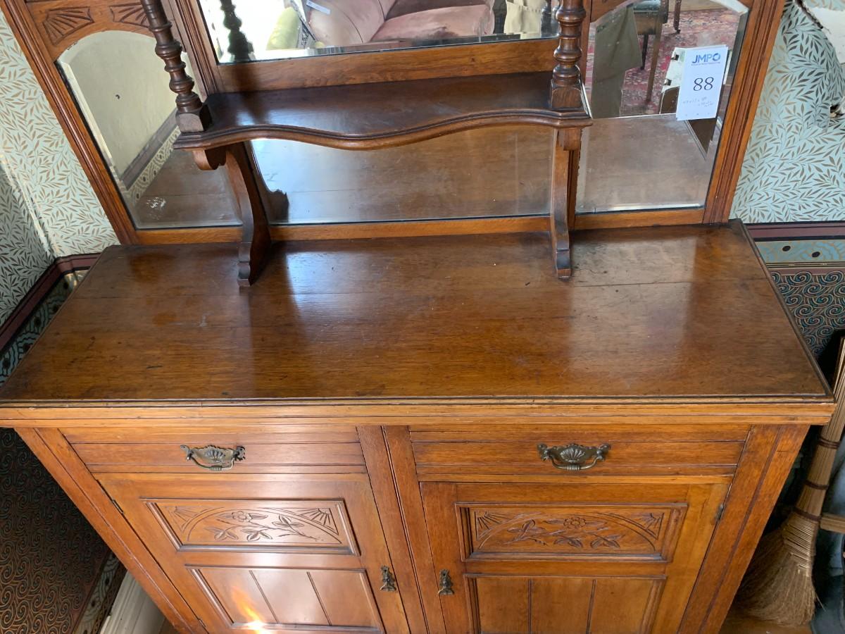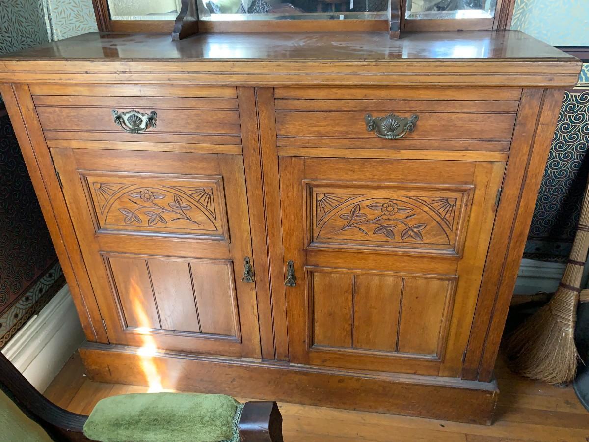 2 Door Cabinet with Shelves (Contents Not Included), 2 Drawers Carved Designs, Ornate Pulls, Beveled Mirror Top has Shelf