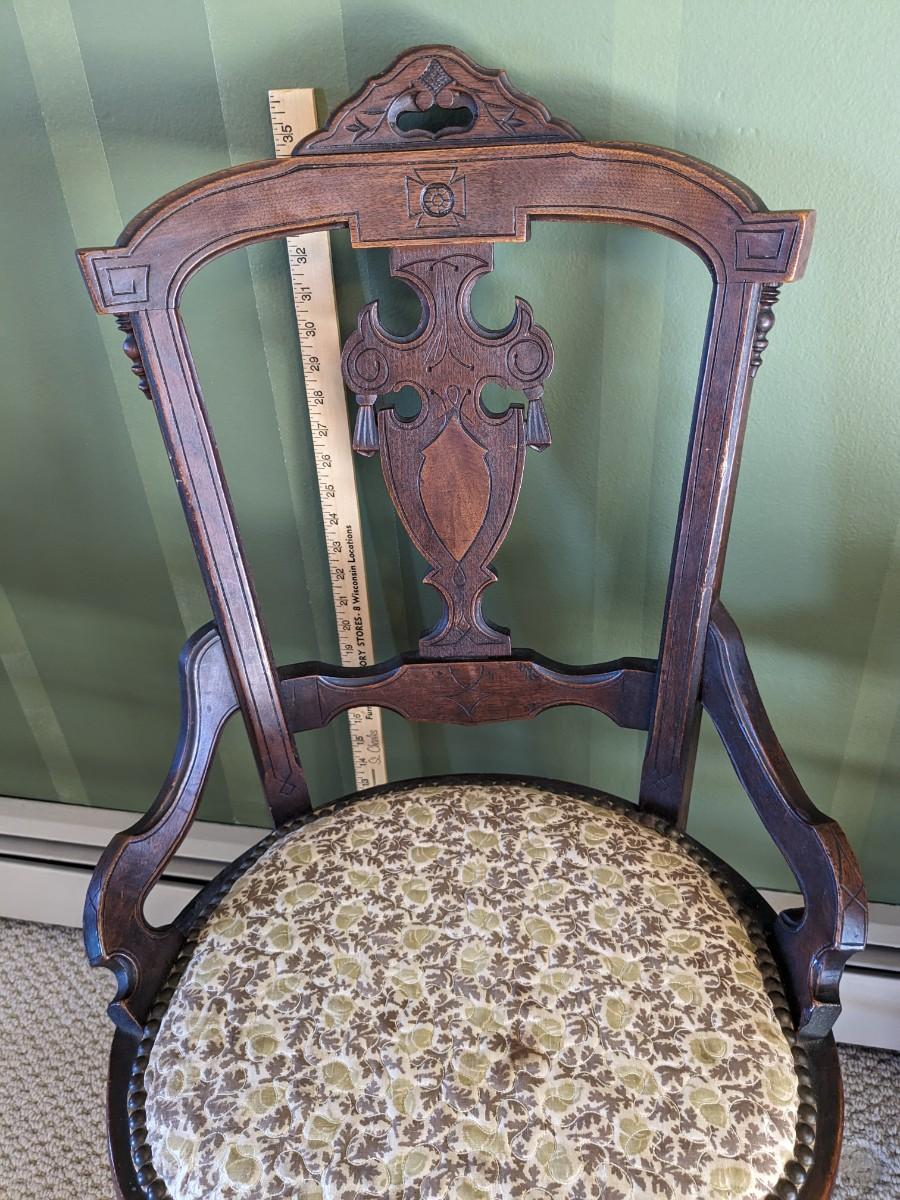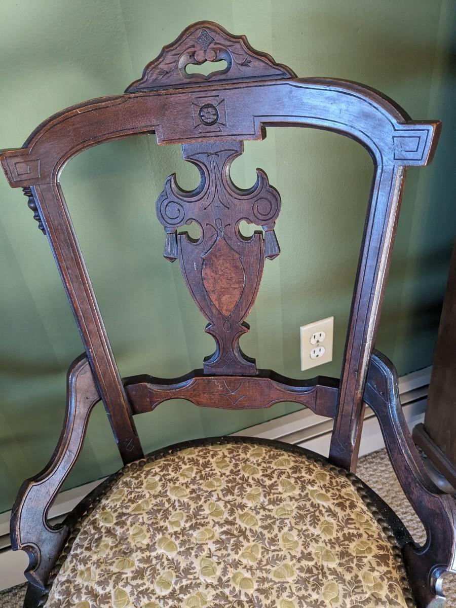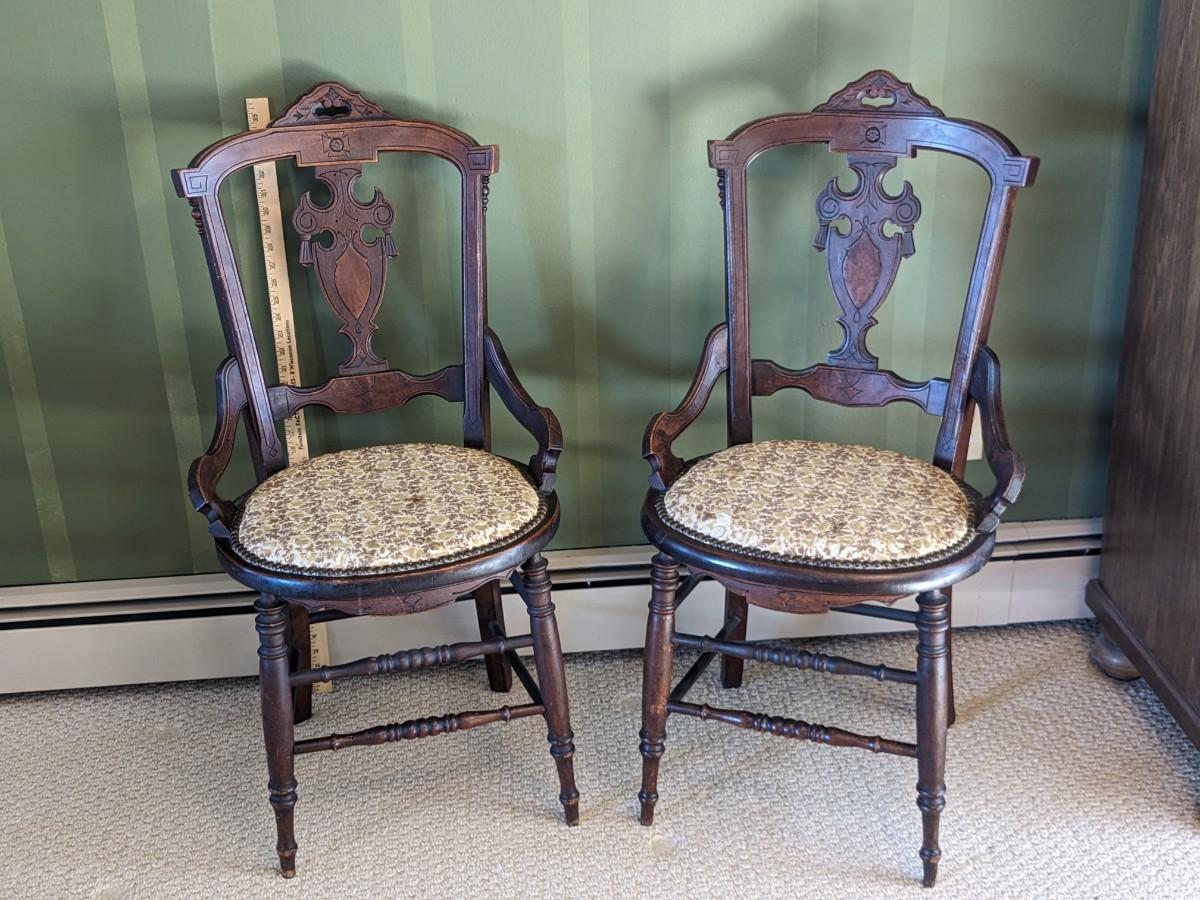 Overall great condition for antique chairs. Joints are not broken, left chair needs some re-gluing but no structural damage. Upholstery minimal wear.