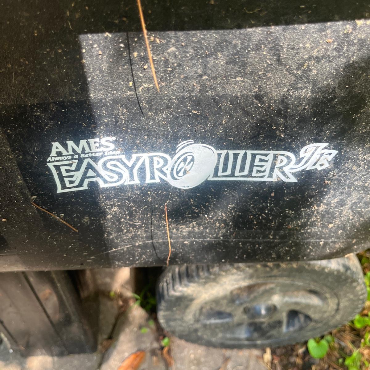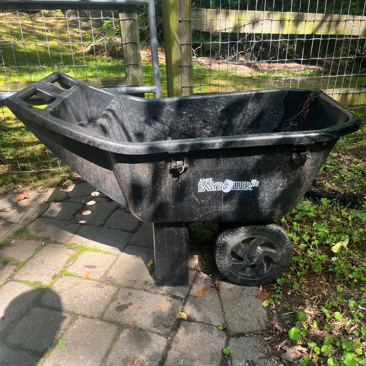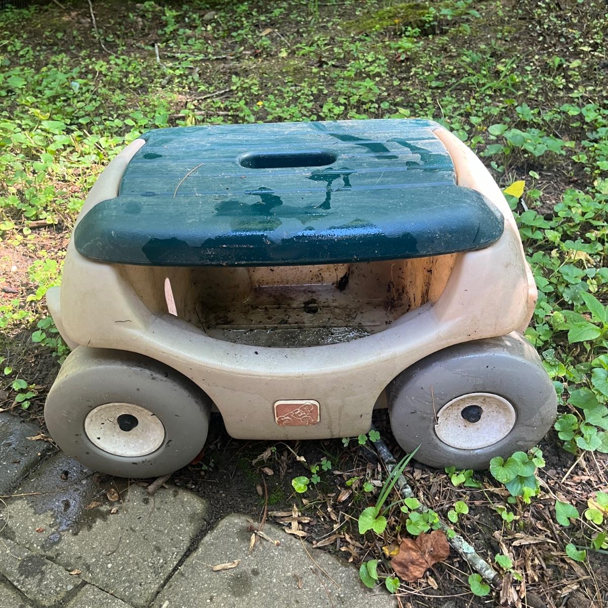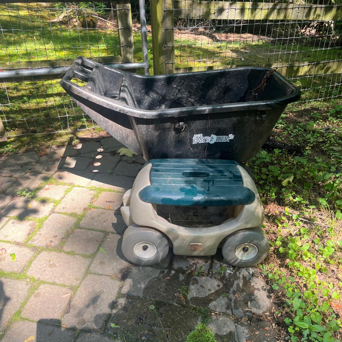 Lot includes an Easy Roller plastic garden cart and a Step2 wheeled plastic seat. Cart measures 37” x 20” x 25”H.