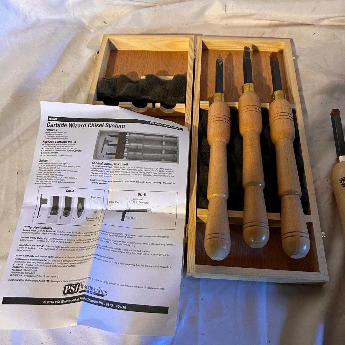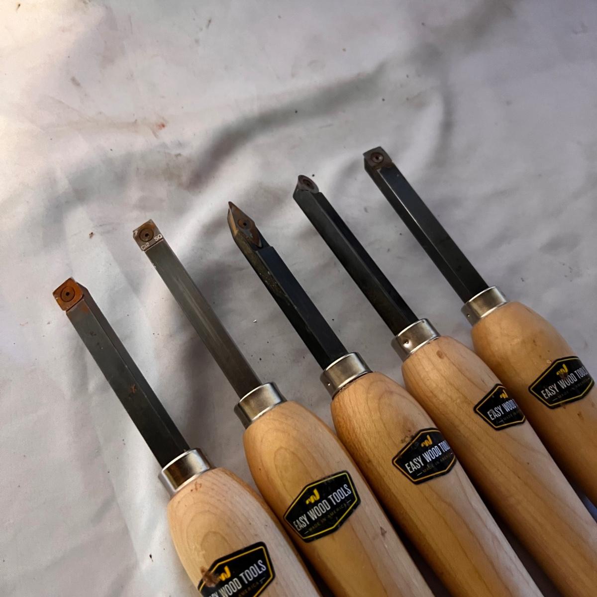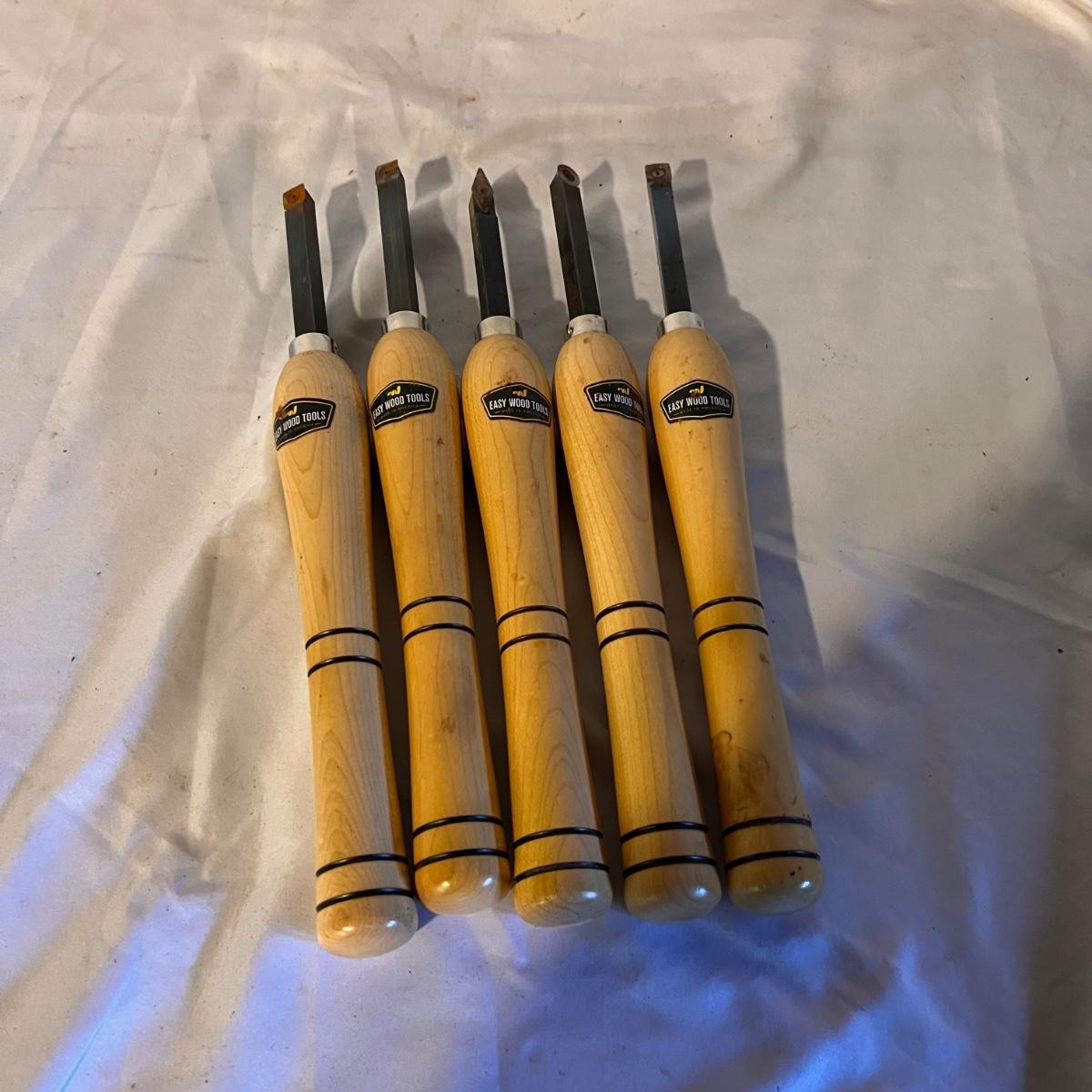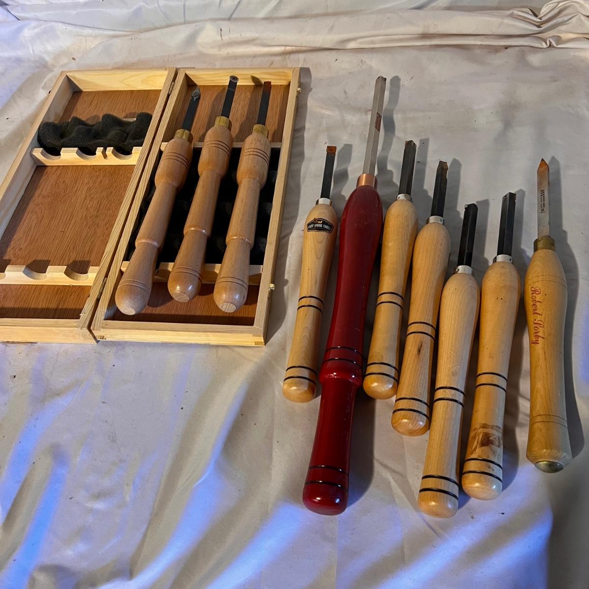 Lot contains a set of five wooden handled ‘Easy Wood tools’ plus two more lathe tools and a carbide chisel set in a wooden box. Red handled tool is 21” long.