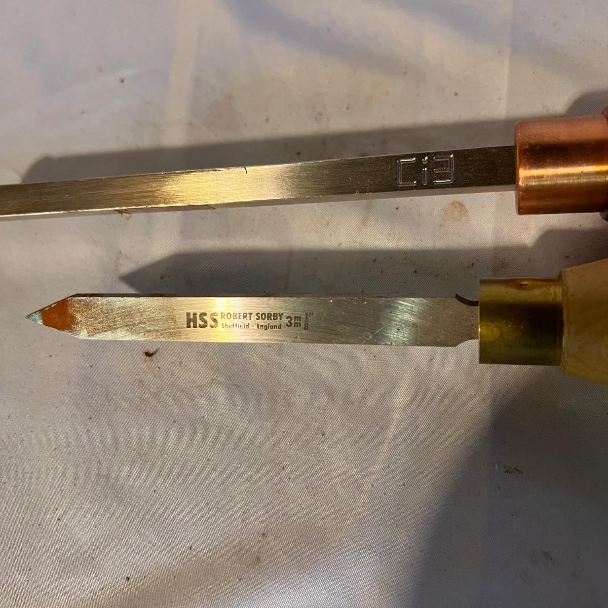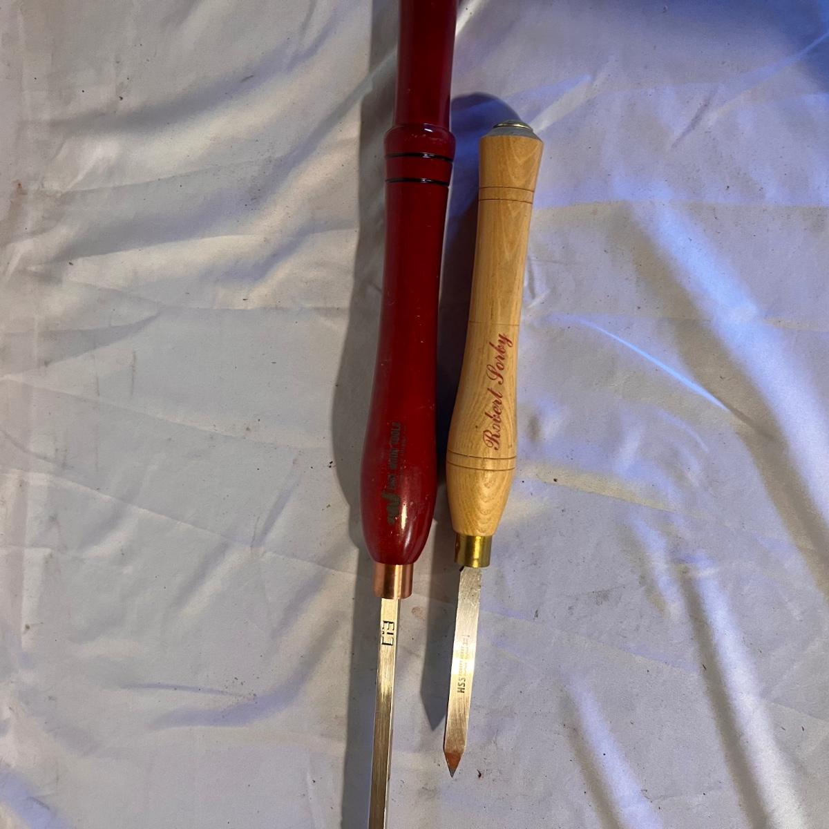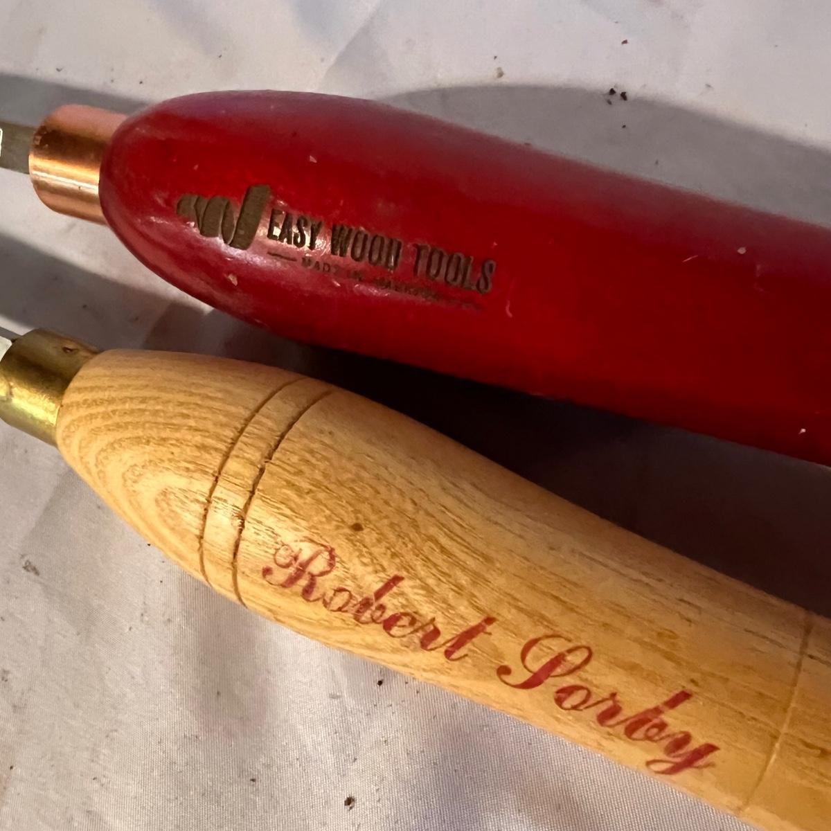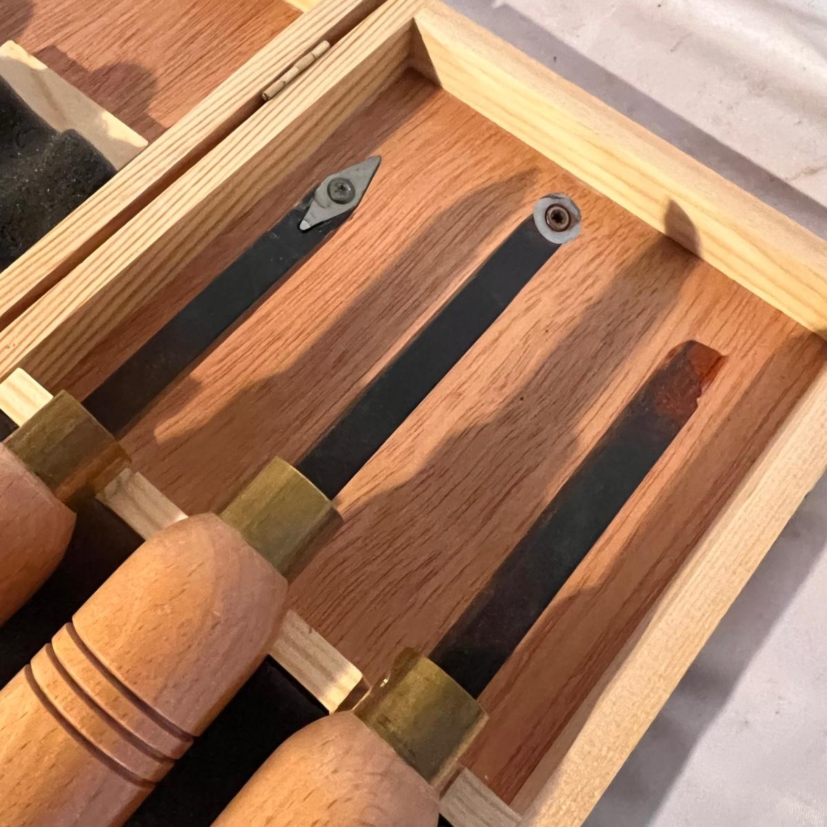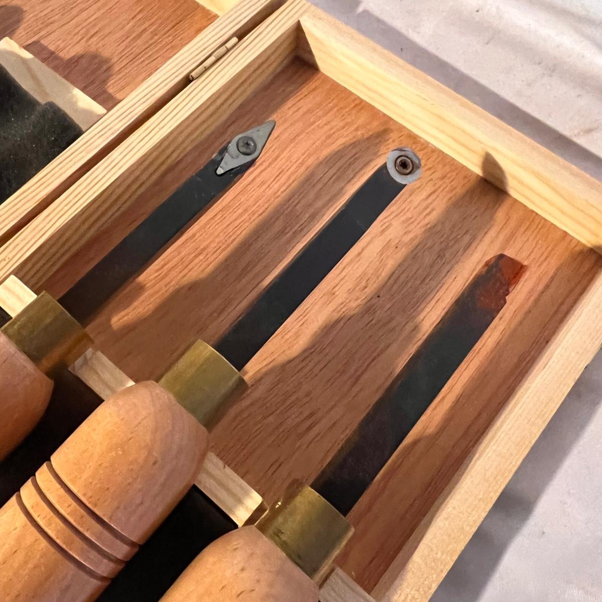 Lot contains a set of five wooden handled ‘Easy Wood tools’ plus two more lathe tools and a carbide chisel set in a wooden box. Red handled tool is 21” long.