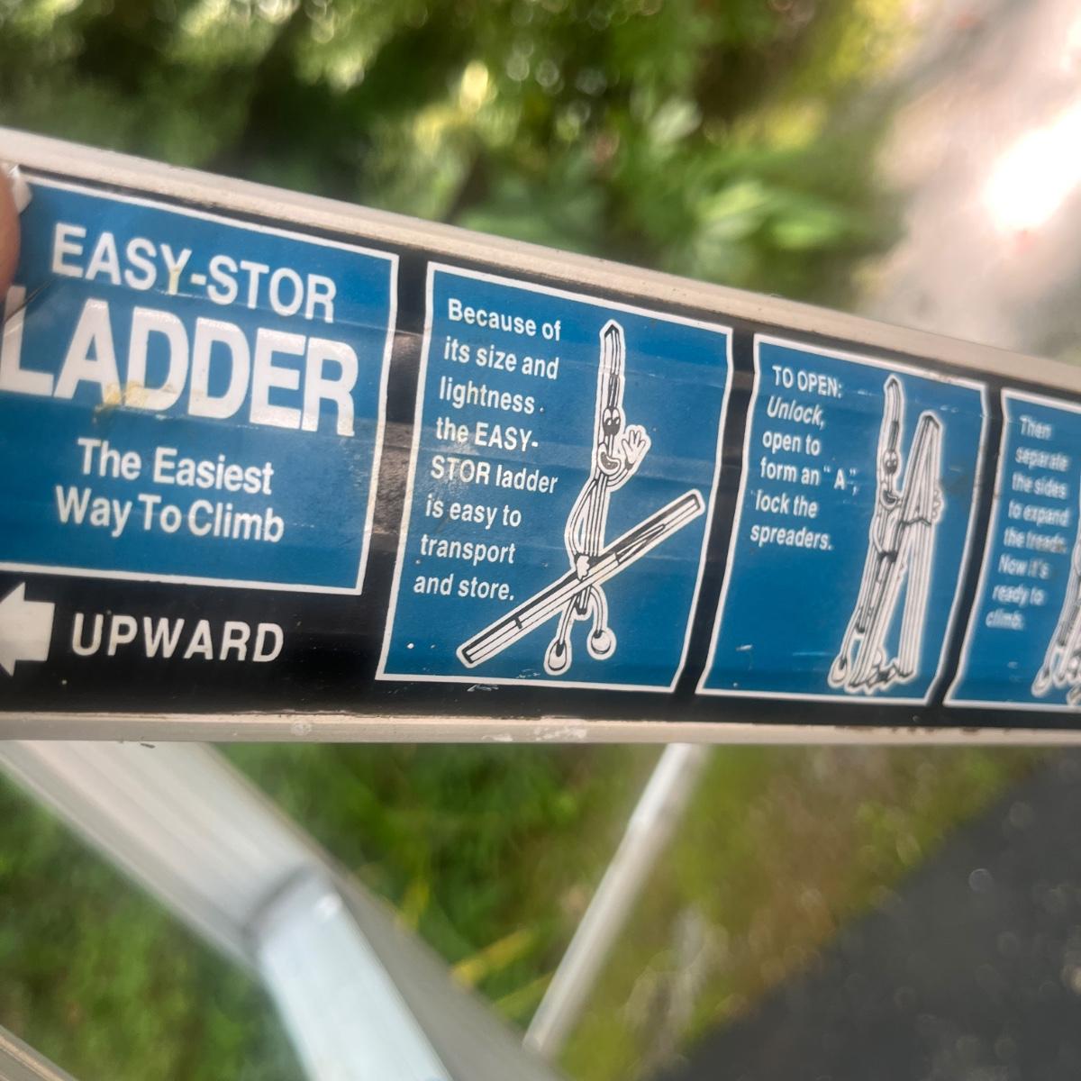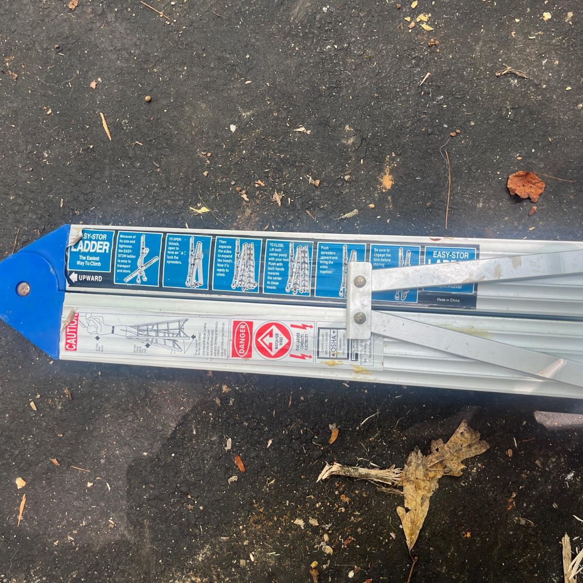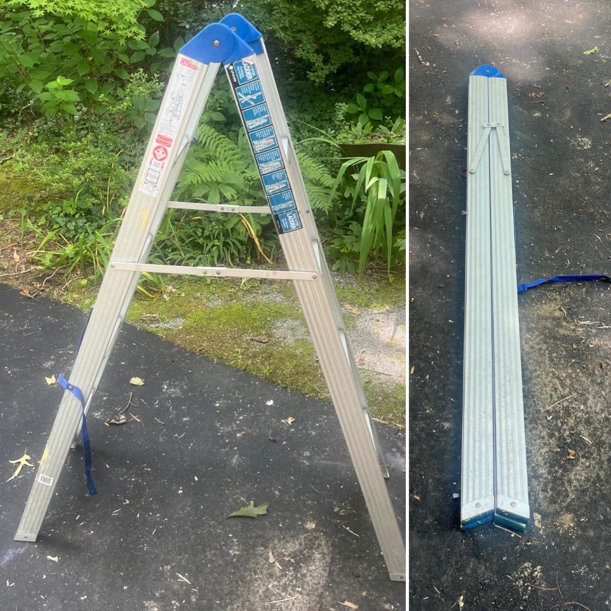 Lot includes a unique Easy-Stor folding aluminum ladder. Ladder measures 17” x 46” 58”H when open and 5” x 3” x 60”H when closed.