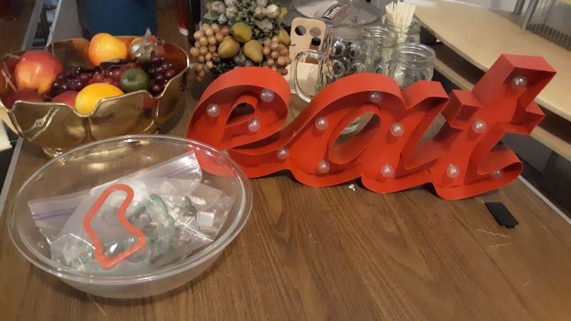 EAT LIGHT SIGN AND KITCHEN ITEMS