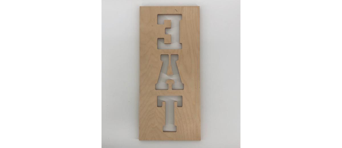 Wooden cut out “EAT” sign perfect for crafting or painting to style your kitchen. Measures 6.5” x 14.25” x 0.25”. Has slight scuffing and marks.