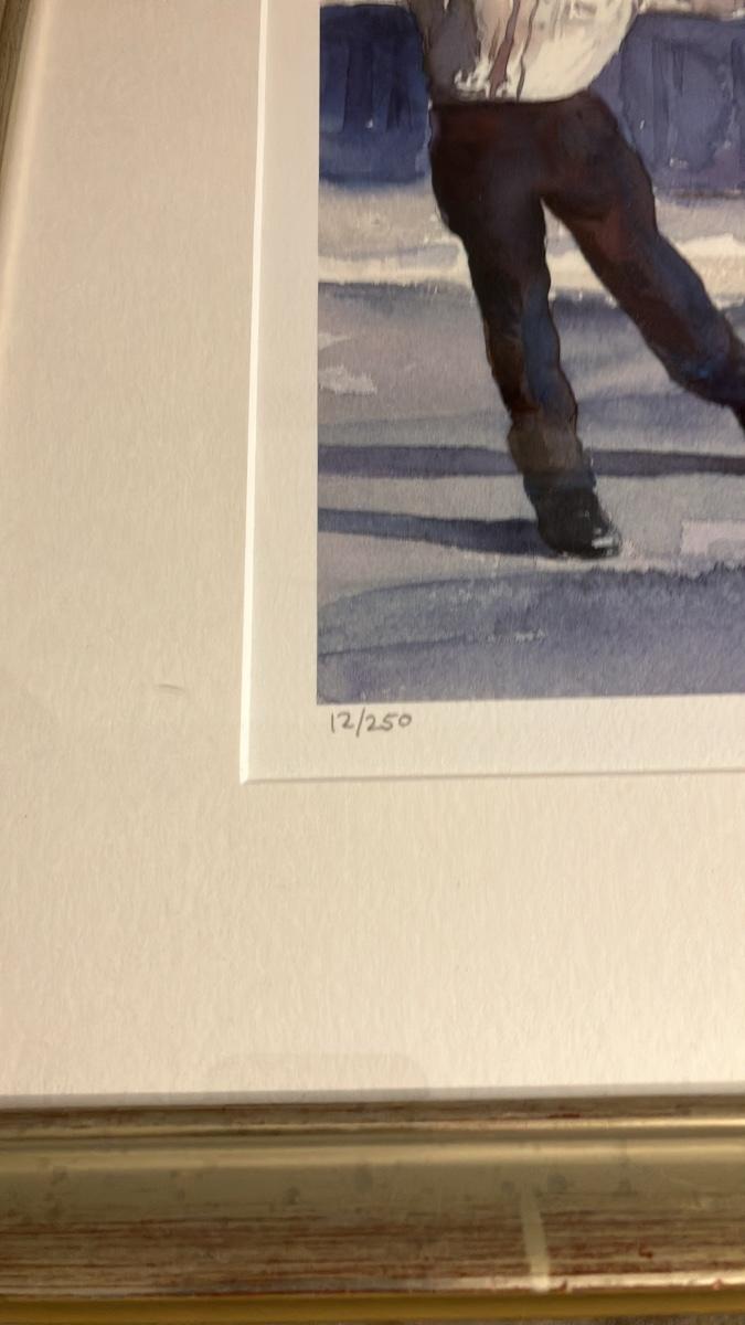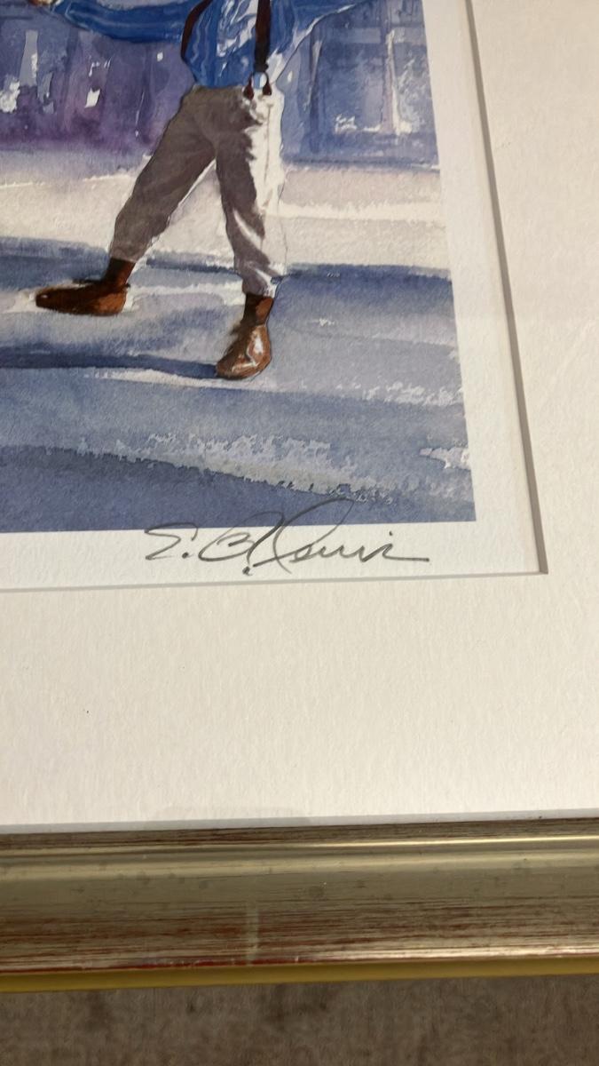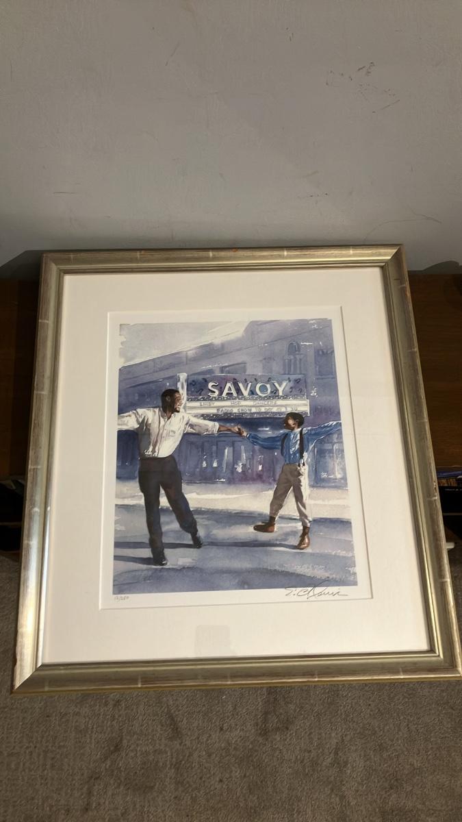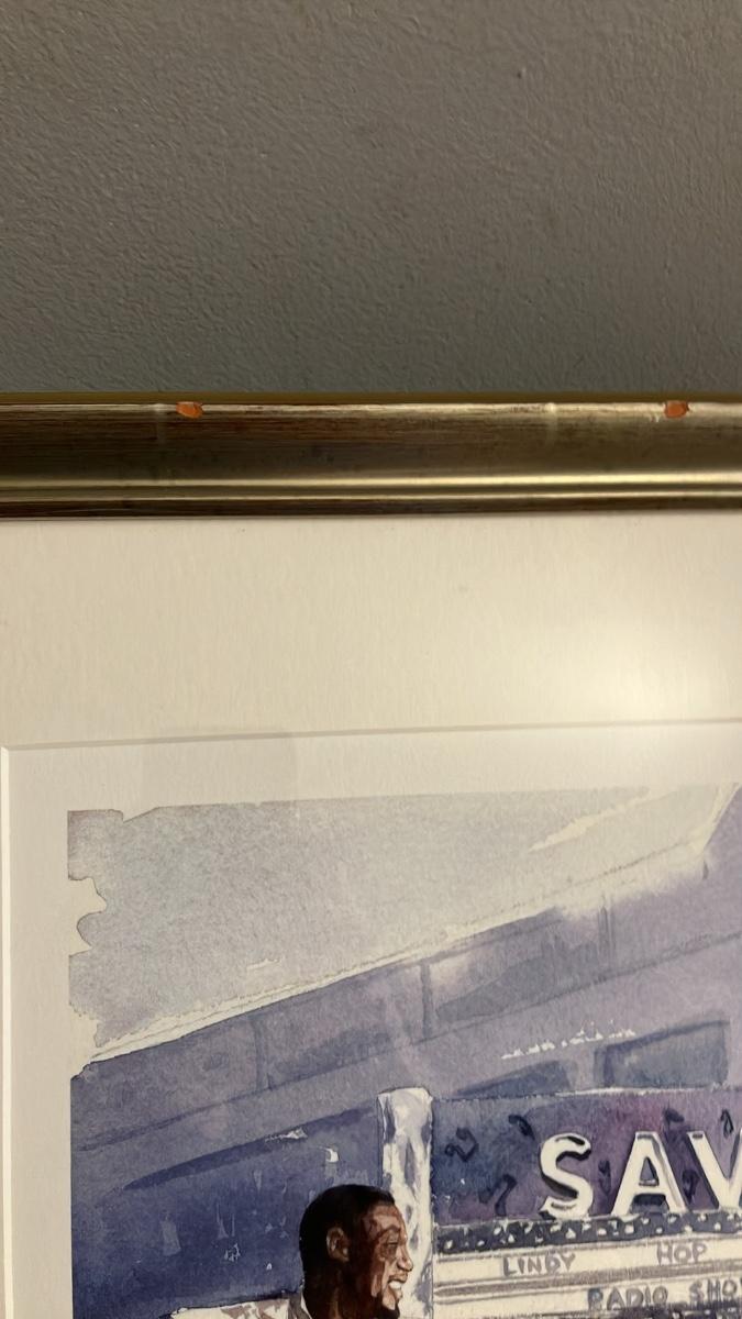 Lewis's masterful watercolor style shines through in dreamy blues and purples, evoking motion, love, and history (echoing his book Happy Feet: The Savoy Ballroom Lindy Hoppers and Me). From a limited edition (signed lower right), in pristine condition with vibrant colors—no fading or damage. Elegantly matted in white and framed in silver wood for immediate display. Perfect for art lovers, jazz enthusiasts, or anyone celebrating African American stories.