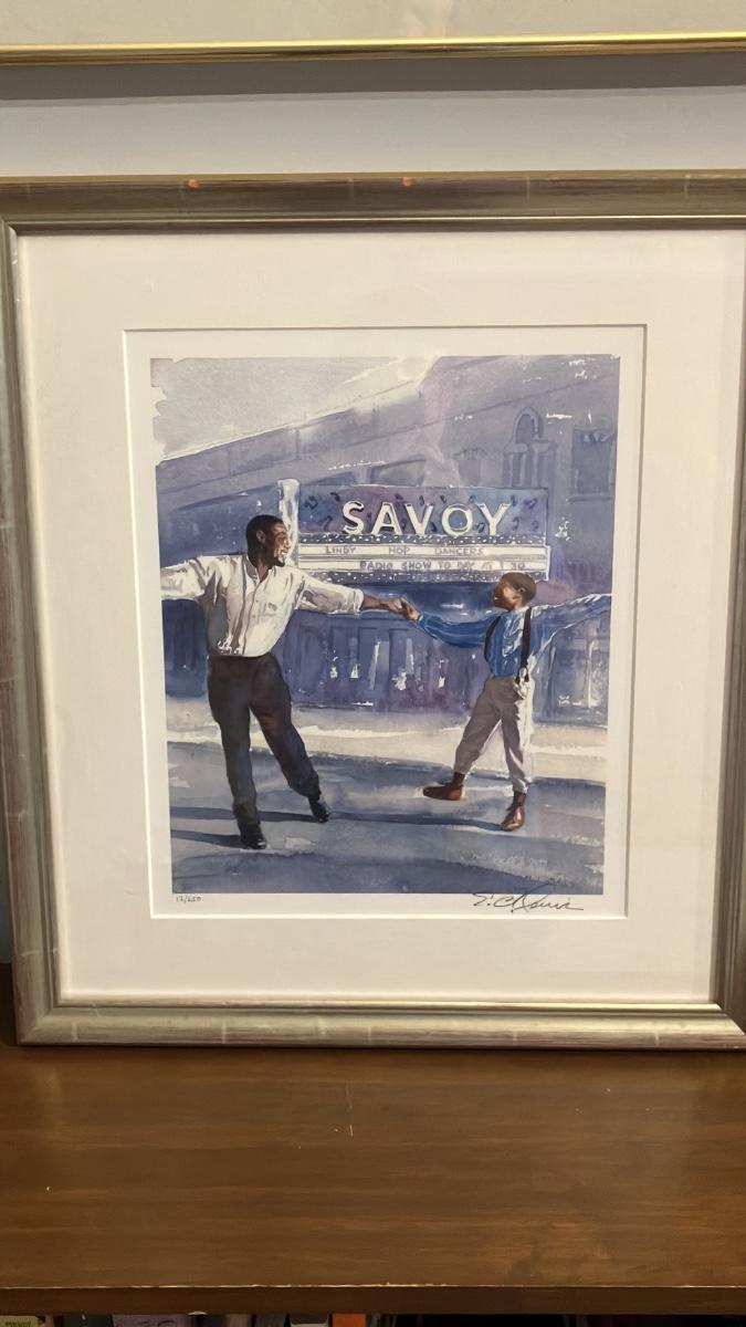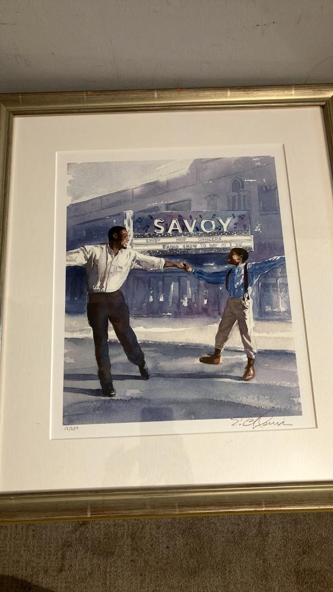 Elevate your space with this stunning limited edition lithograph by award-winning artist E.B. Lewis (Caldecott Honor, Coretta Scott King Illustrator Award winner). Titled Savoy Dance (or similar; inspired by his iconic Savoy Ballroom illustrations), this 18" x 20" pencil-signed print captures a heartwarming moment of a Black father and young son swinging into joyful motion on a Harlem street, lit by the glowing "SAVOY" theater sign—a nod to the legendary swing era and Black cultural heritage.