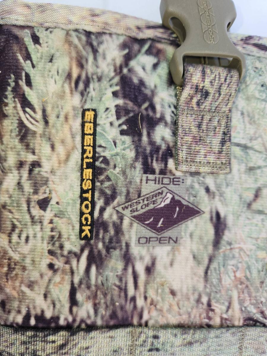Eberlestock rifle scabbard featuring the 'Hide Open' design with camouflage pattern. Constructed with durable materials and includes a secure clip closure mechanism. Designed for efficient rifle transport and storage in outdoor settings. Specific dimensions and material details are not provided.
