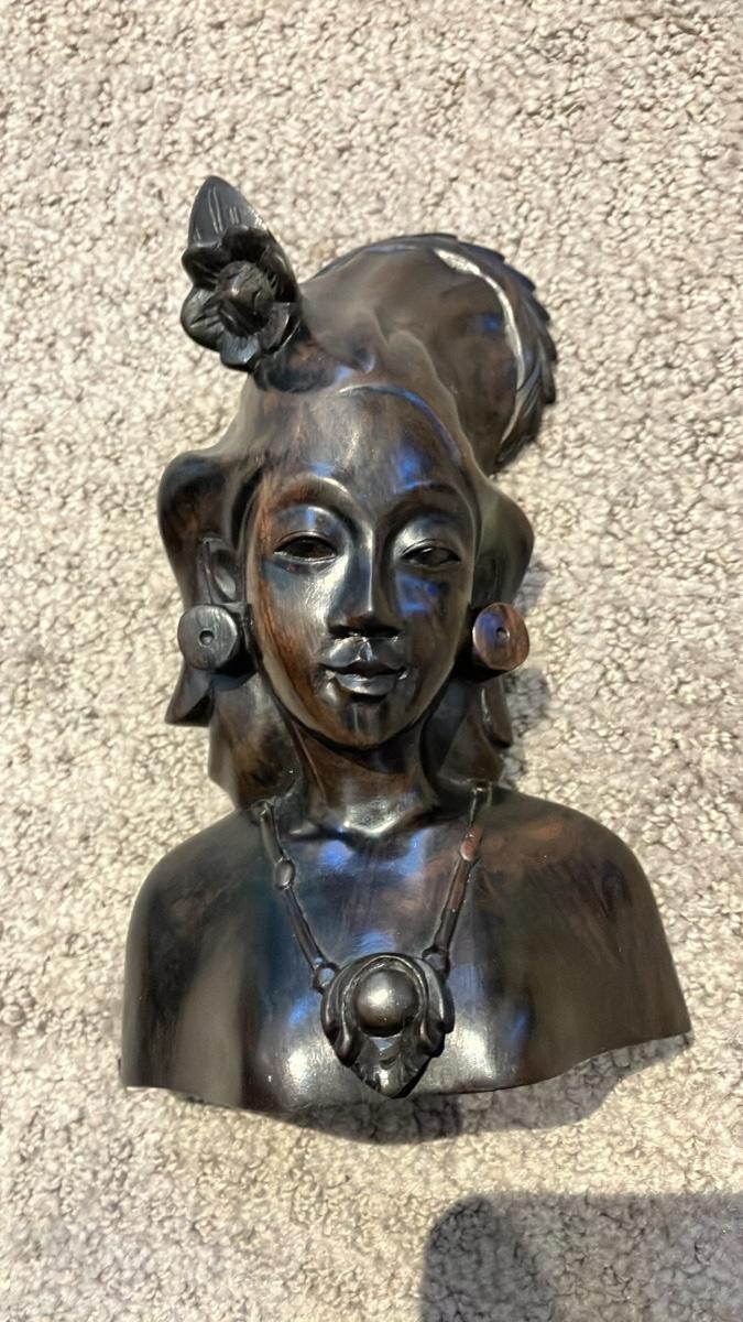 This is a vintage hand-carved wooden bust of a Balinese woman.