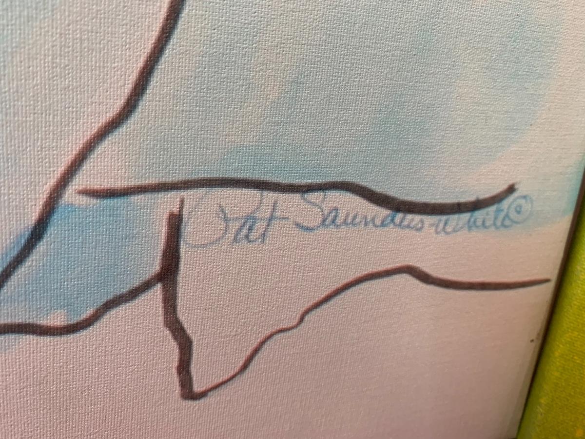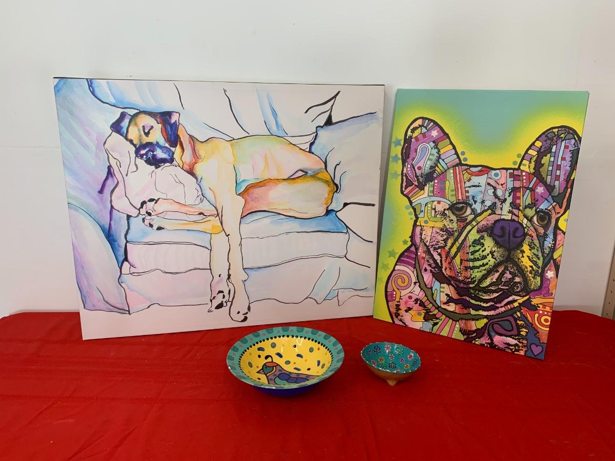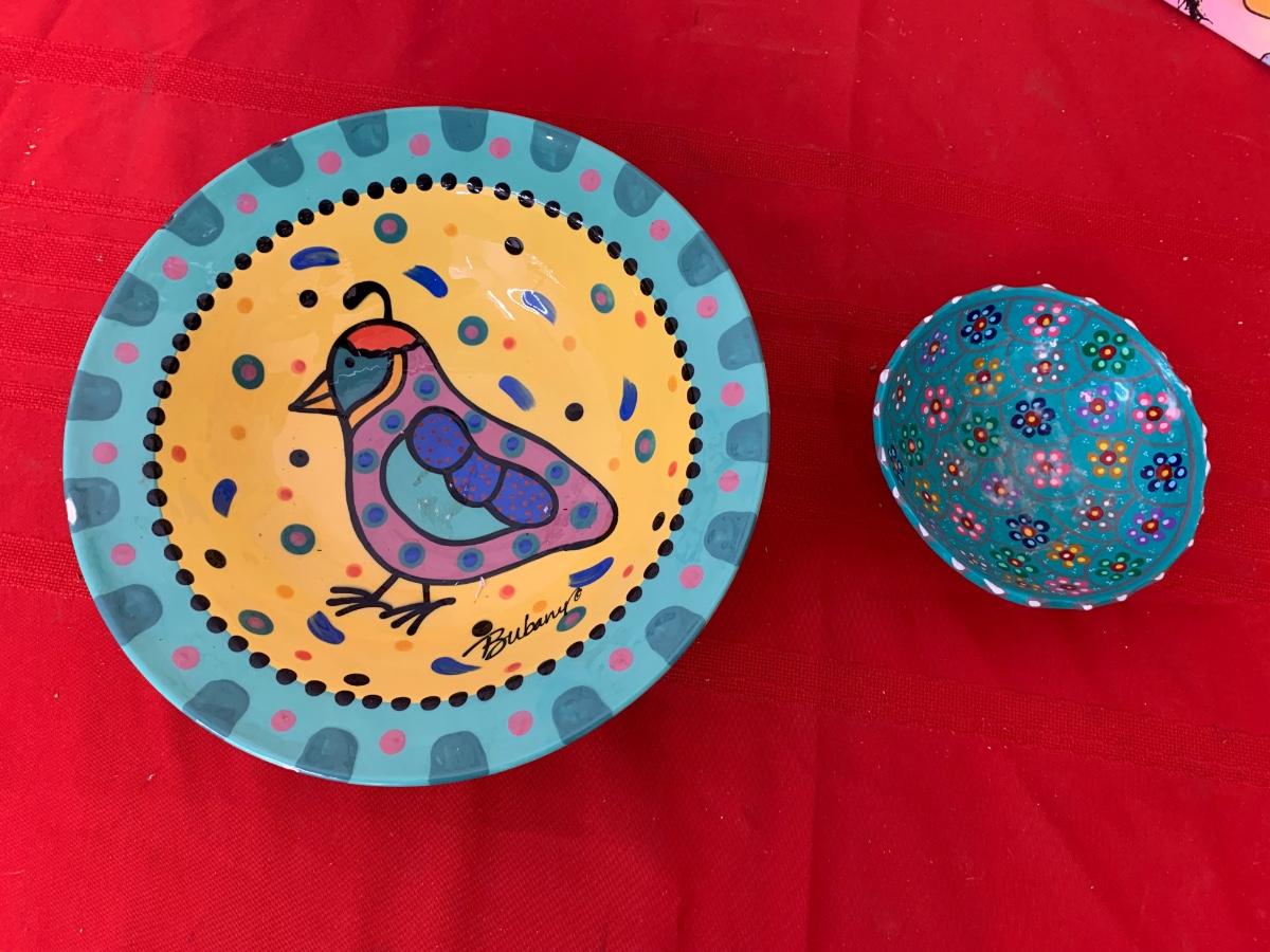 Two bright colored animal portraits and two colorful bowls. Large bowl made by Bubany local tucsonan artist