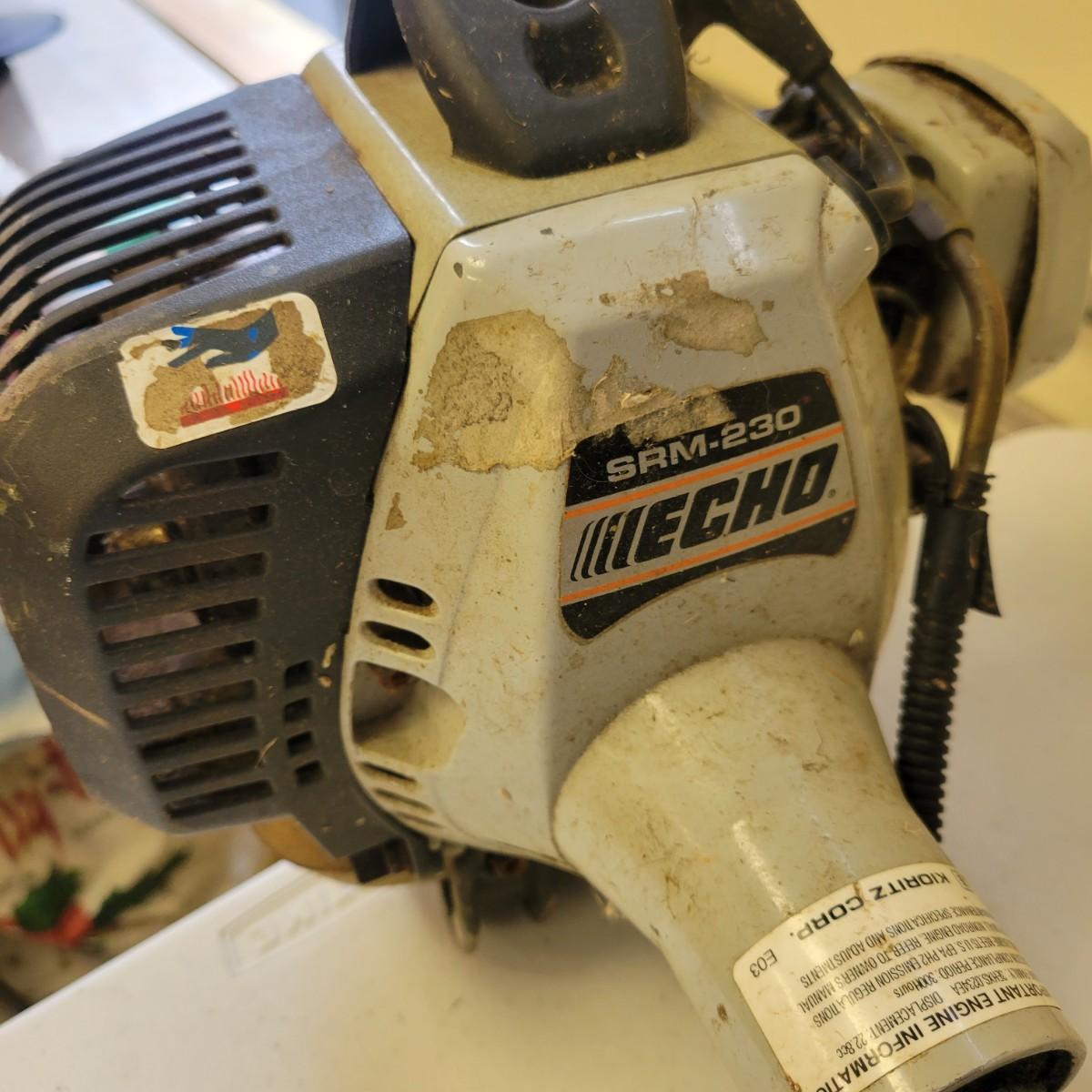 An Echo string trimmer and accessories in good condition. This is an Echo SRM-230 string trimmer. It was tested and turned over smoothly. There is still fluid in the fuel reservoir. Also included is a spool of trimming line made by Stihl and three packages of pre cut line. Local pickup only