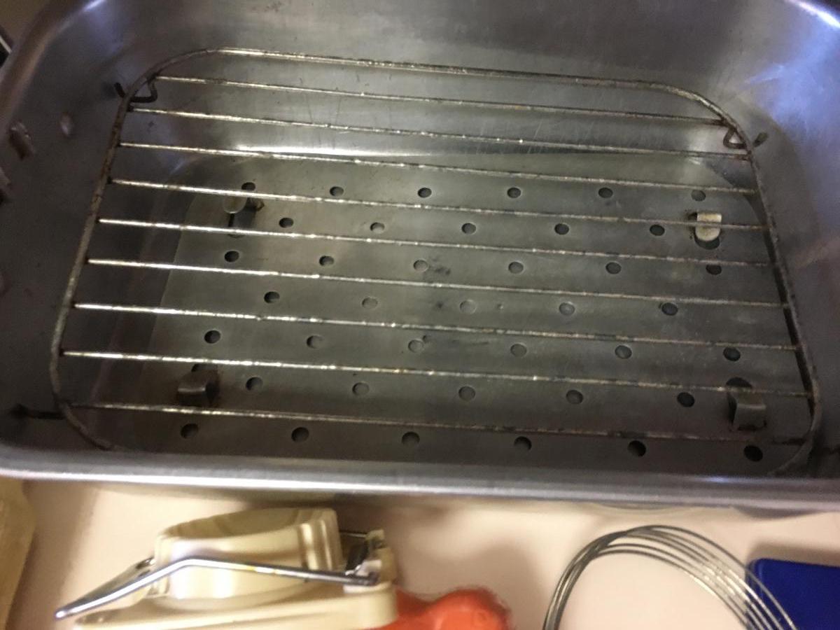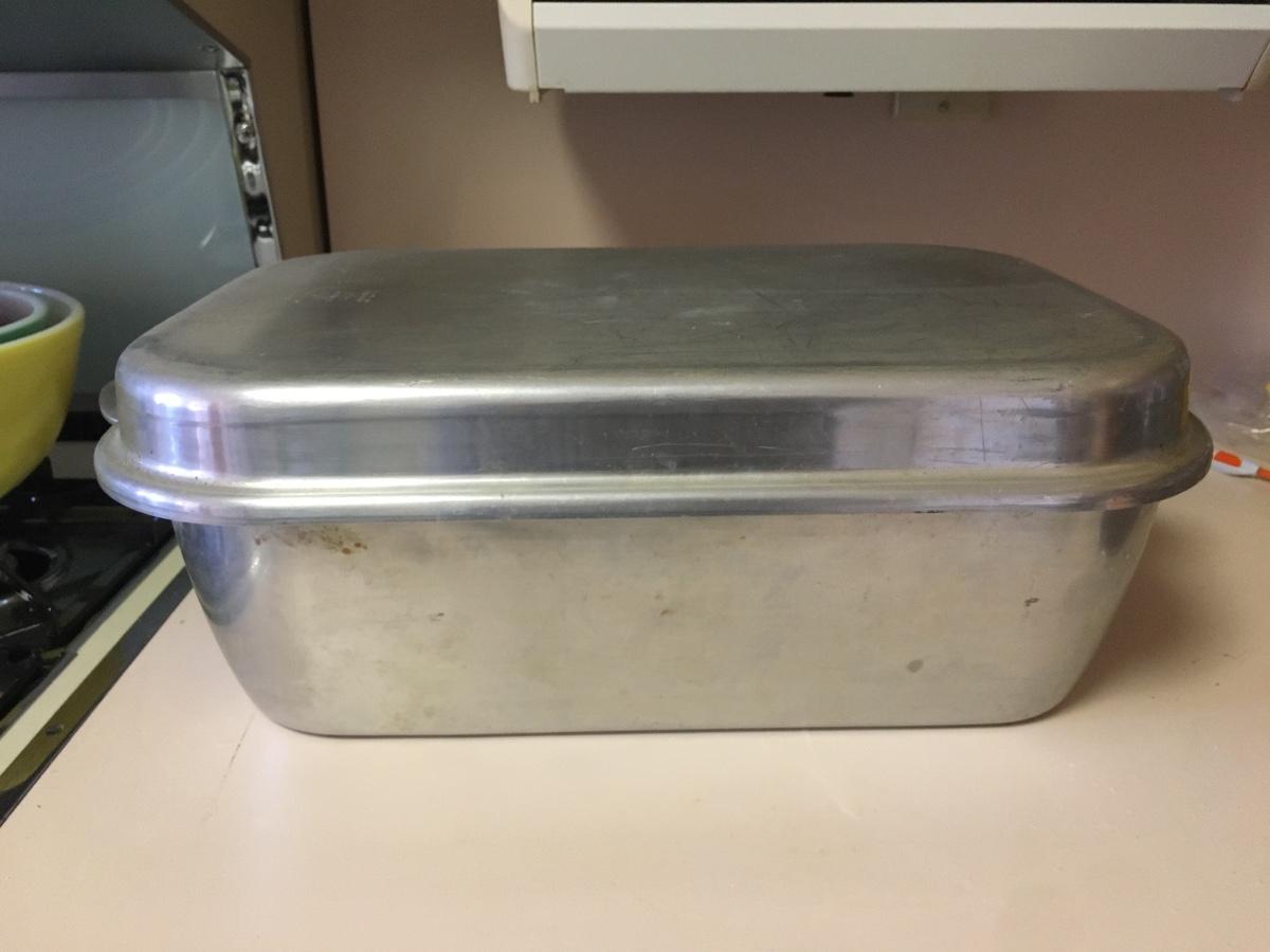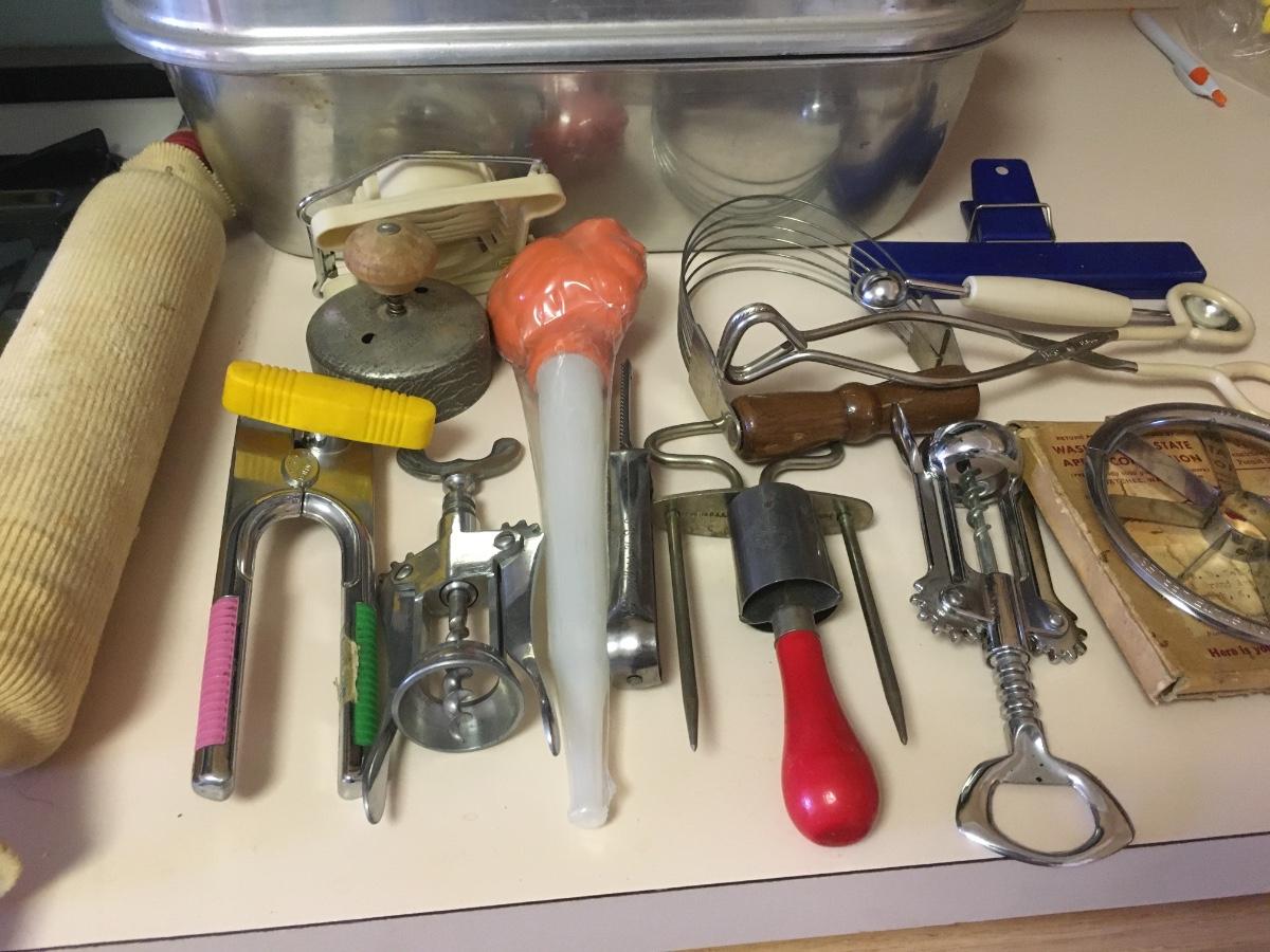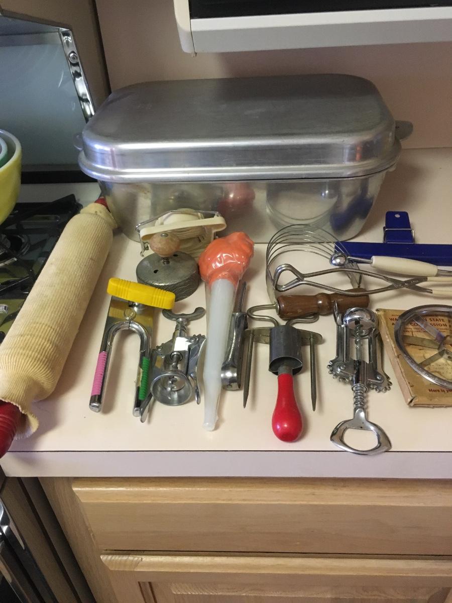 assortment of vingtage kitchen tools, along with wearever aluminum roasting dish.