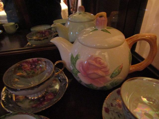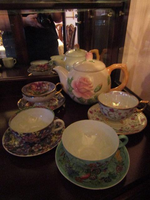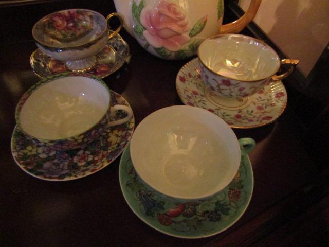 Eclectic Mix of Teapot with Mismatched Cups and Saucers
