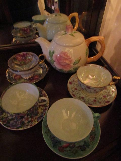 Eclectic Mix of Teapot with Mismatched Cups and Saucers. Teapot with 4 cups and saucers.
