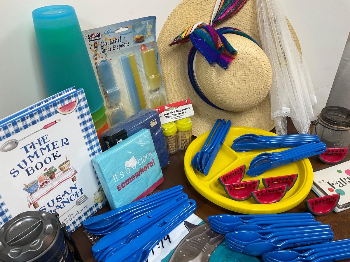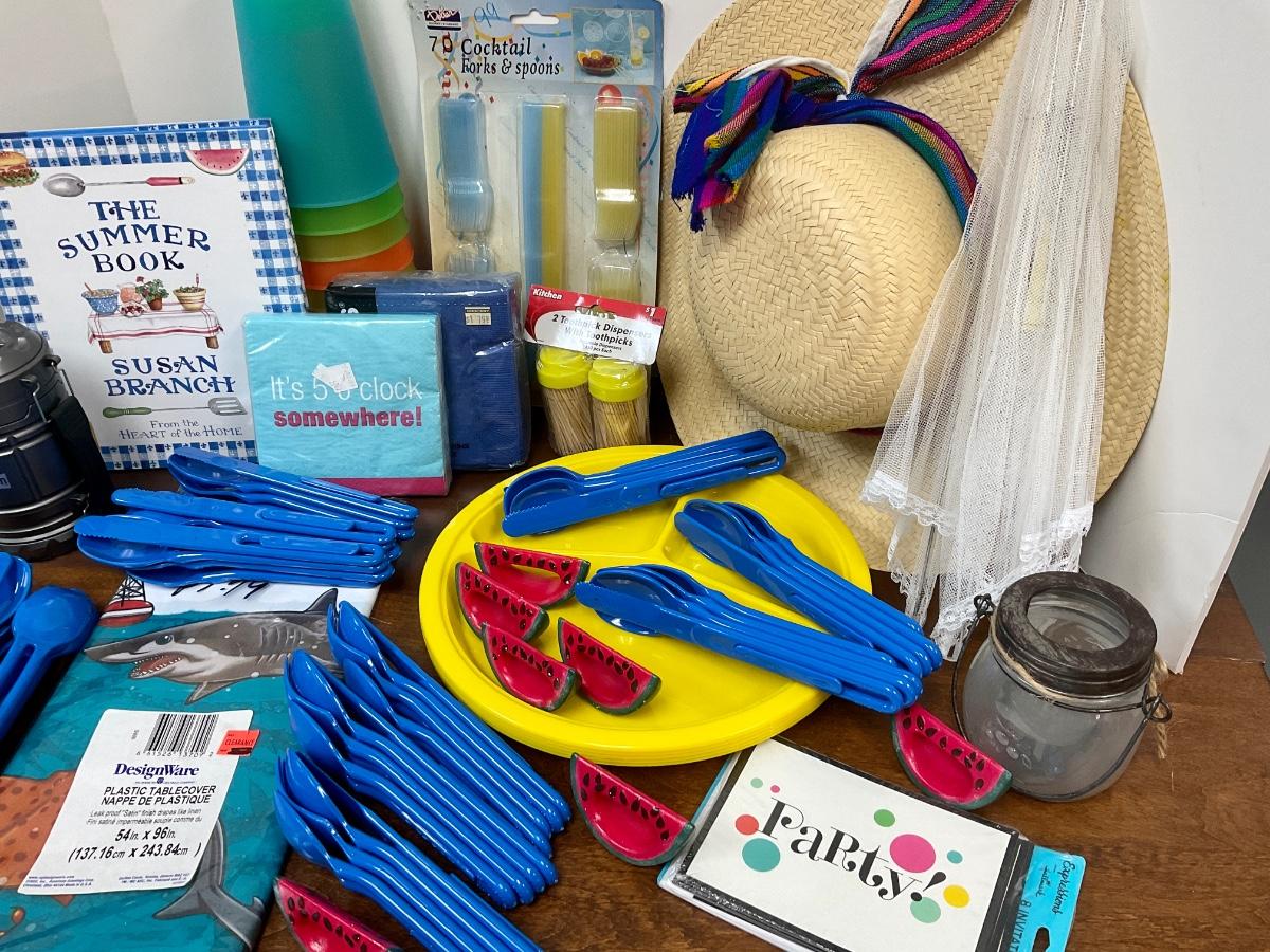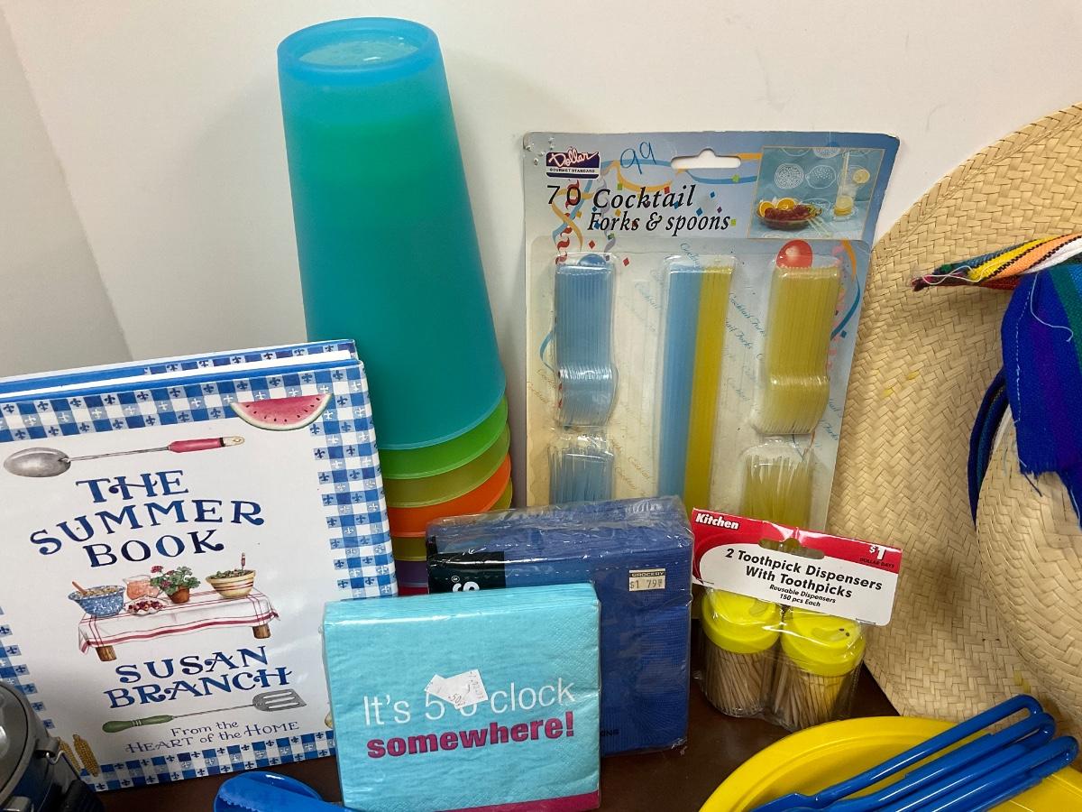 See picture for condition which ranges from good to new in package. Contains Straw hat with multicolored band, white lace umbrella for food, two toothpick dispensers, two packages of napkins, 1 vintage jar candle holder, 7 watermelon napkin rings, 1 plastic tablecloth (sharks), 1 Hero Beam flashlight, 1 set of plastic Cocktail forks & spoons, 12 plastic connecting utensil sets, 5 divided plastic yellow plates, 10 plastic tumblers, 8 party invitations in pkg, and “The Summer Book” .
