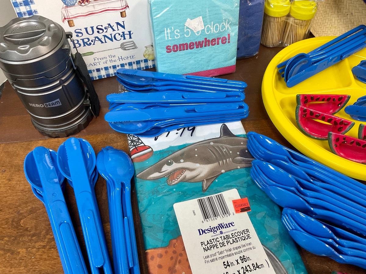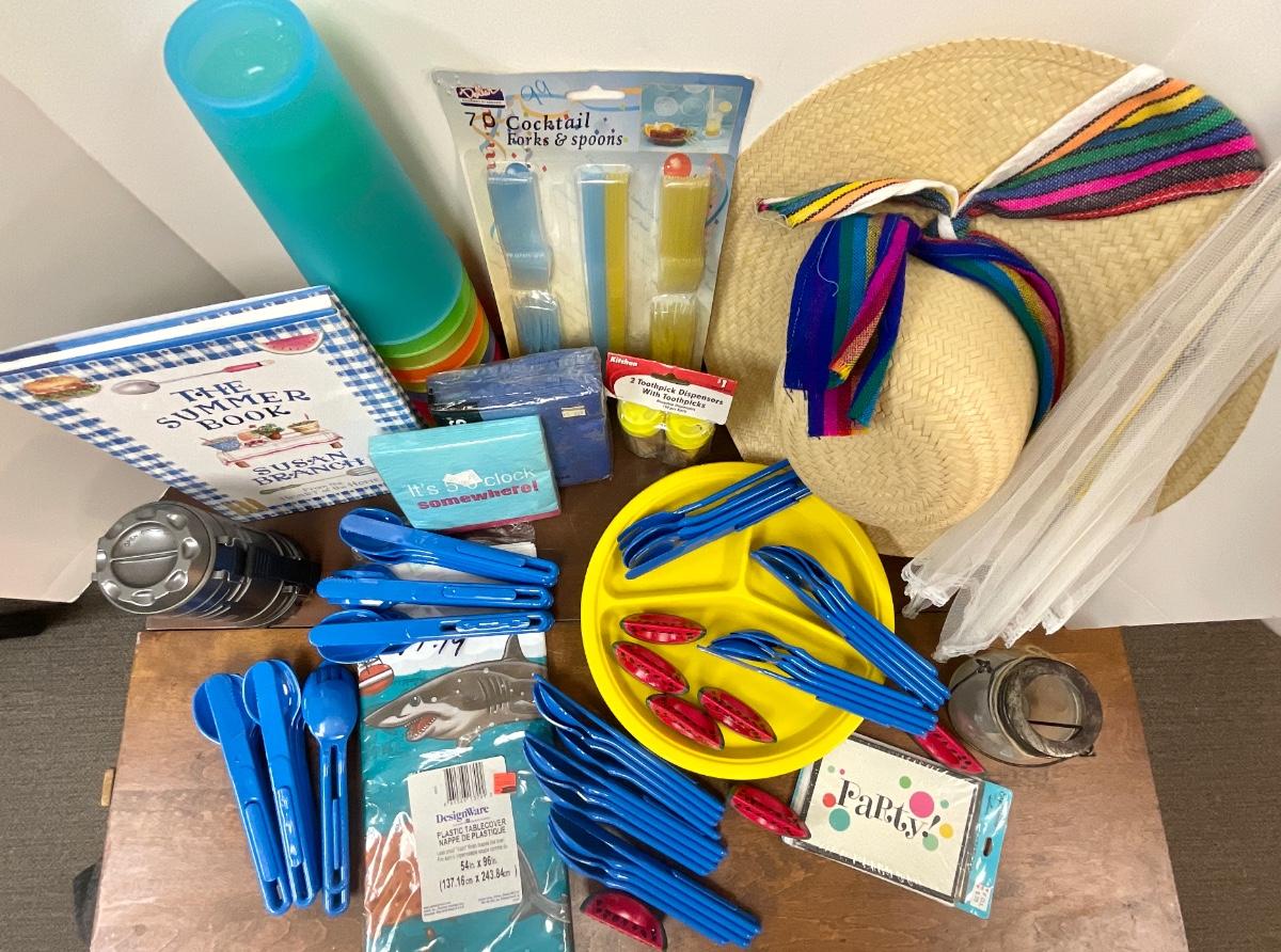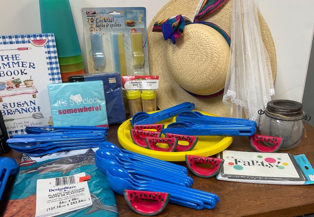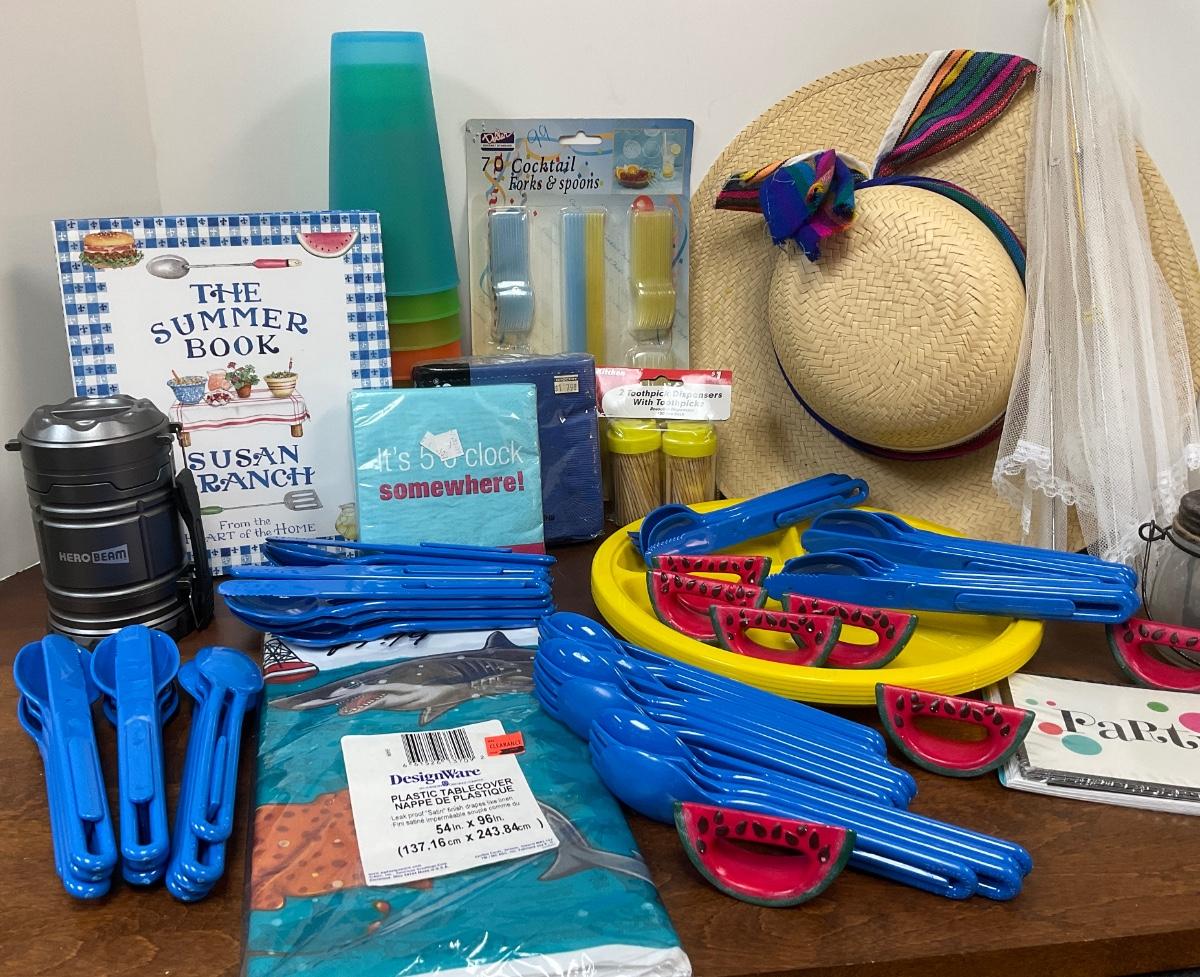 See picture for condition which ranges from good to new in package. Contains Straw hat with multicolored band, white lace umbrella for food, two toothpick dispensers, two packages of napkins, 1 vintage jar candle holder, 7 watermelon napkin rings, 1 plastic tablecloth (sharks), 1 Hero Beam flashlight, 1 set of plastic Cocktail forks & spoons, 12 plastic connecting utensil sets, 5 divided plastic yellow plates, 10 plastic tumblers, 8 party invitations in pkg, and “The Summer Book” .