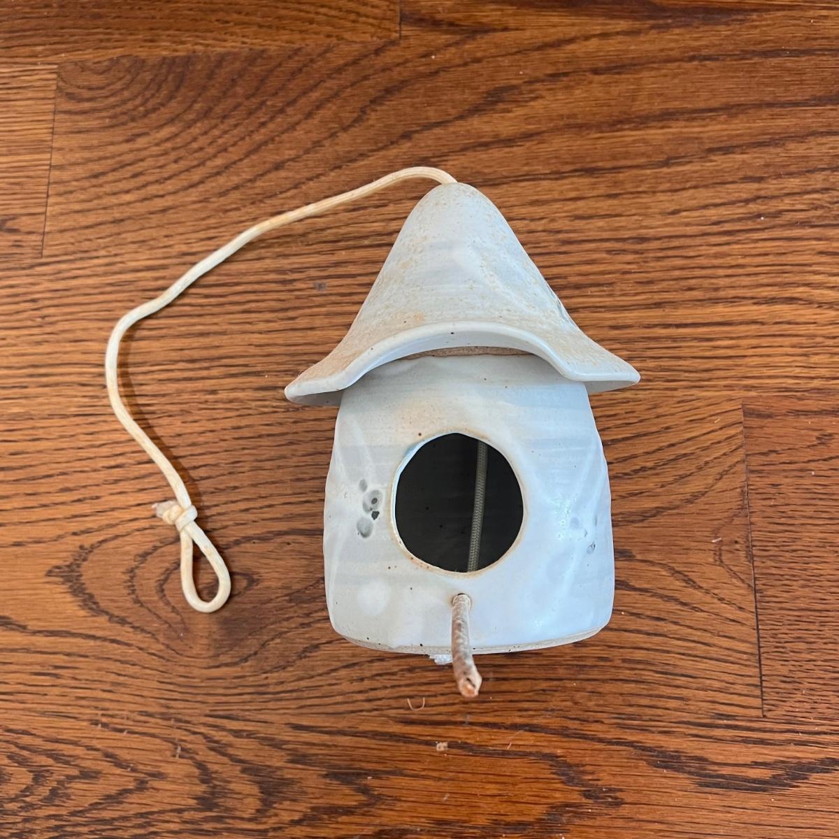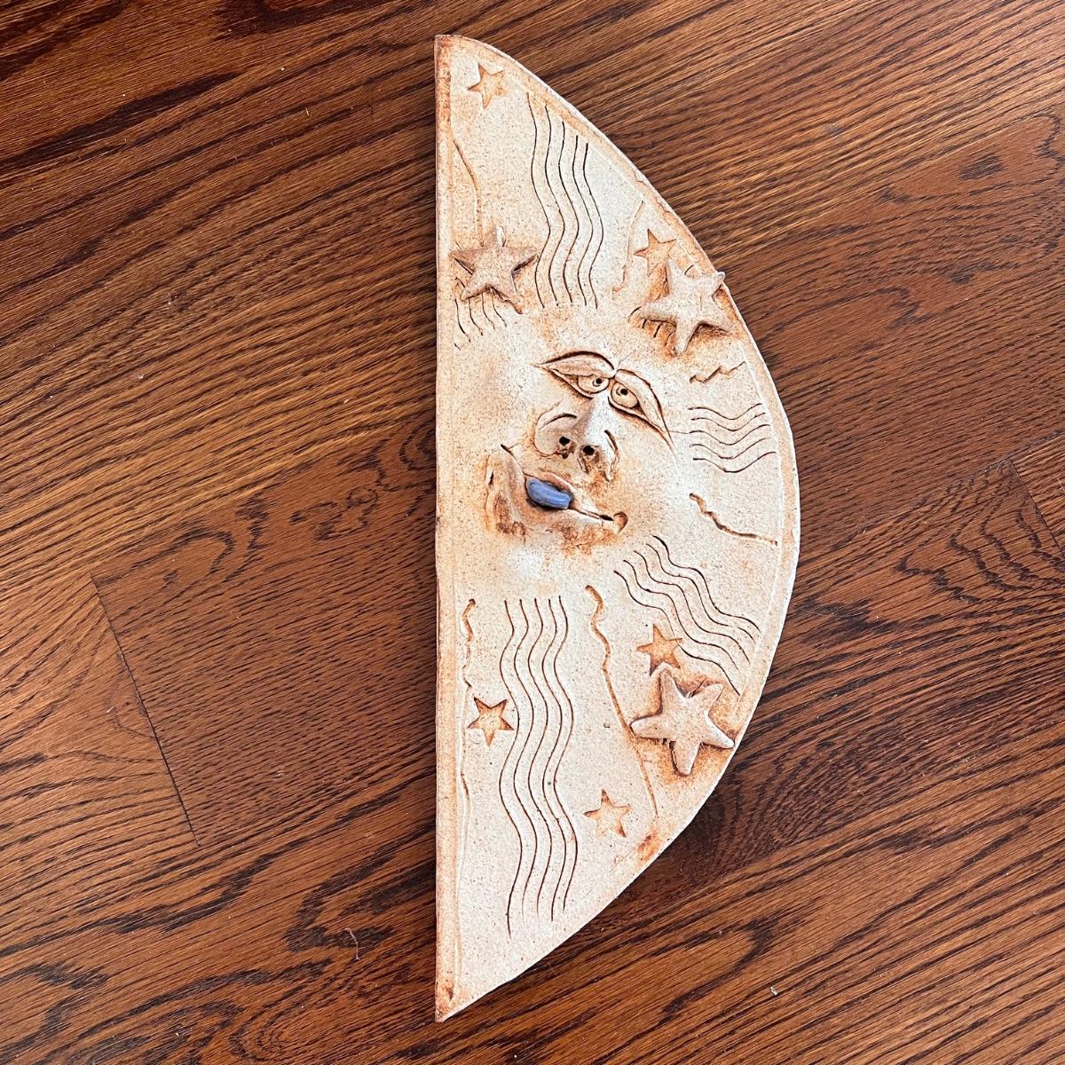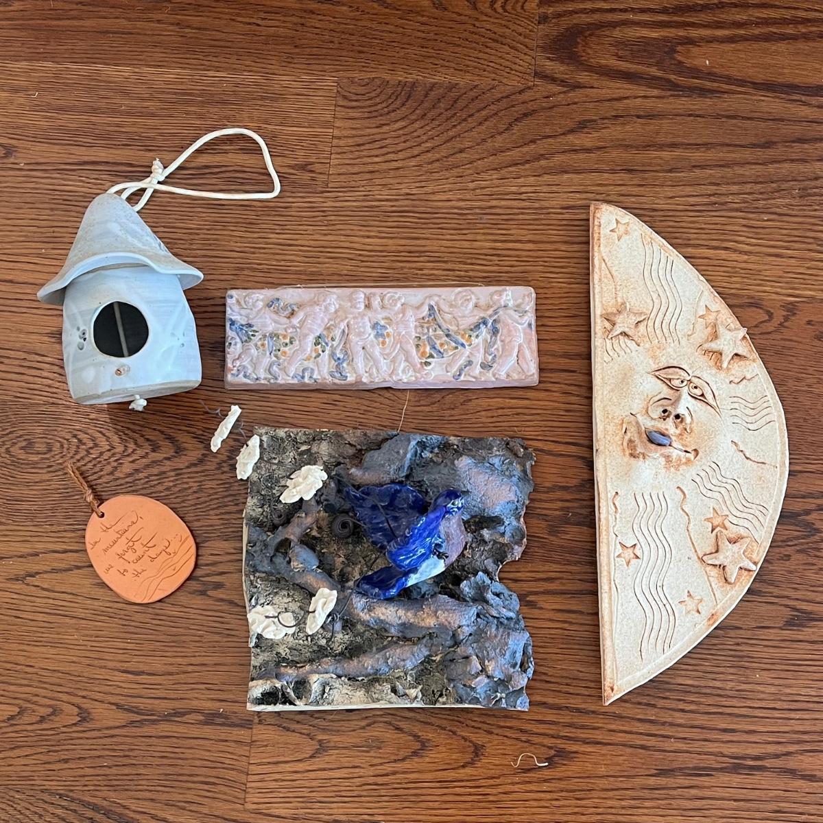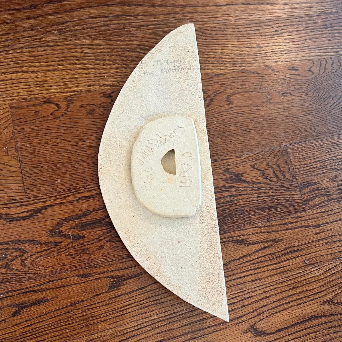 This lot includes five pieces of eclectic pottery in various sizes. The half moon appears to have the words “Mud Dabbers” engraved in the back, along with “‘06.” The moon measures 6” x 16”H. The rectangular cherub piece reads “Andreini” on the back. The circular clay piece reads “In the mountains, we forget to count the days.” Lastly, the bird house is signed with “Robin” on the back. Shipping available.