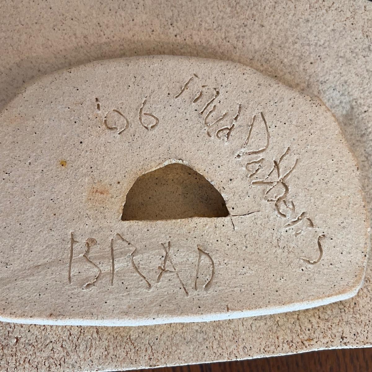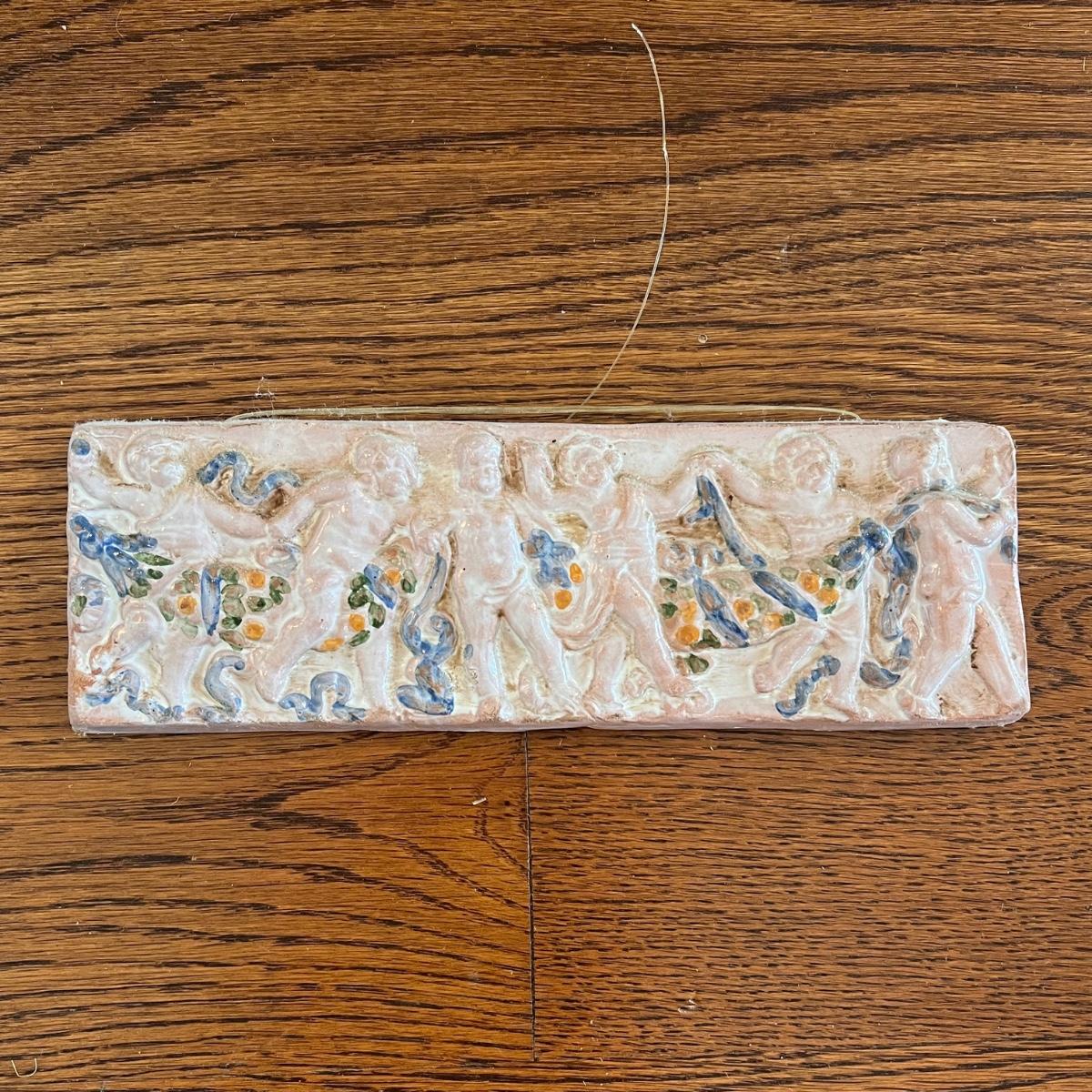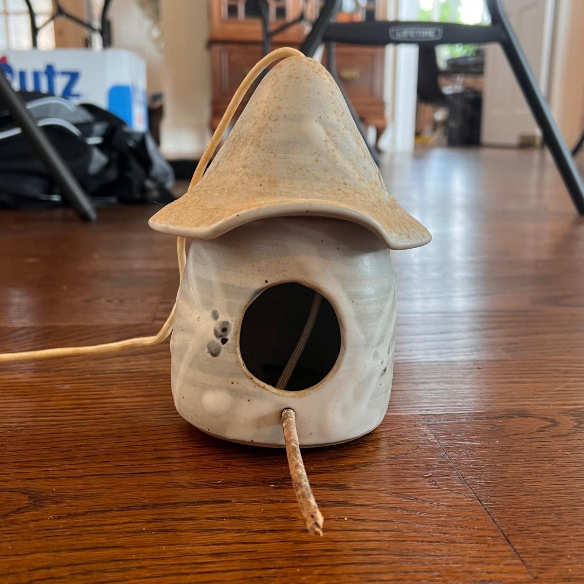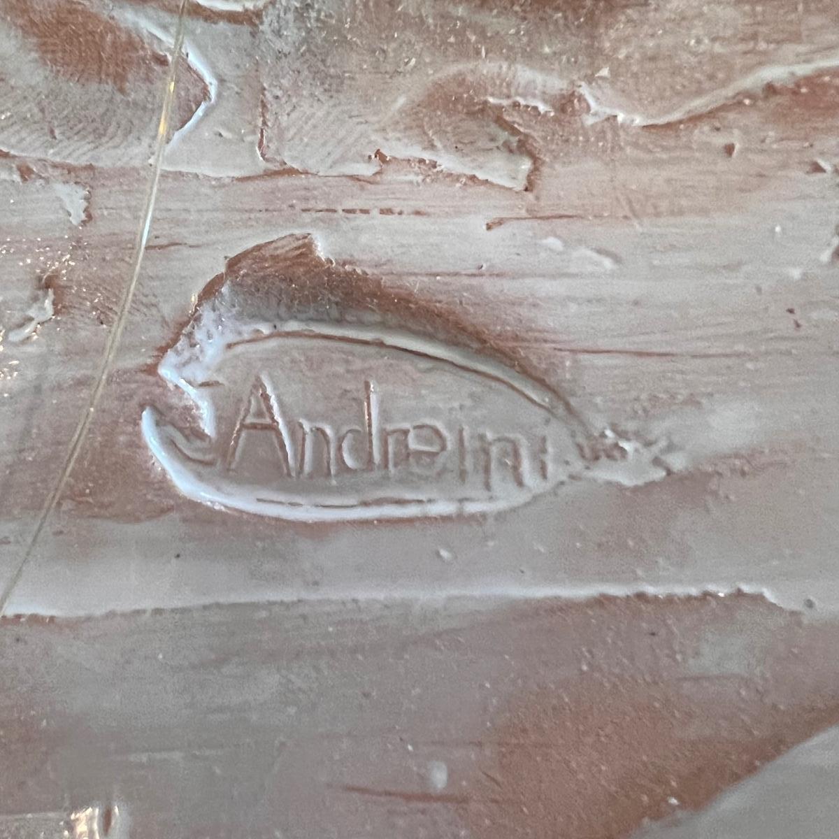 This lot includes five pieces of eclectic pottery in various sizes. The half moon appears to have the words “Mud Dabbers” engraved in the back, along with “‘06.” The moon measures 6” x 16”H. The rectangular cherub piece reads “Andreini” on the back. The circular clay piece reads “In the mountains, we forget to count the days.” Lastly, the bird house is signed with “Robin” on the back. Shipping available.