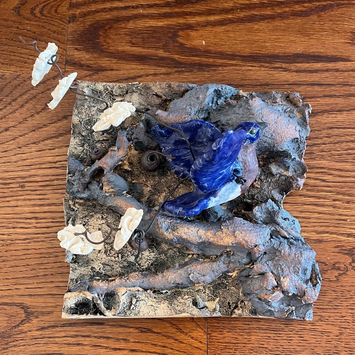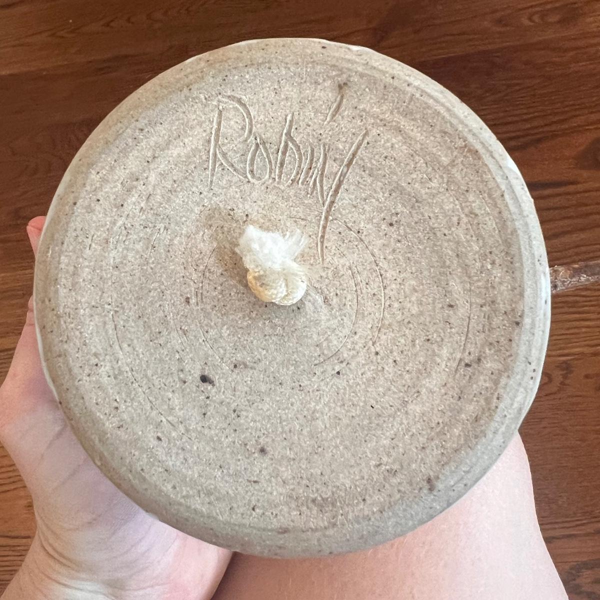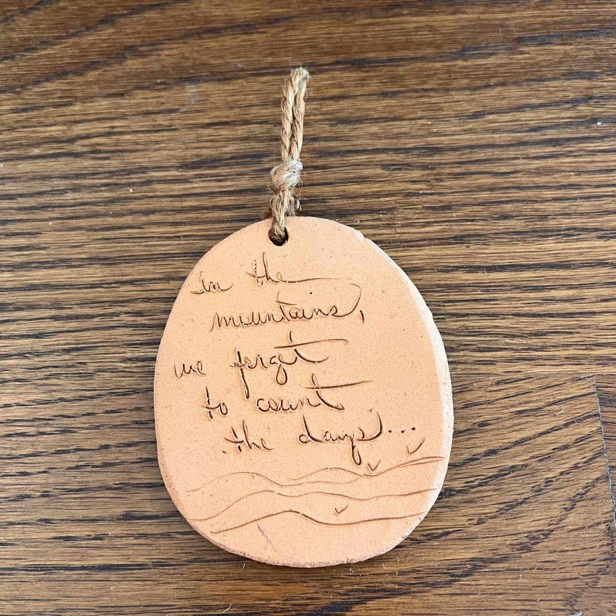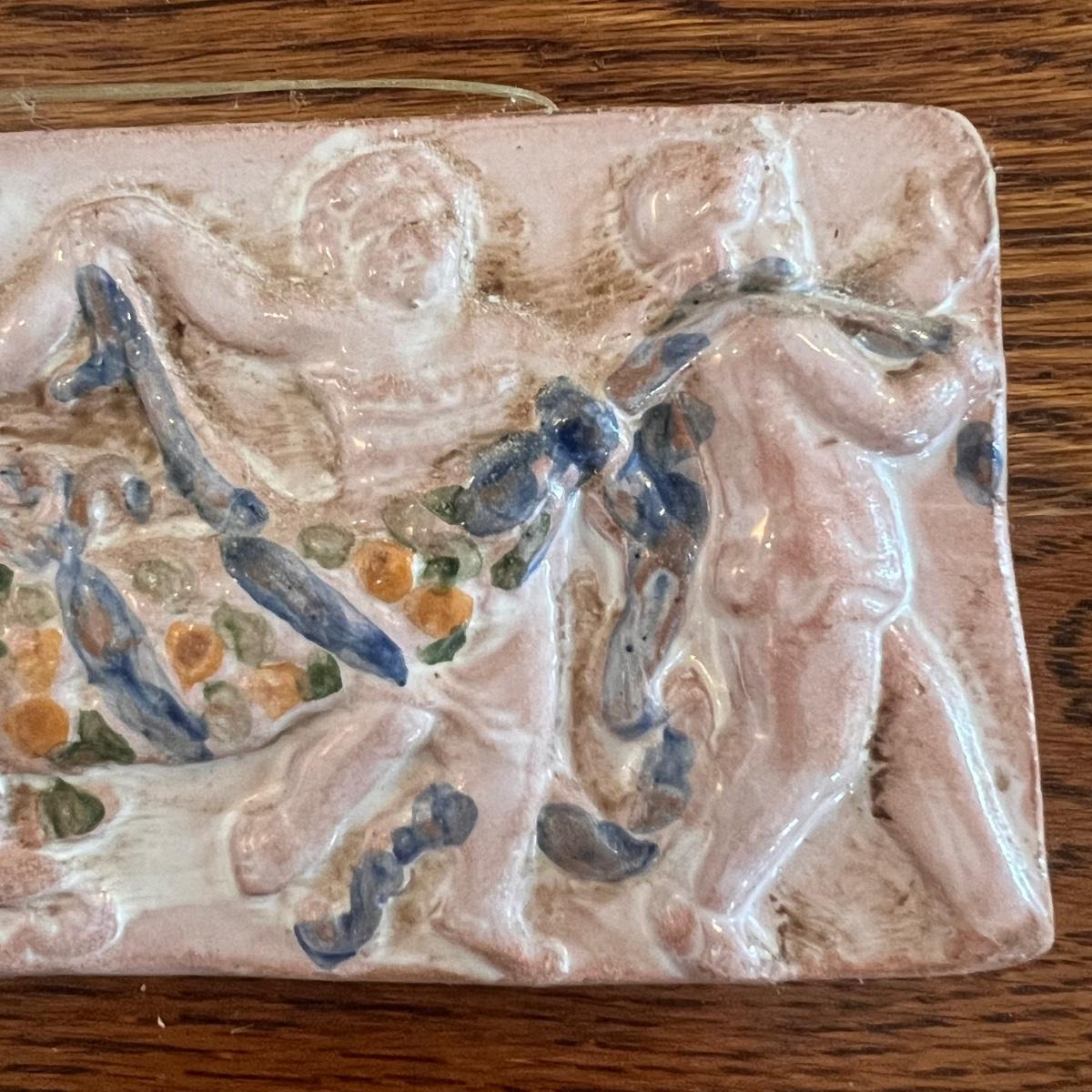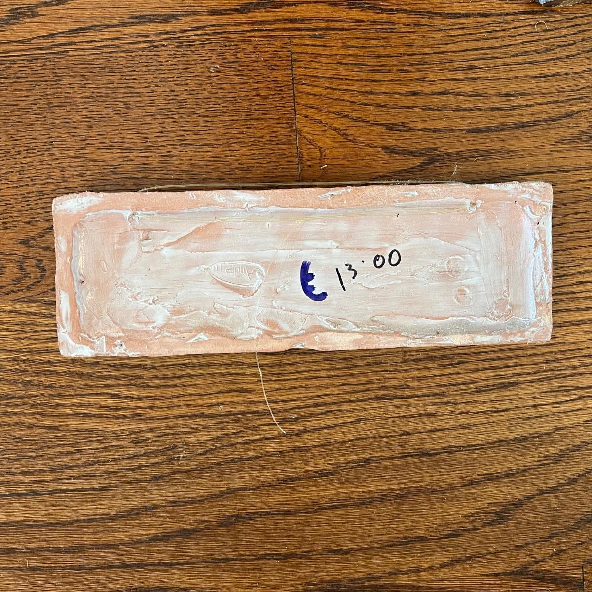 This lot includes five pieces of eclectic pottery in various sizes. The half moon appears to have the words “Mud Dabbers” engraved in the back, along with “‘06.” The moon measures 6” x 16”H. The rectangular cherub piece reads “Andreini” on the back. The circular clay piece reads “In the mountains, we forget to count the days.” Lastly, the bird house is signed with “Robin” on the back. Shipping available.