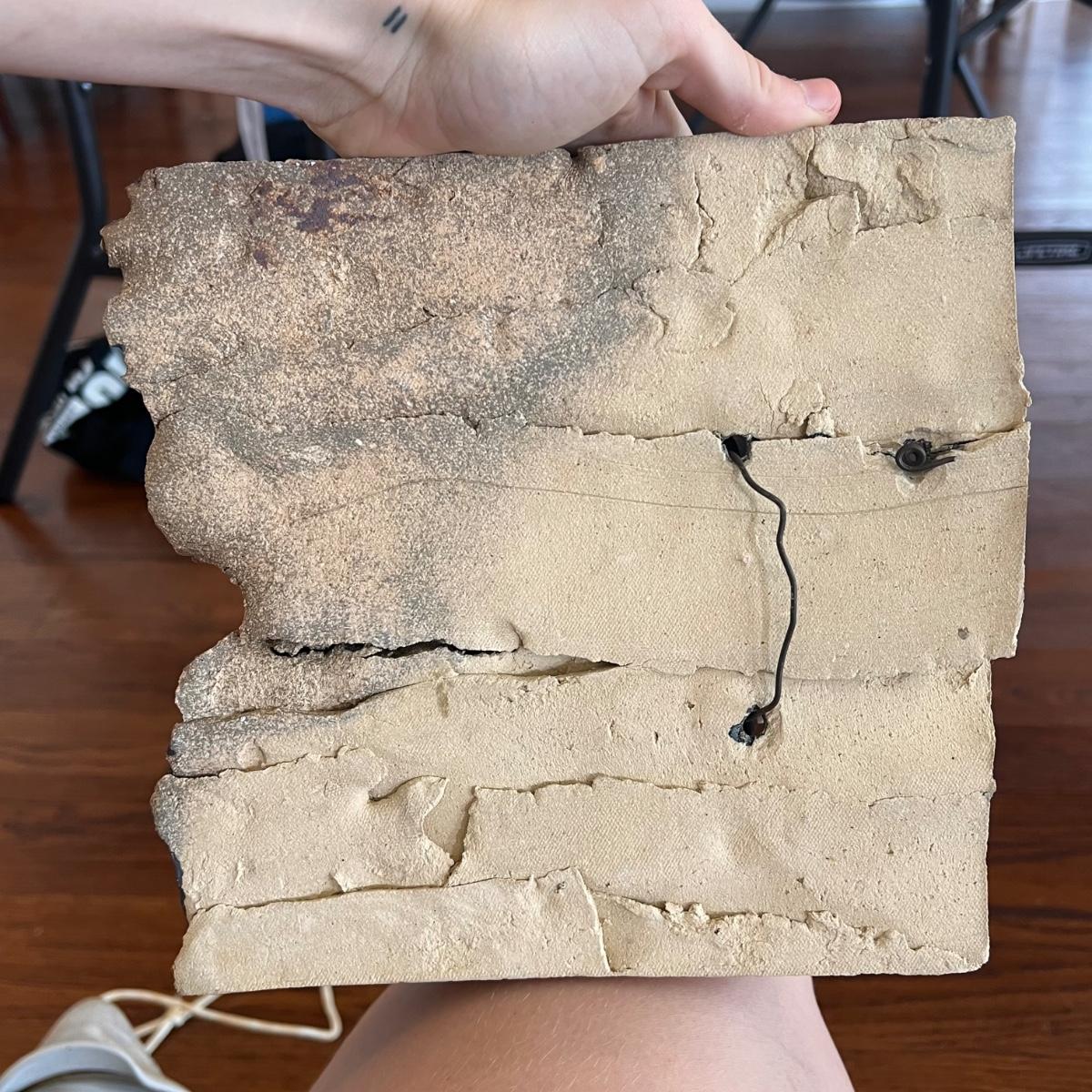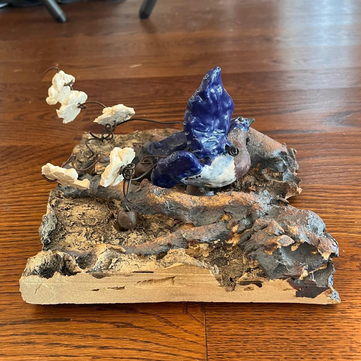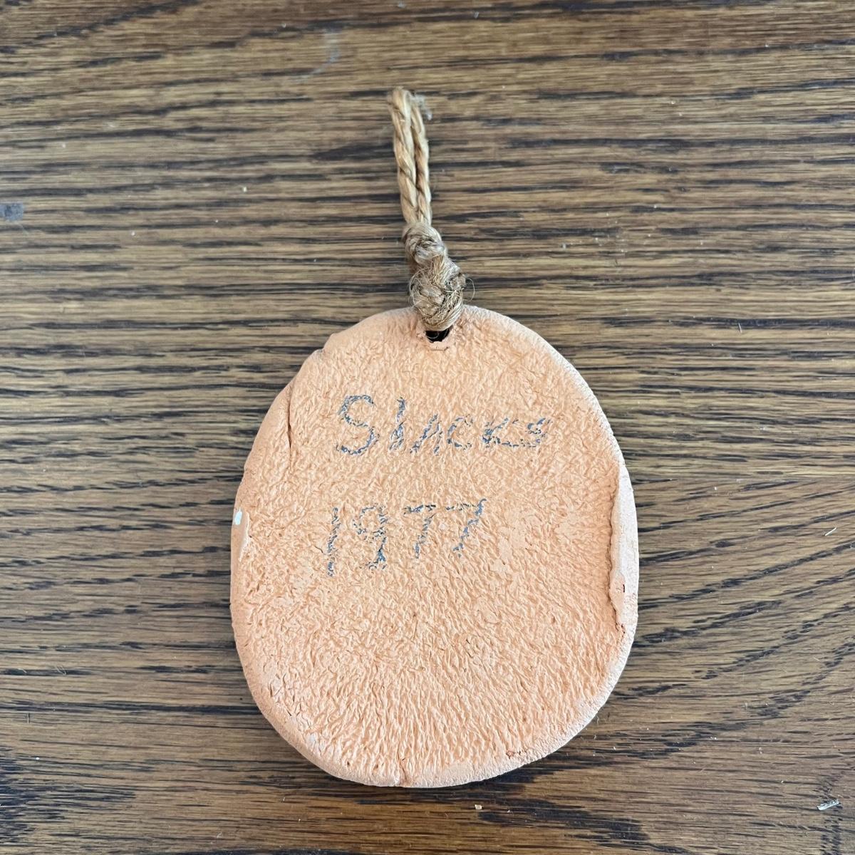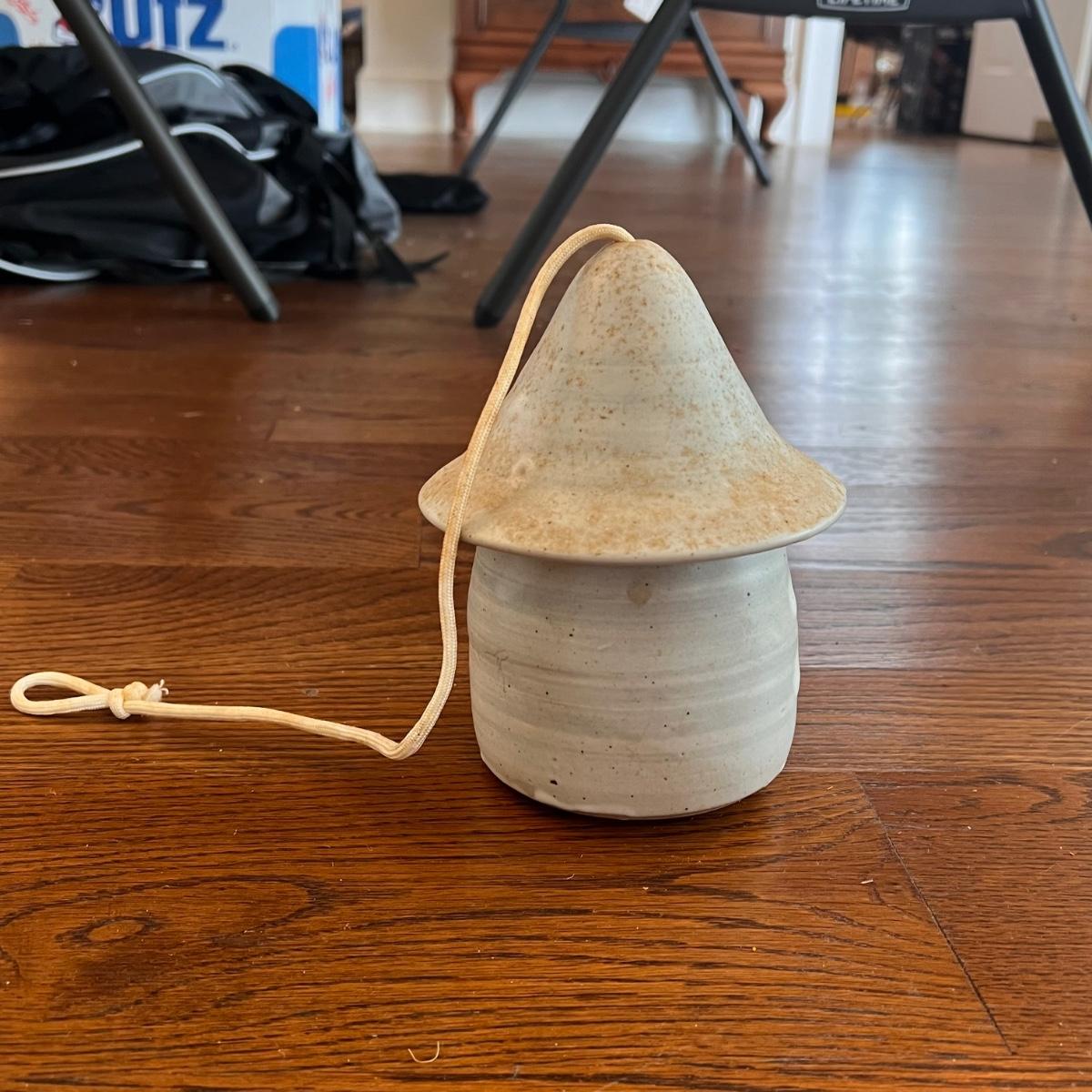 This lot includes five pieces of eclectic pottery in various sizes. The half moon appears to have the words “Mud Dabbers” engraved in the back, along with “‘06.” The moon measures 6” x 16”H. The rectangular cherub piece reads “Andreini” on the back. The circular clay piece reads “In the mountains, we forget to count the days.” Lastly, the bird house is signed with “Robin” on the back. Shipping available.