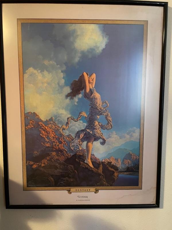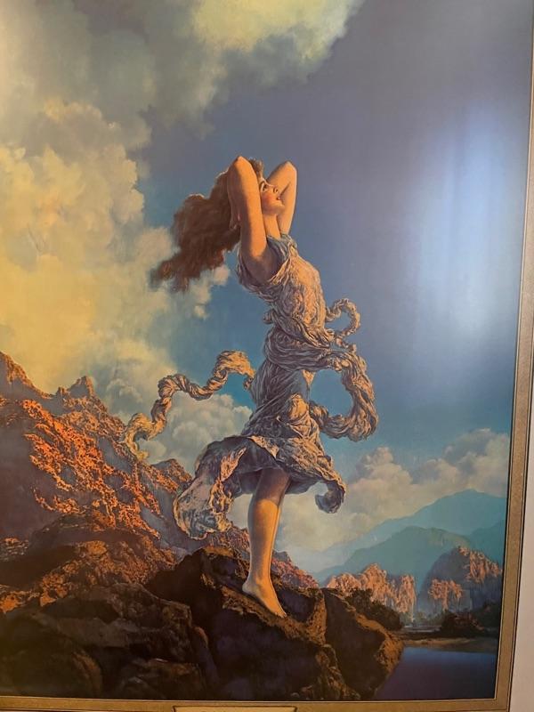 Happy woman on sunny cliff looking pleased with herself. 32” x 25” This is a Maxfield Parrish poster