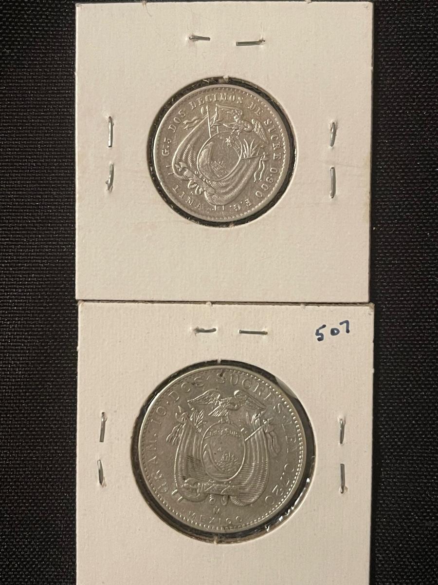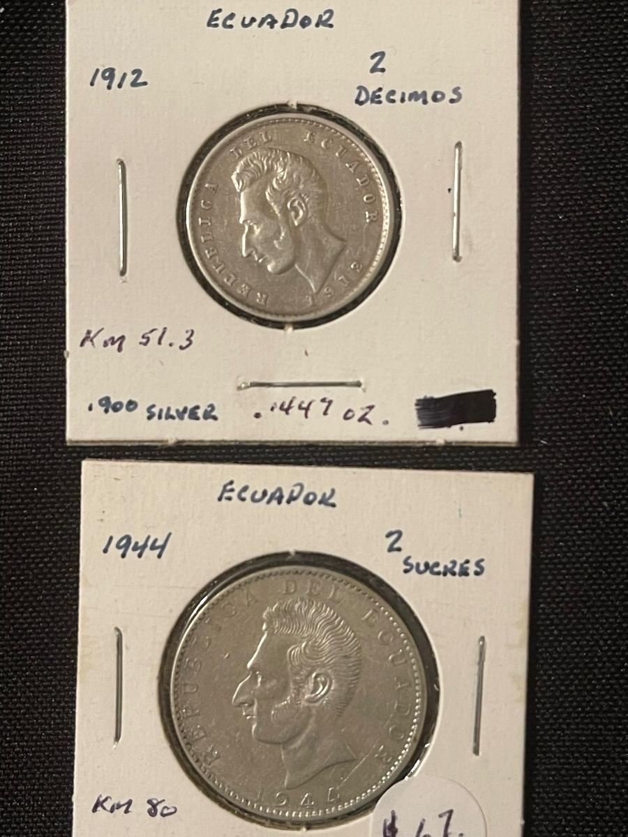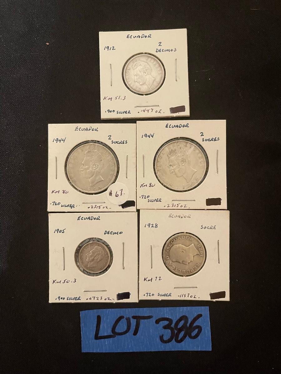 (5) Ecuador Silver Coins-1912 2 decimos, 1944 2 sucres, 1944 2 sucres, 1905 decimos, 1928 sucre.