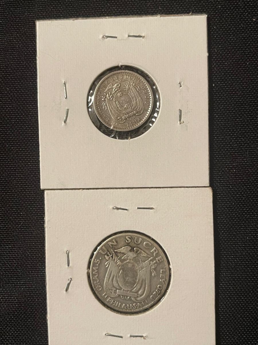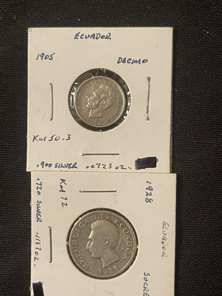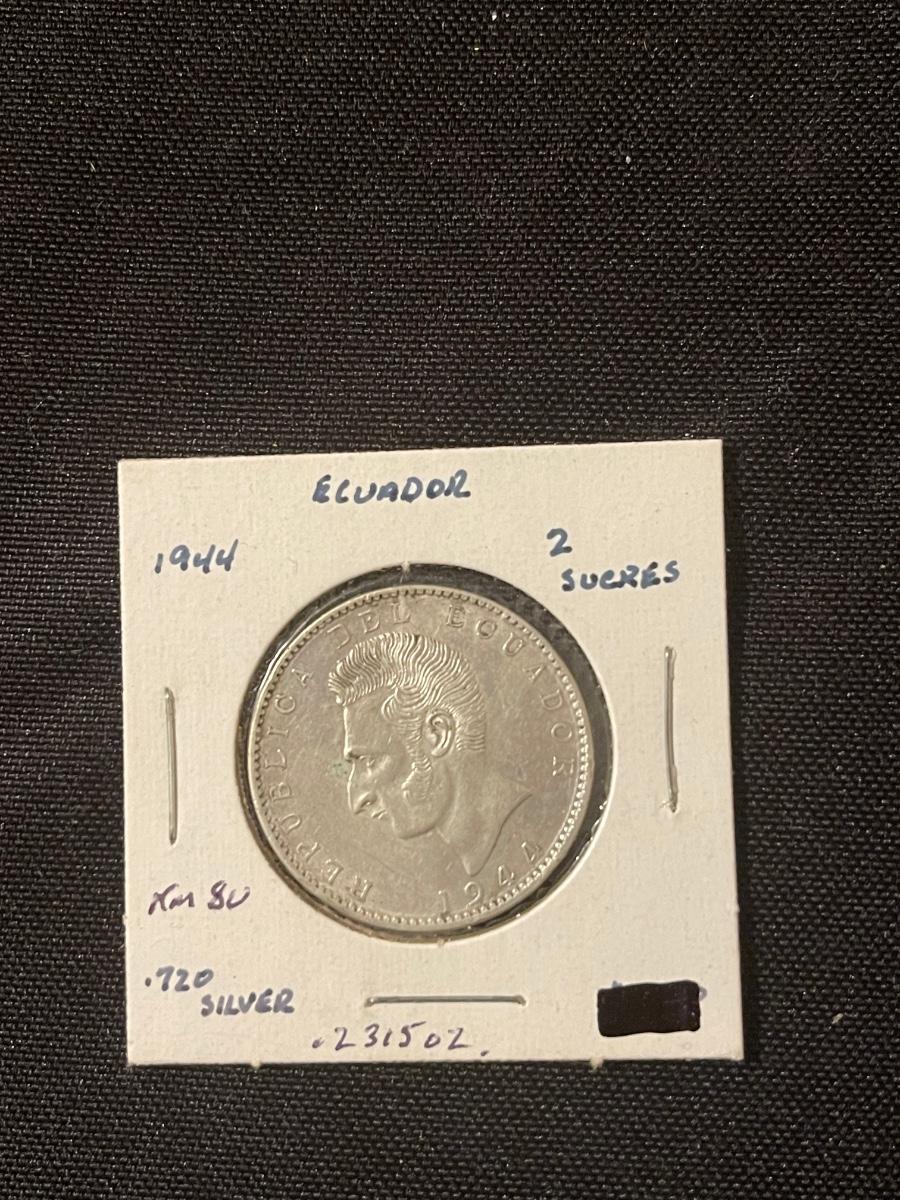 (5) Ecuador Silver Coins-1912 2 decimos, 1944 2 sucres, 1944 2 sucres, 1905 decimos, 1928 sucre.