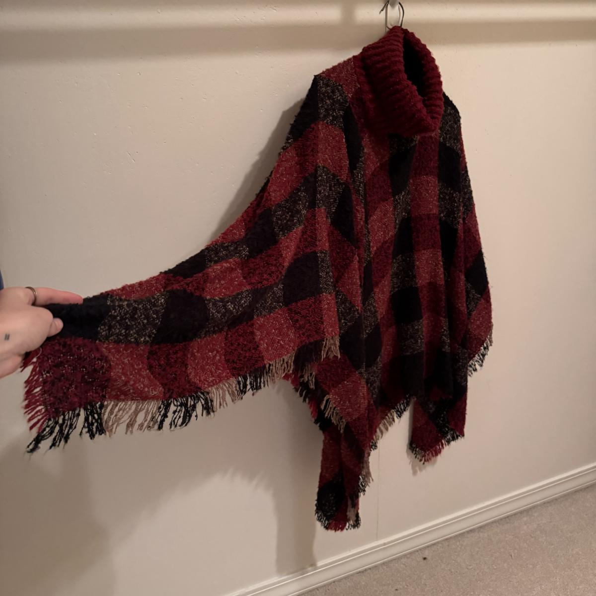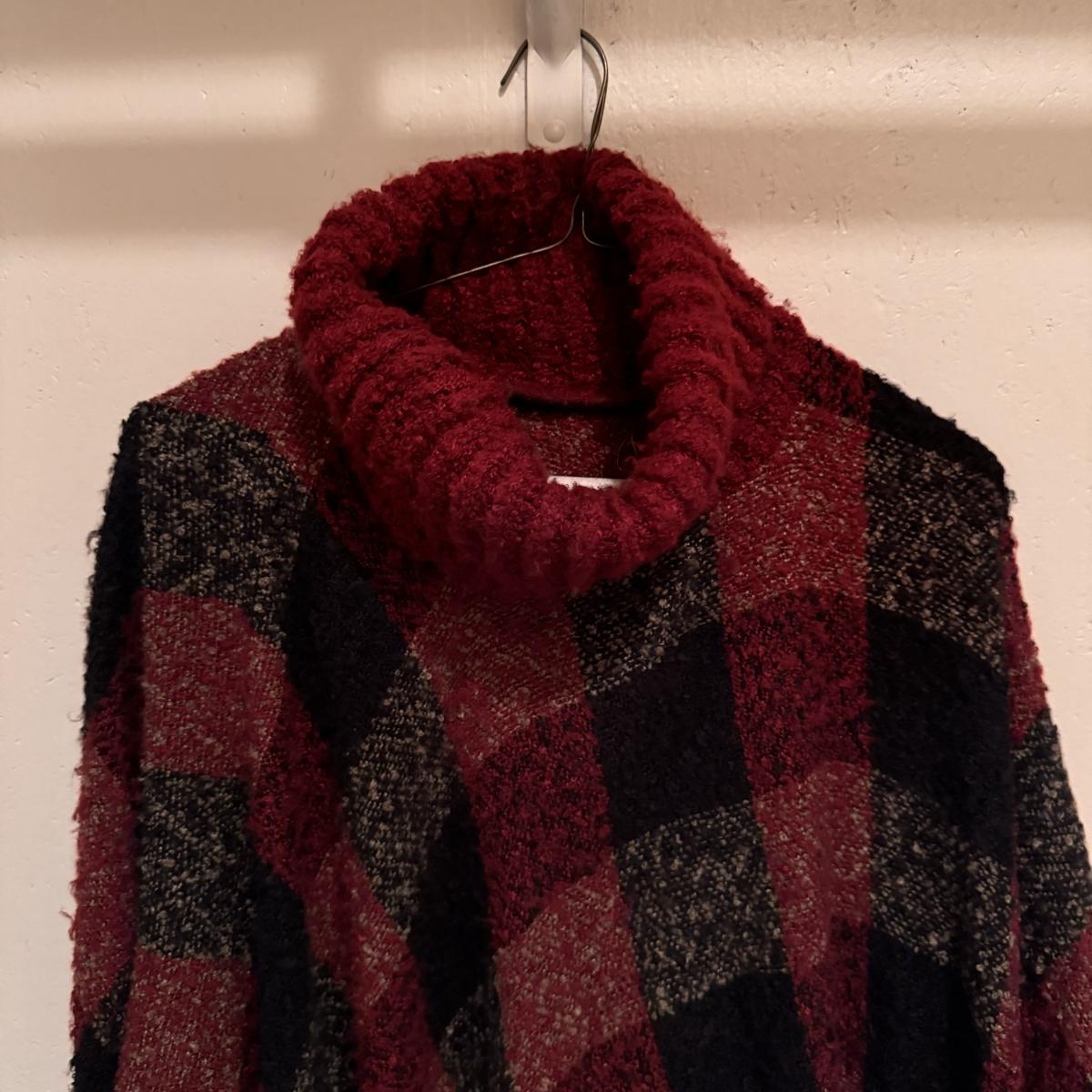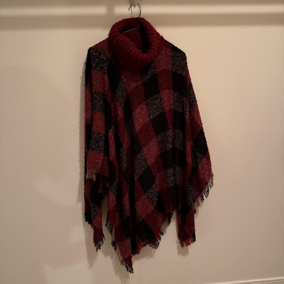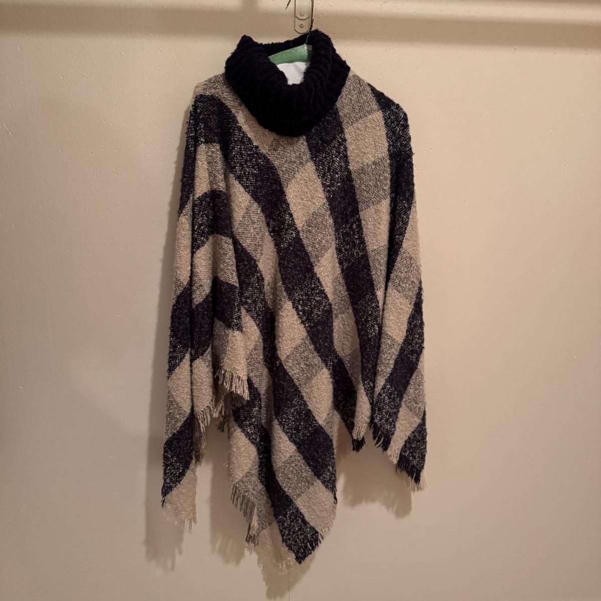 This lot includes two very soft plaid ponchos that appear to be one size fits all, one red sweater with a big collar and no labels, one purple sweater by Pat Larson, one Eddie Bauer sweater - size petite medium, one light blue sweater with no labels, one green sweater by Acorn - size medium, one sparkly grey sweater by Bloomingdale’s - size medium, one colorful sweater by Lauren Hansen - size small, and one abstract design sweater by Koret Petites - size small. All sweaters appear to be in good condition. Shipping available.