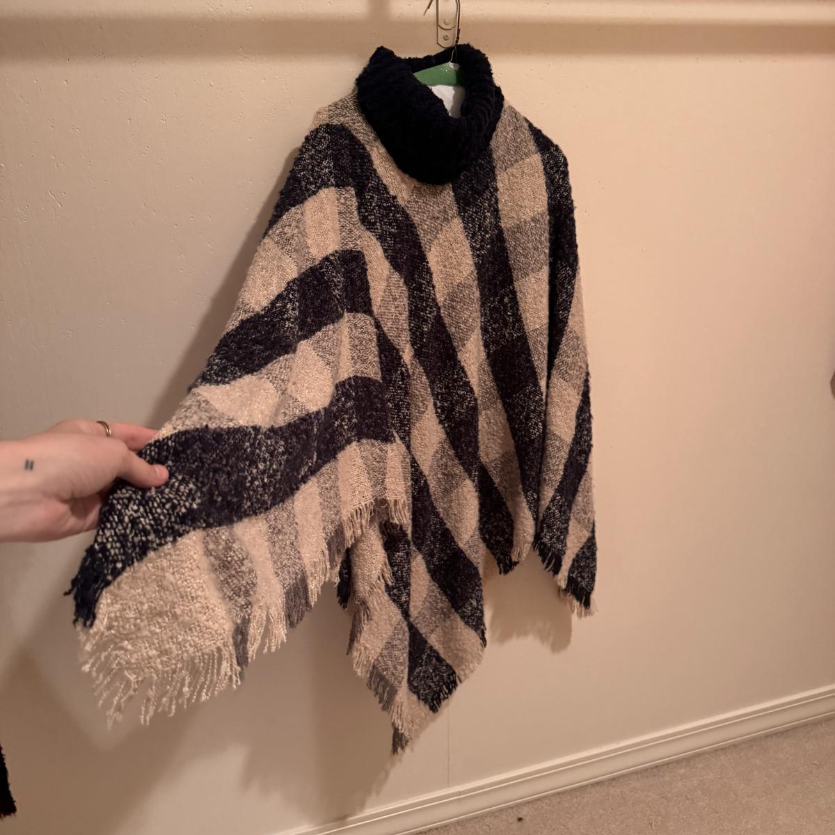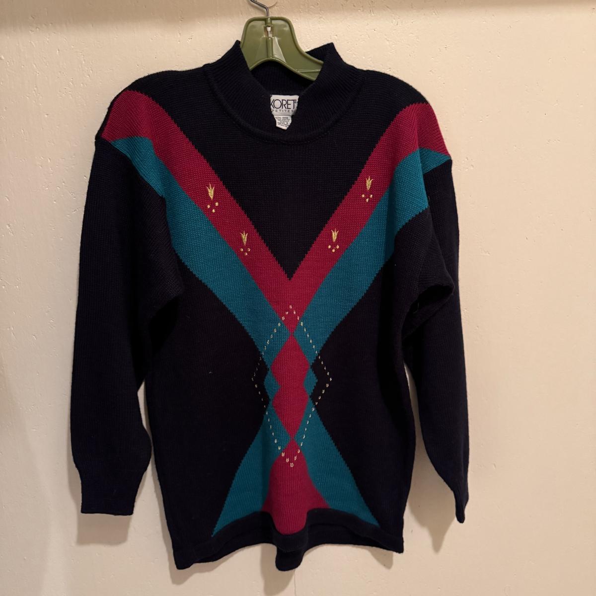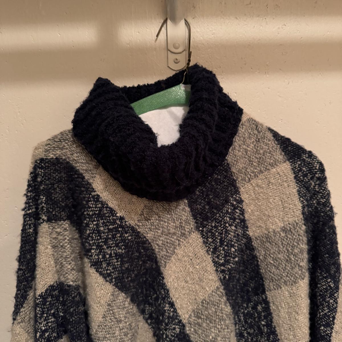 This lot includes two very soft plaid ponchos that appear to be one size fits all, one red sweater with a big collar and no labels, one purple sweater by Pat Larson, one Eddie Bauer sweater - size petite medium, one light blue sweater with no labels, one green sweater by Acorn - size medium, one sparkly grey sweater by Bloomingdale’s - size medium, one colorful sweater by Lauren Hansen - size small, and one abstract design sweater by Koret Petites - size small. All sweaters appear to be in good condition. Shipping available.