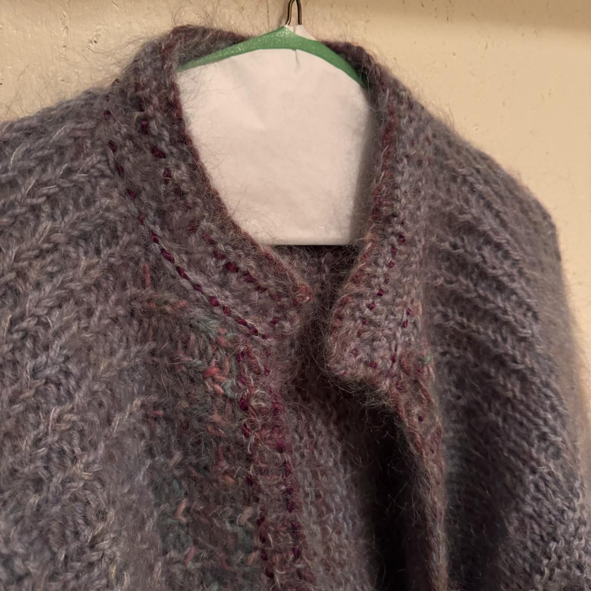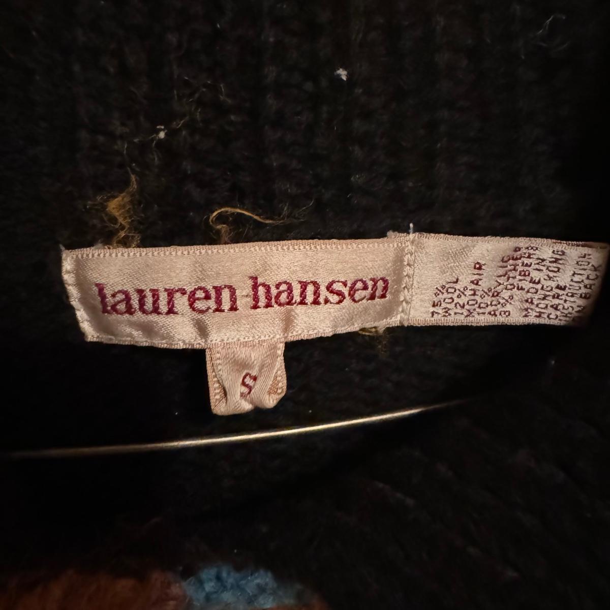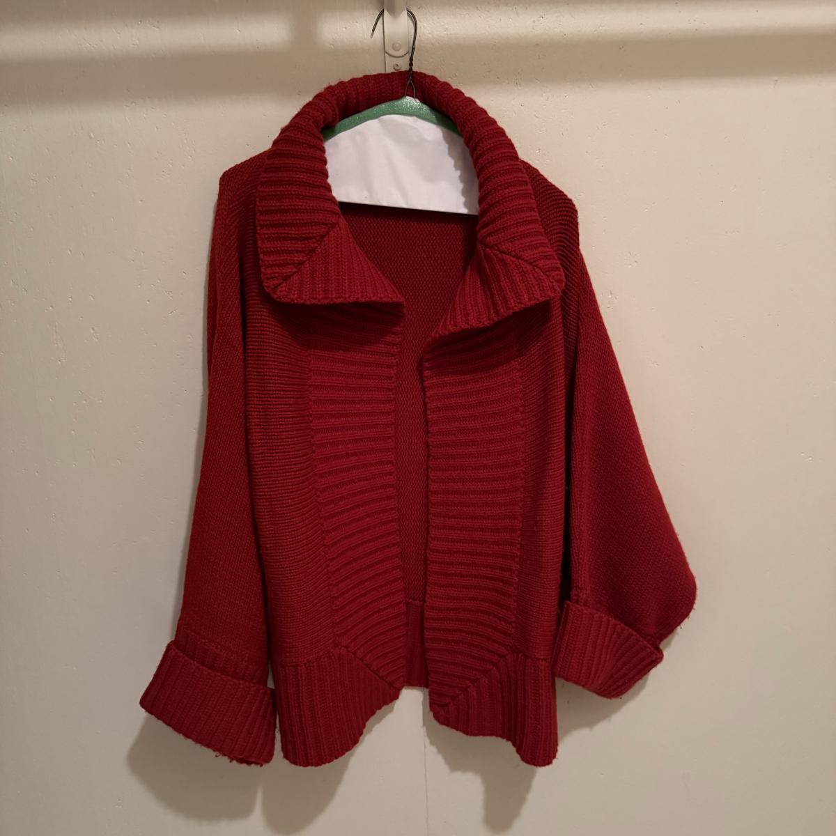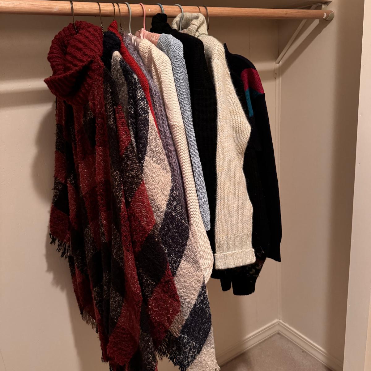 This lot includes two very soft plaid ponchos that appear to be one size fits all, one red sweater with a big collar and no labels, one purple sweater by Pat Larson, one Eddie Bauer sweater - size petite medium, one light blue sweater with no labels, one green sweater by Acorn - size medium, one sparkly grey sweater by Bloomingdale’s - size medium, one colorful sweater by Lauren Hansen - size small, and one abstract design sweater by Koret Petites - size small. All sweaters appear to be in good condition. Shipping available.