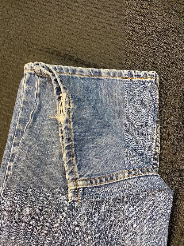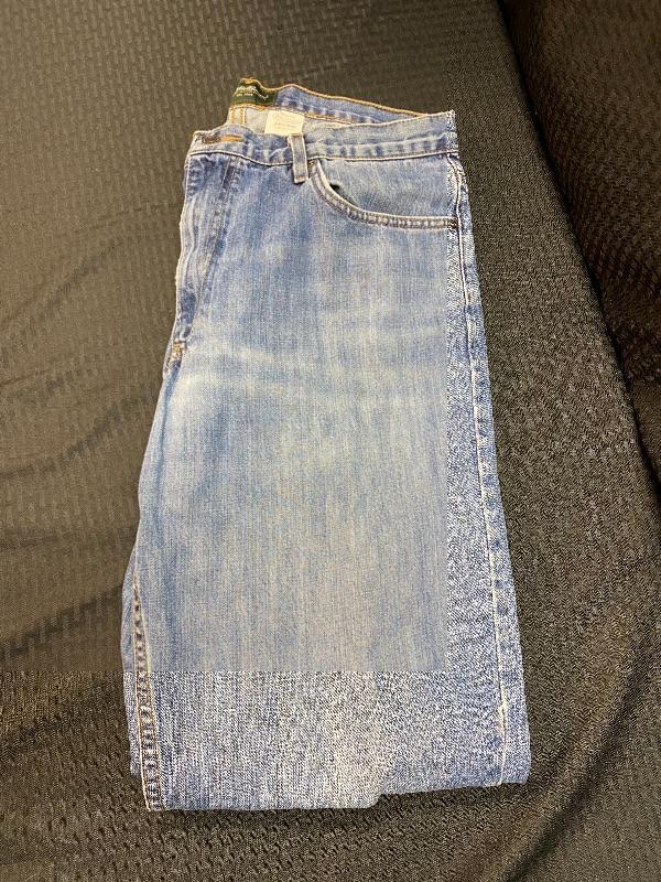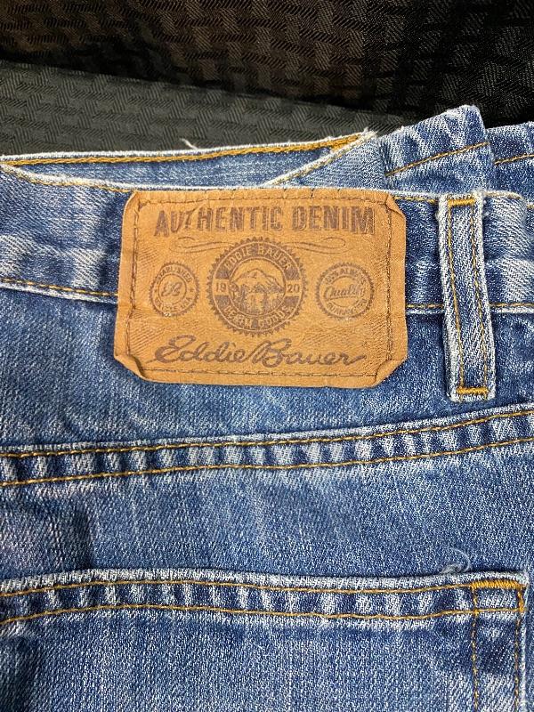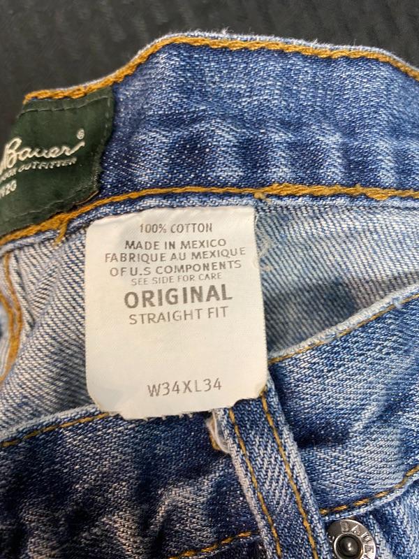 Eddie Bauer blue denim jeans. Faded wash. Original Straight fit. Size 34x34. Frayed hem on the bottom back of one leg.