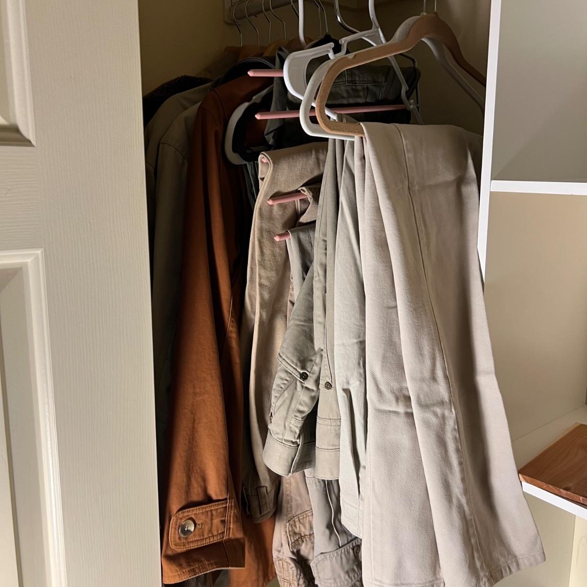 Nine pairs of mostly cargo style pants and six barn style jackets with great brand names. Sizes vary, see images for size and brand names.
