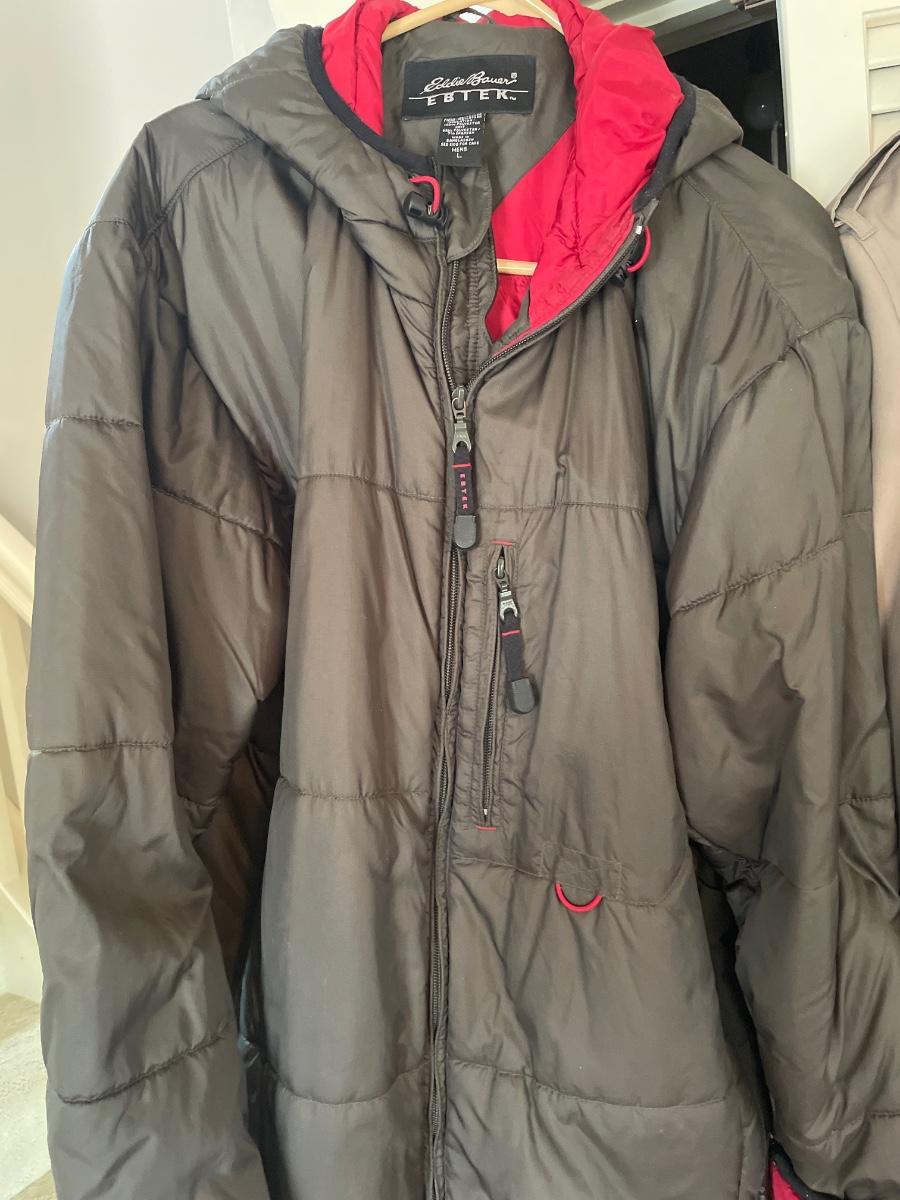 London Fog 42 L trench coat. Eddie Bauer M men’s quilted, hooded jackets.