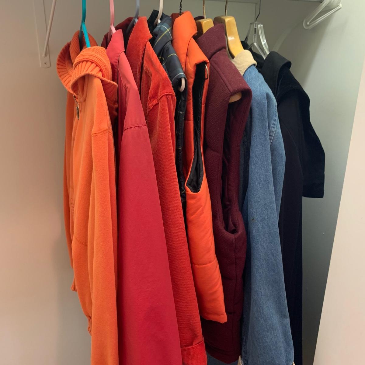 Eight total items of ladies outerwear. There are three jackets, three vests, and two coats. The two long coats have removable liners, and the black one has a removable hood with velour lining. Please see photos for inventory and sizes.