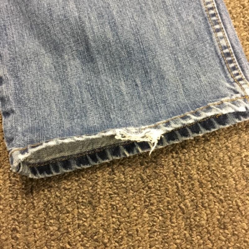 Jeans are well worn-in. There is a rip on the bottom cuff on one of the legs; see pictures.