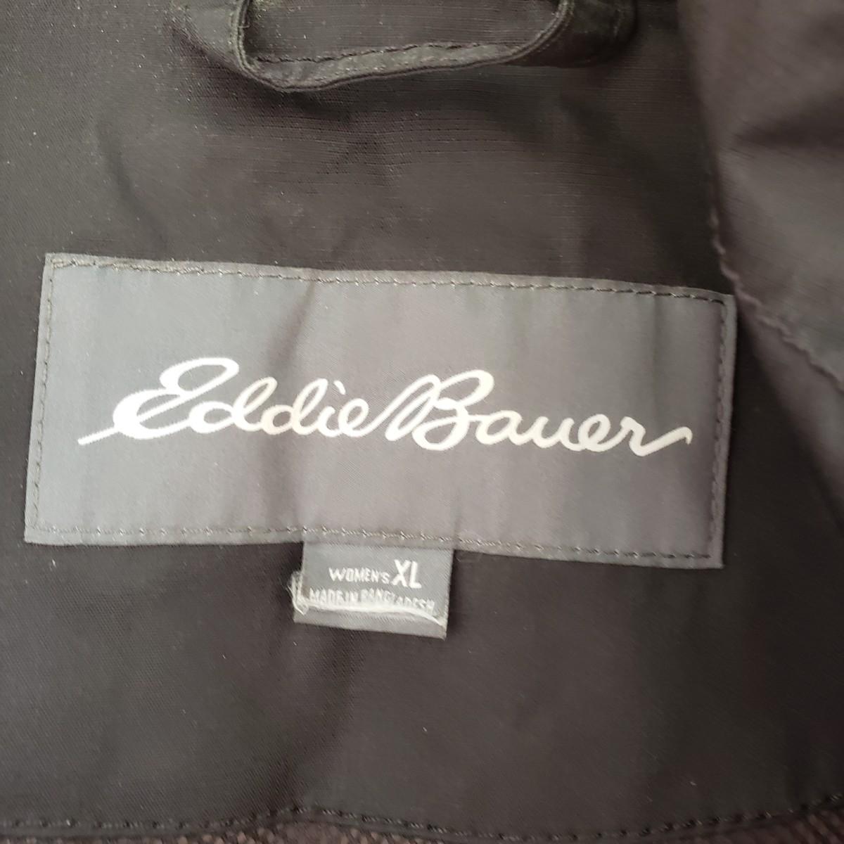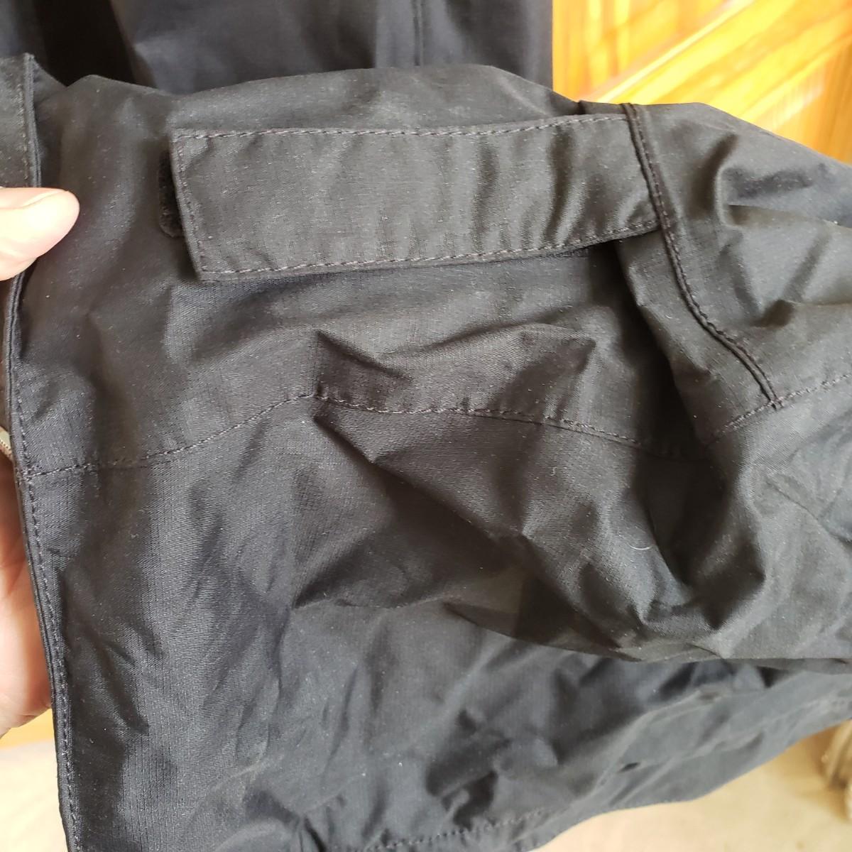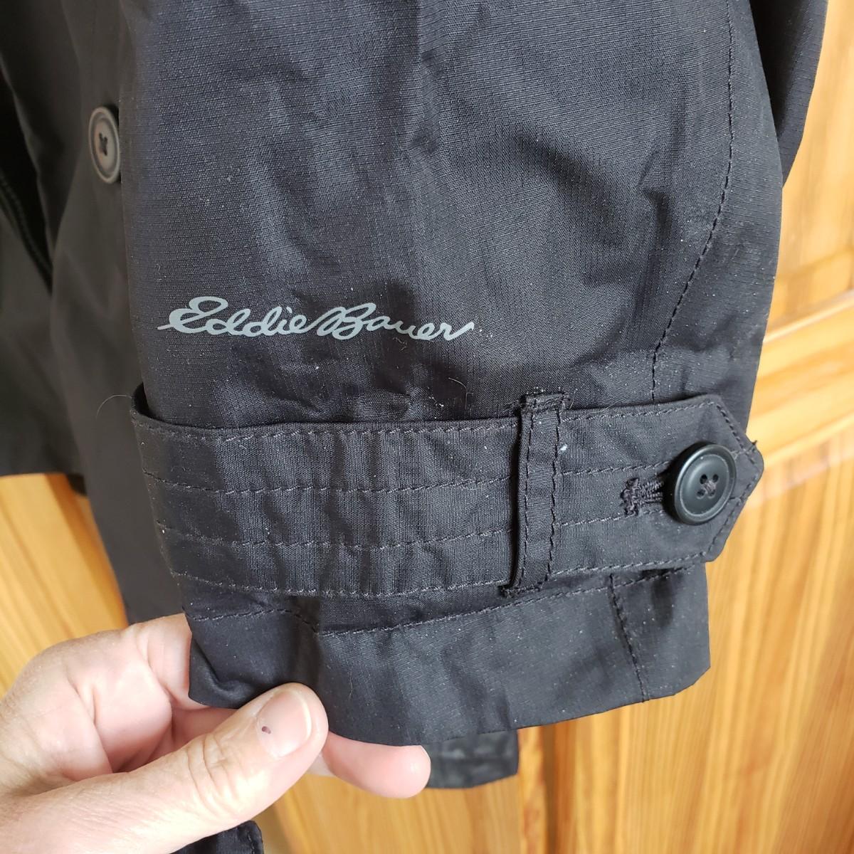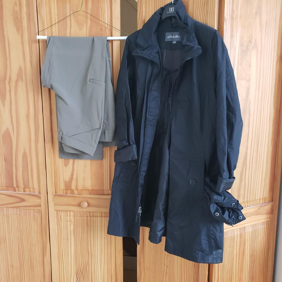 This Eddie Bauer lot features a black raincoat with removable, adjustable hood. The waist tie is missing. The new women's pants have a quick dry feature. The pants can be buttoned up from the legs. See pictures for details.