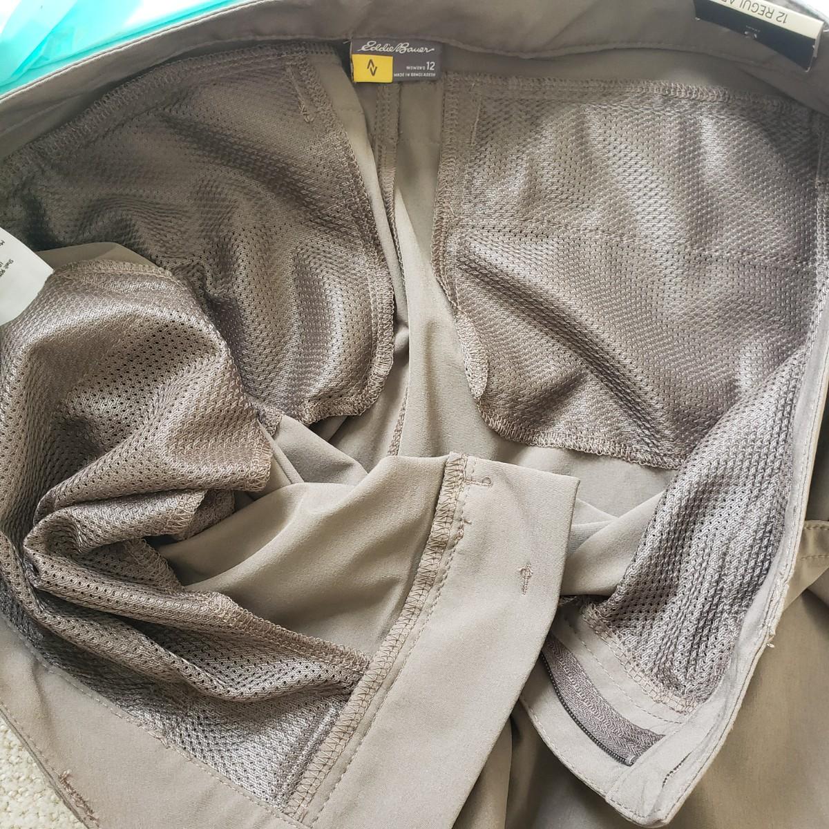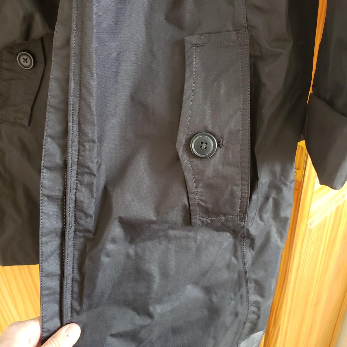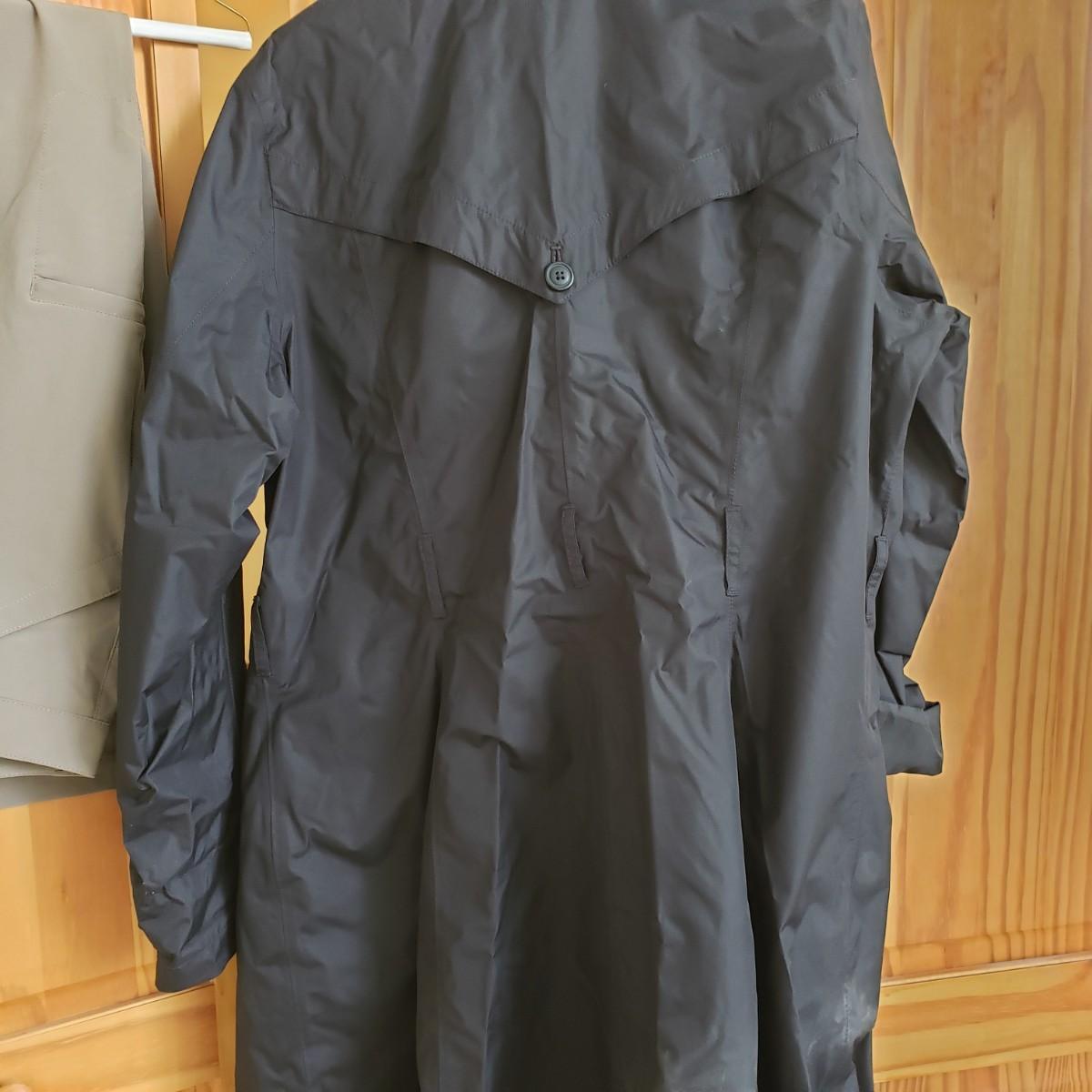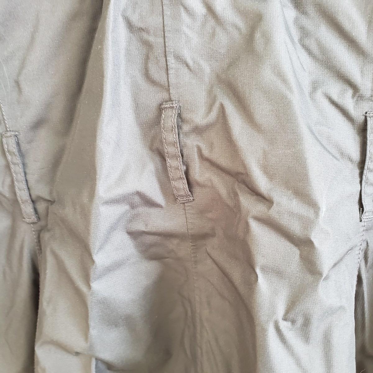This Eddie Bauer lot features a black raincoat with removable, adjustable hood. The waist tie is missing. The new women's pants have a quick dry feature. The pants can be buttoned up from the legs. See pictures for details.