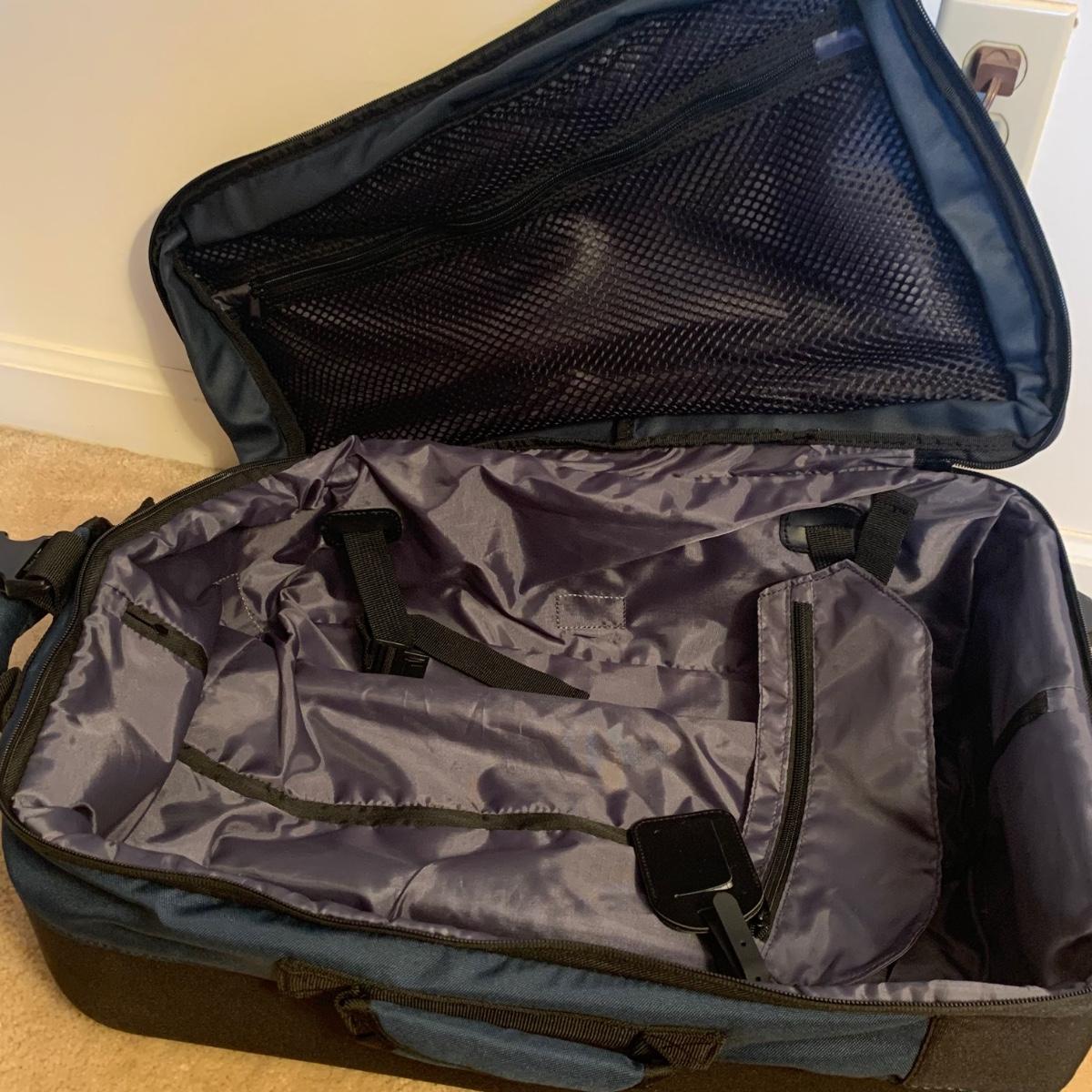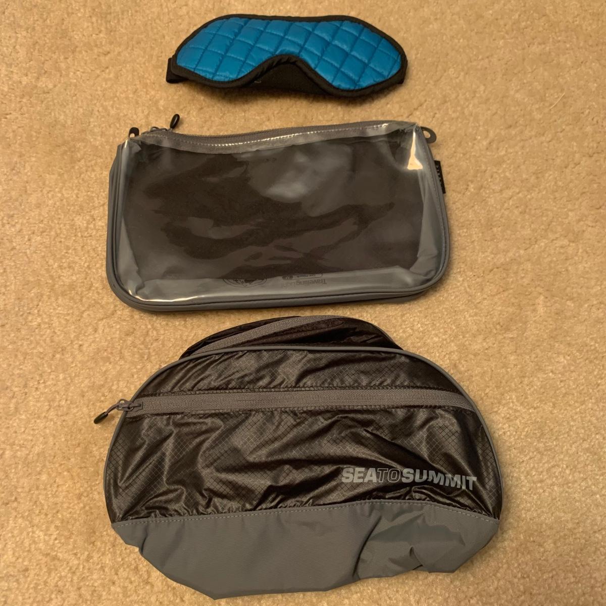 A great selection of travel bags and accessories! Included are two pieces of blue Rick Steves brand luggage, a hanging Eddie Bauer toiletry kit, a Wilderness Experience fanny pack, two small Sea to Summit pouches, and a Pacsafe passport pouch. Also included is an Eddie Bauer WeatherEdge hat, six pairs of brand new Exofficio travel underwear (men’s size L briefs), multiple adapters, compression packing bags, compact umbrella, travel pillow, eye mask, and travel laundry soap. The Flat Pack Packing System has been opened, but all three packs are inside. All other items appear to be unused or very gently used. Larger Rick Steves suitcase is expandable; measures approximately 14” x 8” x 21”H. All items fit inside this suitcase!