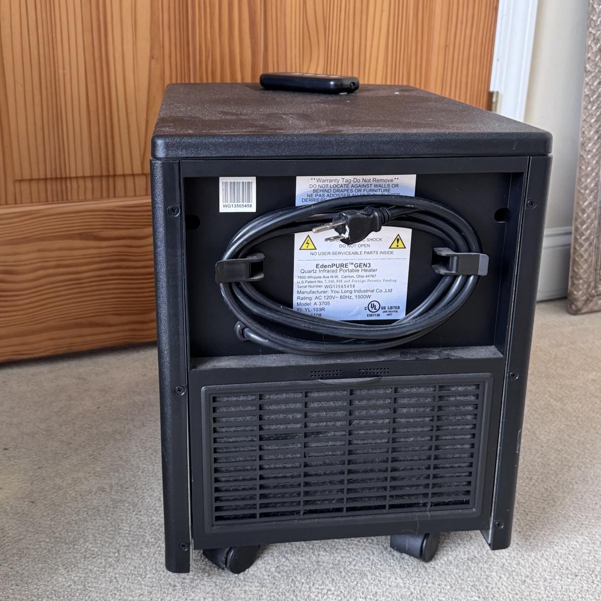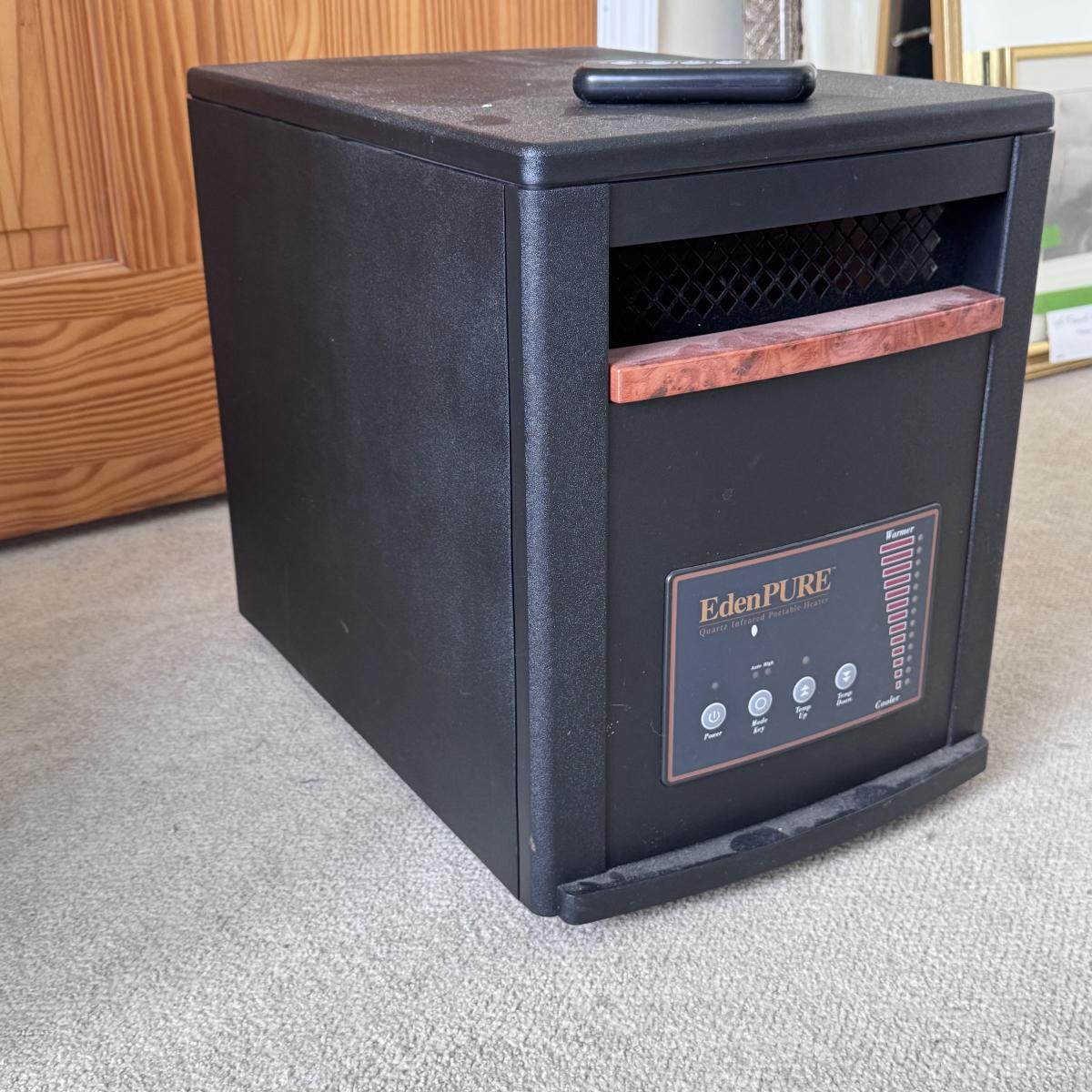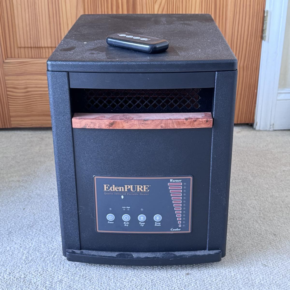Lot includes one EdenPURE infrared heater that comes with its original remote. The model number for this product is A 3705. The heater powered on when plugged in. It measures 12.95” x 18.5” x 16.5”H. Local pickup only.