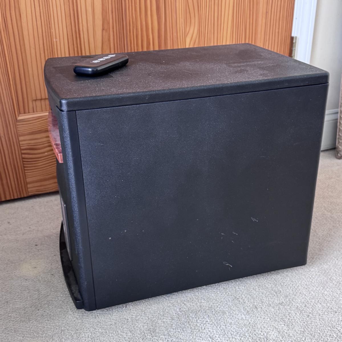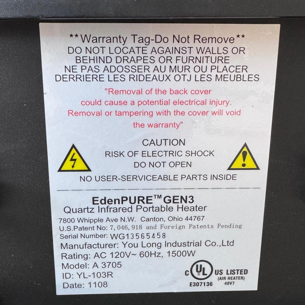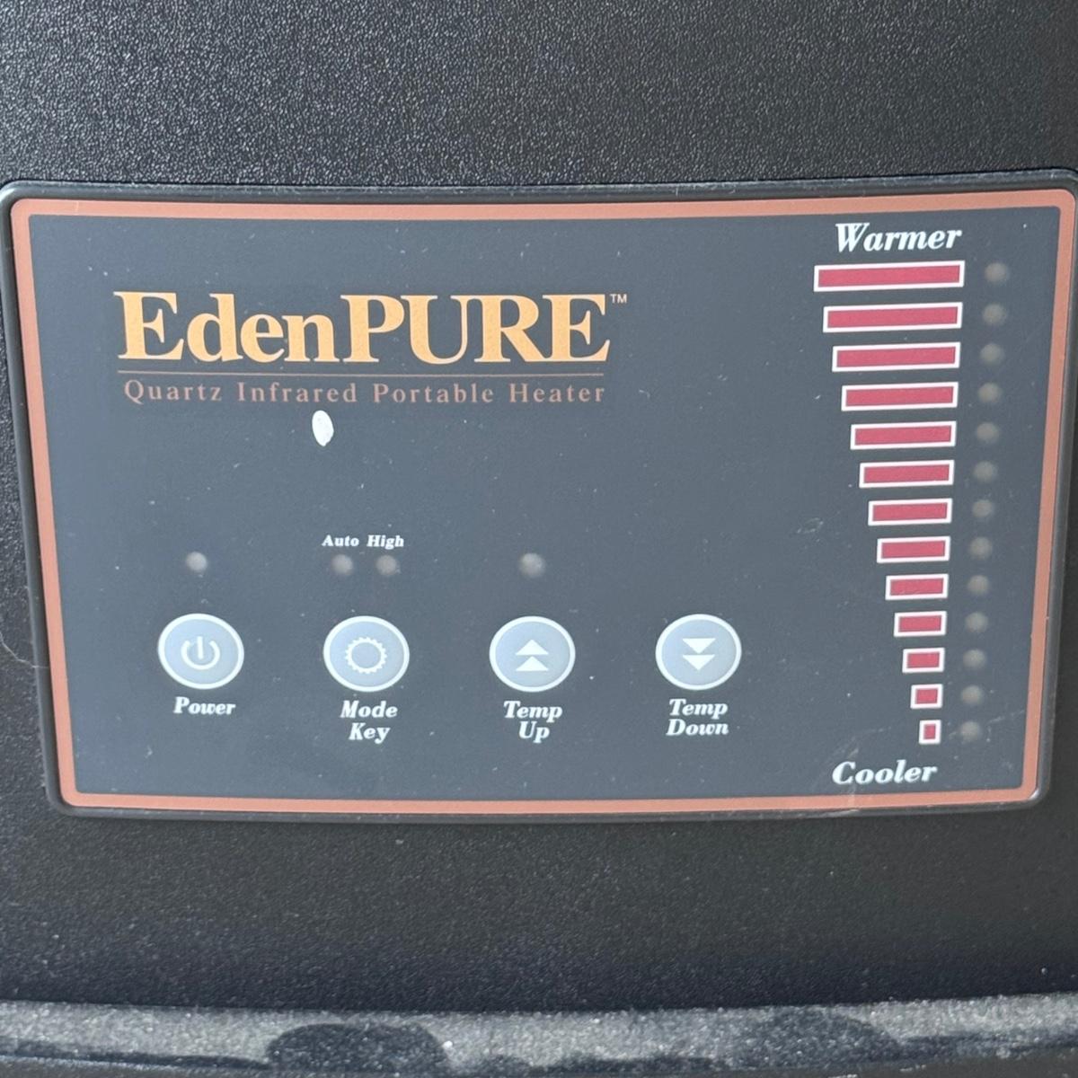 Lot includes one EdenPURE infrared heater that comes with its original remote. The model number for this product is A 3705. The heater powered on when plugged in. It measures 12.95” x 18.5” x 16.5”H. Local pickup only.
