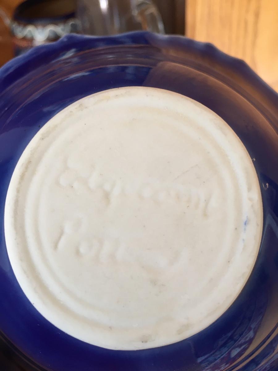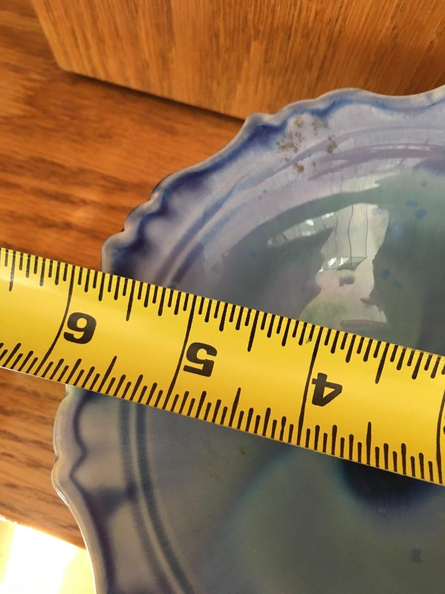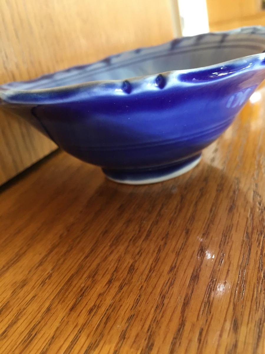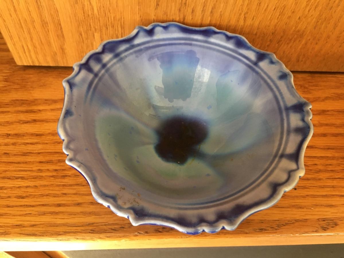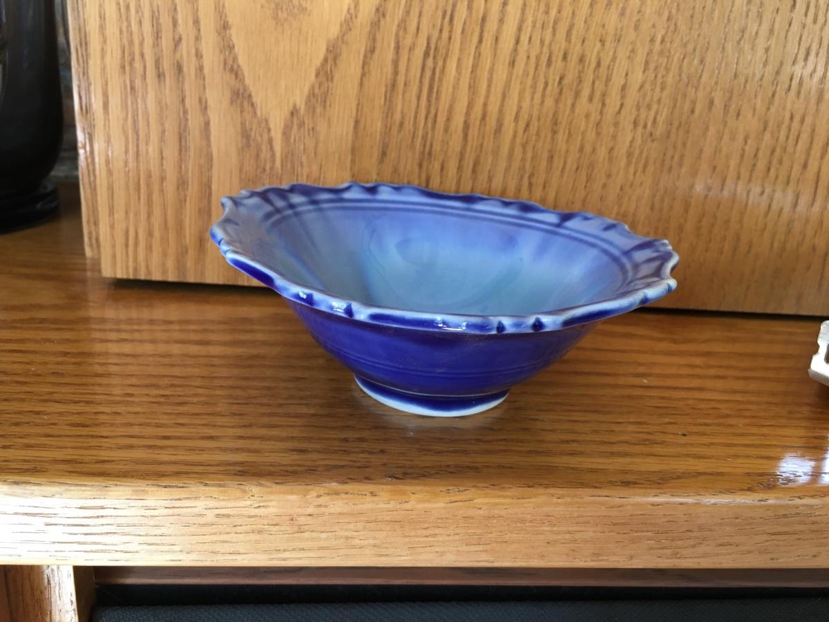 Small decorative Edgecomb ruffled edge bowl in shades of blue. No damage.