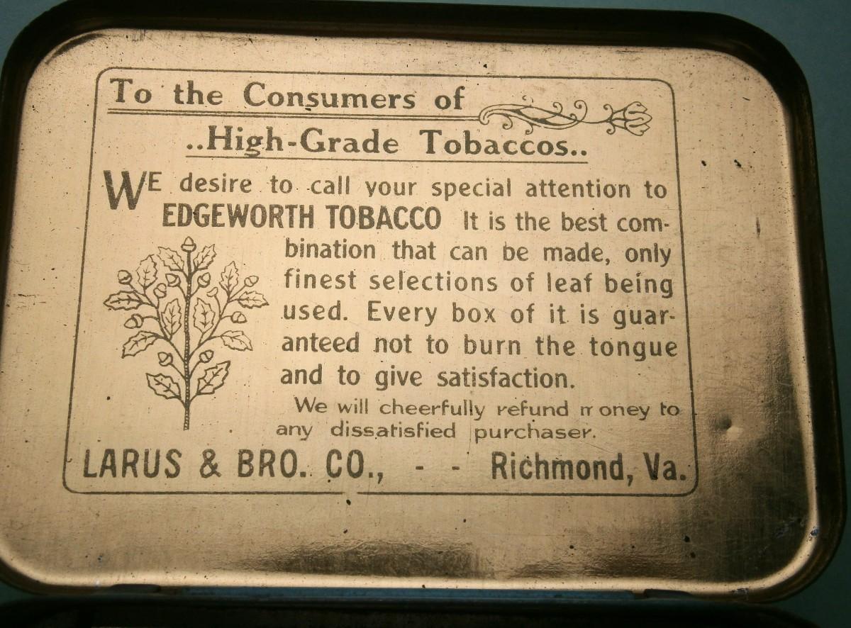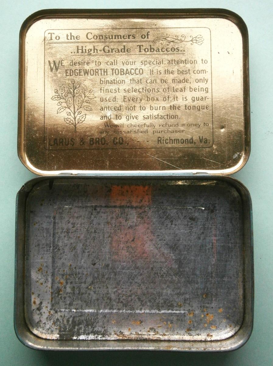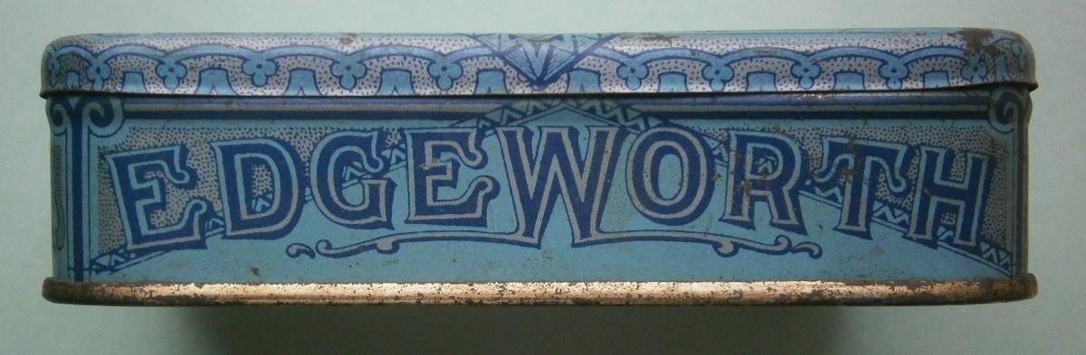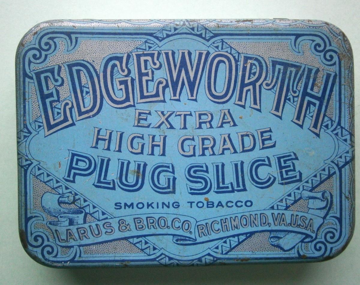 EDGEWORTH EXTRA HIGH GRADE PLUG SLICE Tin from the early 1900's, 4 1/2 x 3 1/4 x 1 1/8 in., lithographed tin.