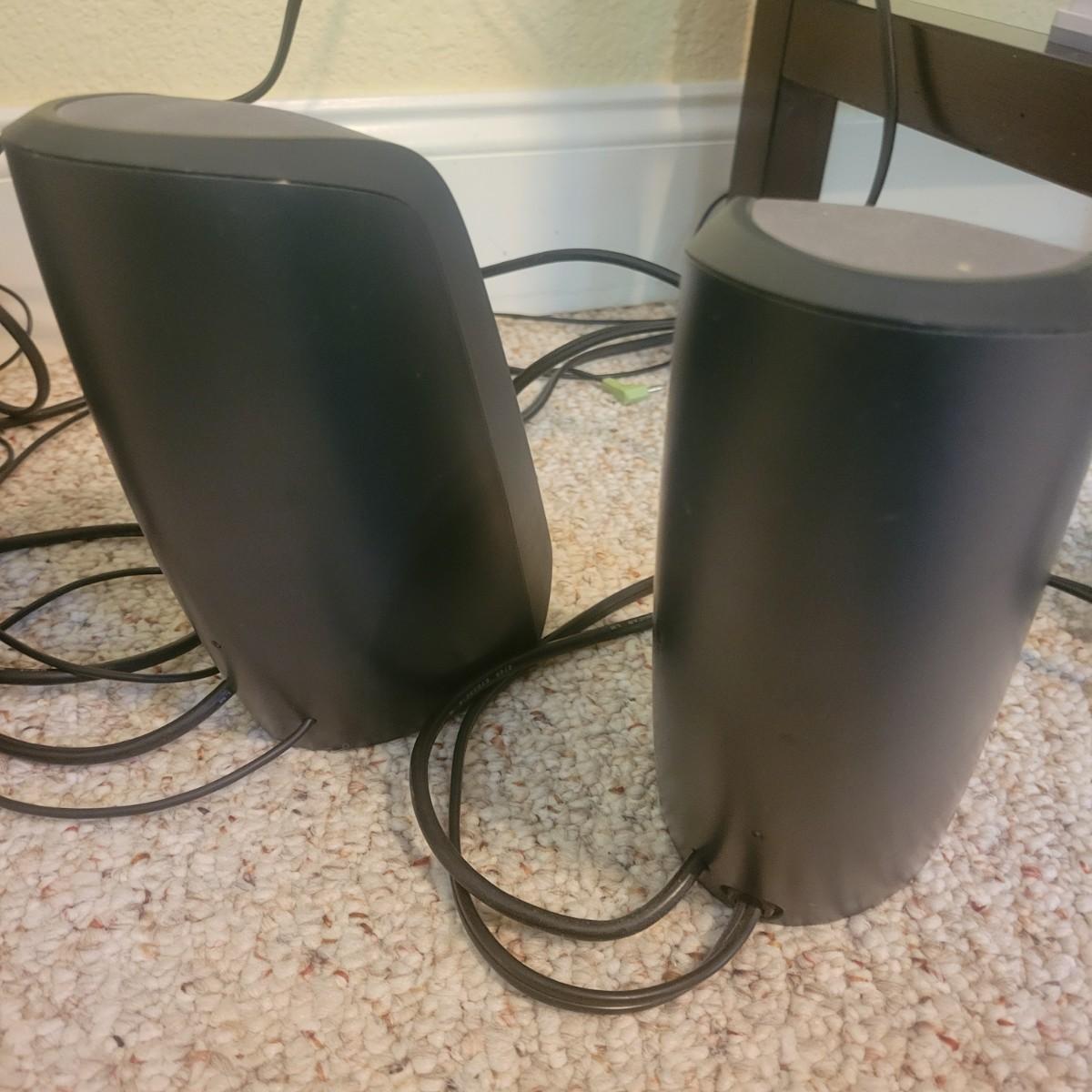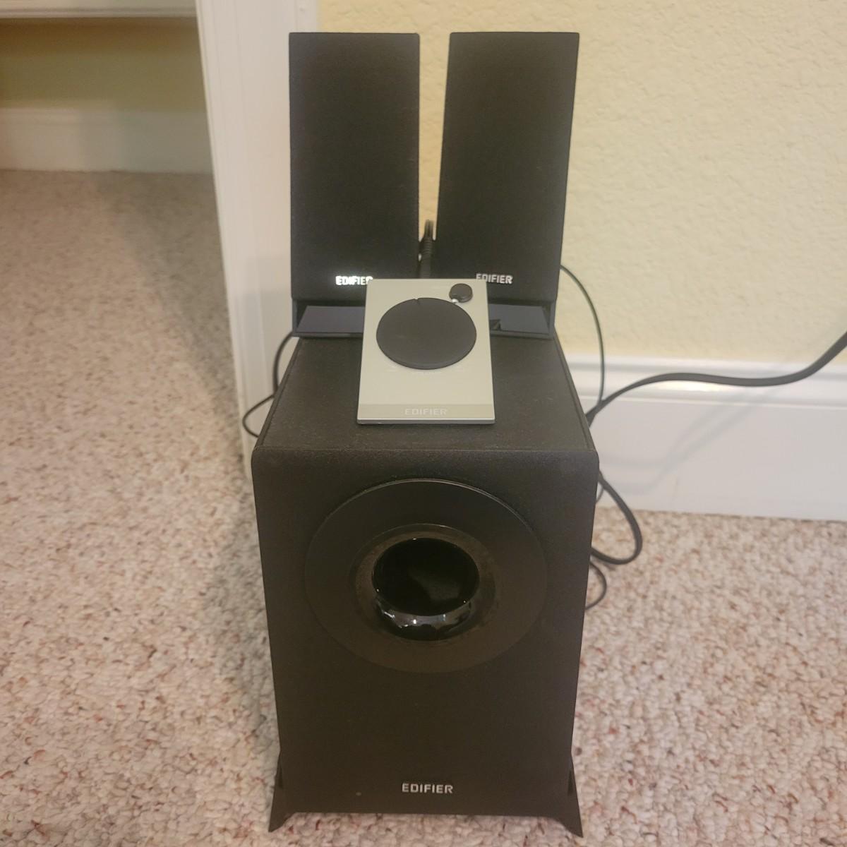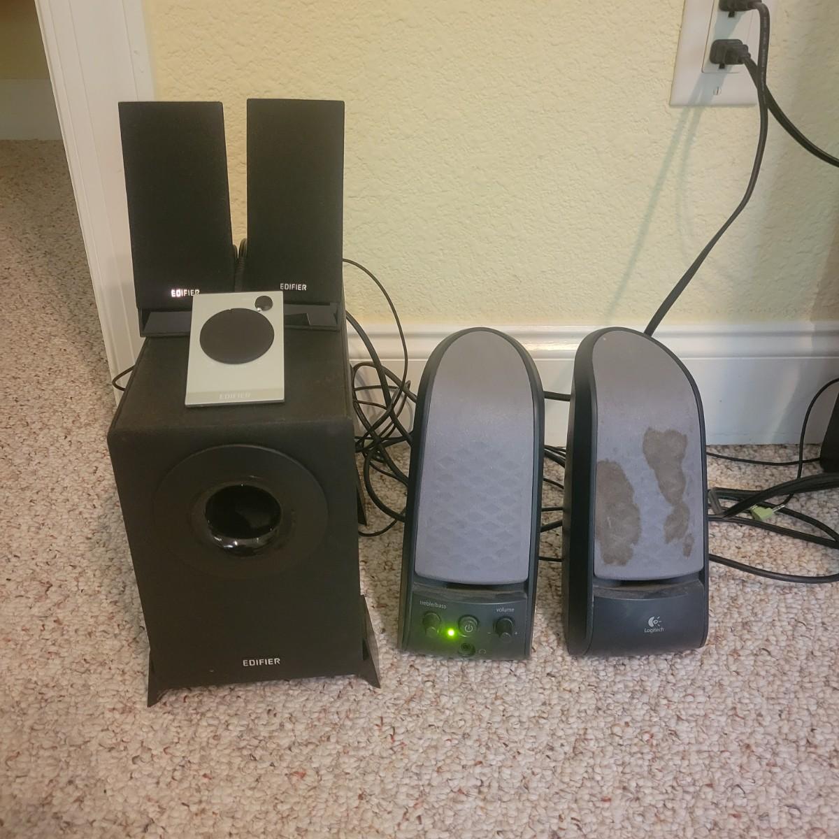 A set of Edifier and Logitech computer speakers that powered on when plugged in. The Edifier speakers feature a subwoofer, two satellite speakers and a wired remote for volume. The sub woofer messures approximately 6.5" x 10" x 9"H. The Logitech features two speakers and does have a stain on the speaker screen. Both systems connect through a 3.5mm jack. Shipping available