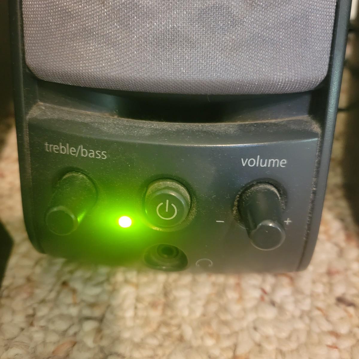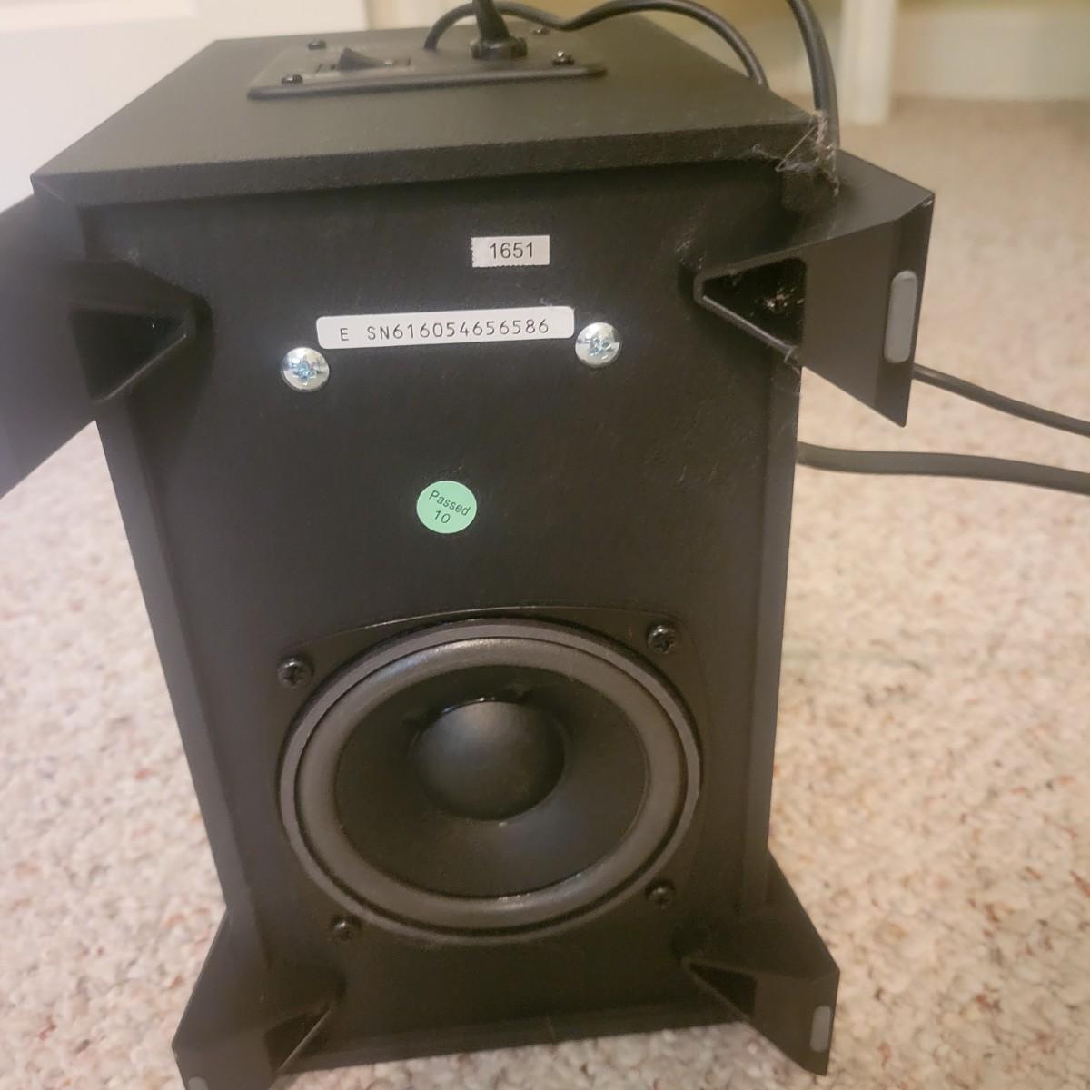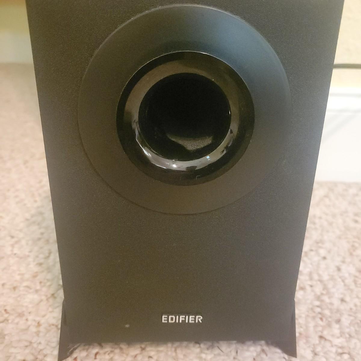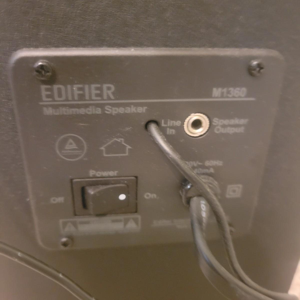 A set of Edifier and Logitech computer speakers that powered on when plugged in. The Edifier speakers feature a subwoofer, two satellite speakers and a wired remote for volume. The sub woofer messures approximately 6.5" x 10" x 9"H. The Logitech features two speakers and does have a stain on the speaker screen. Both systems connect through a 3.5mm jack. Shipping available