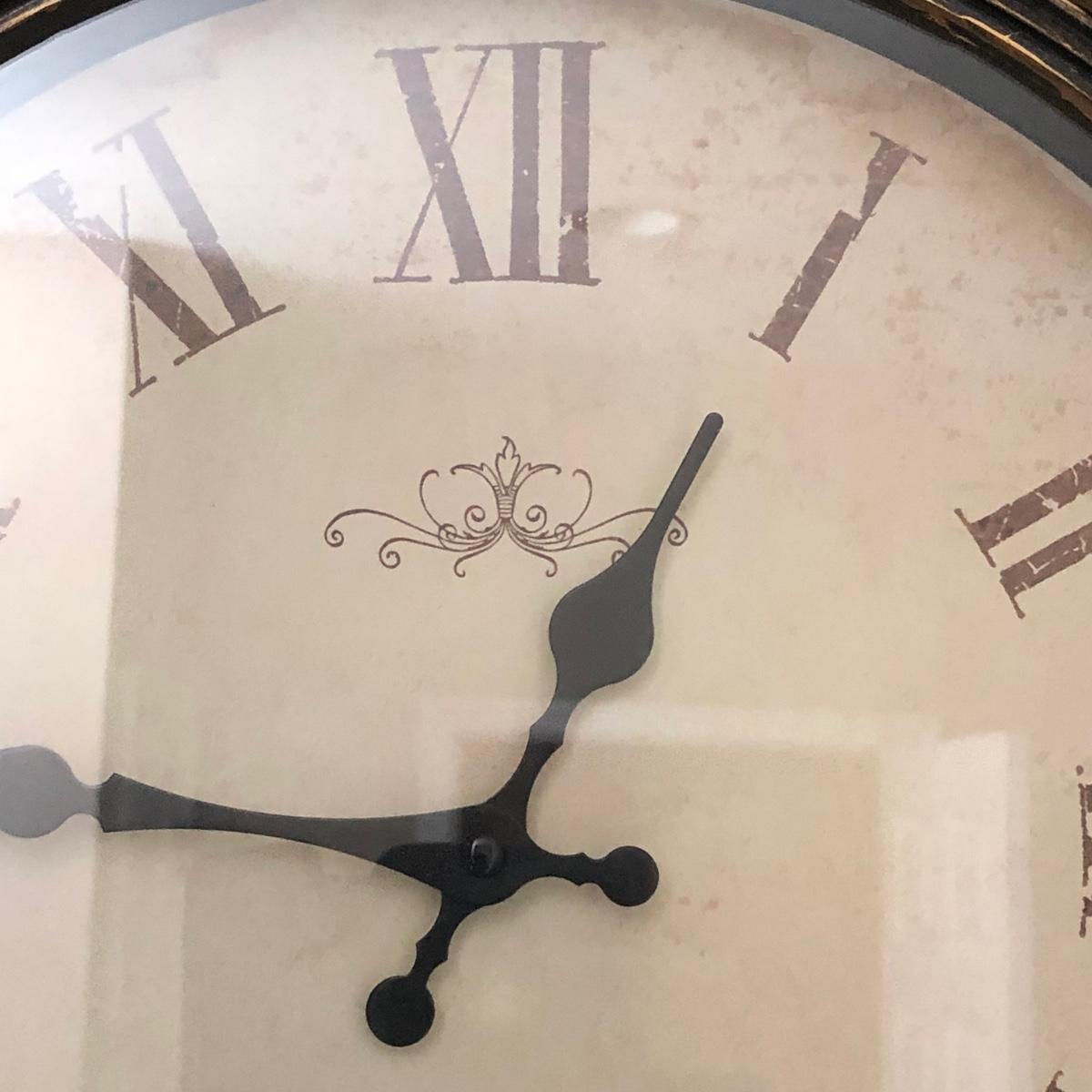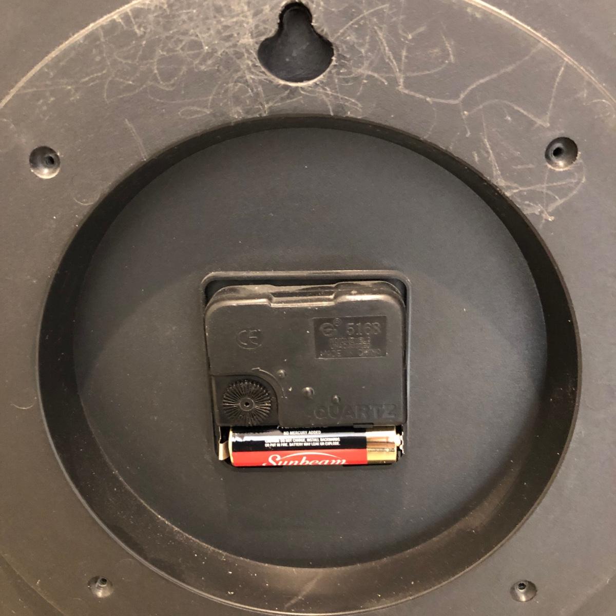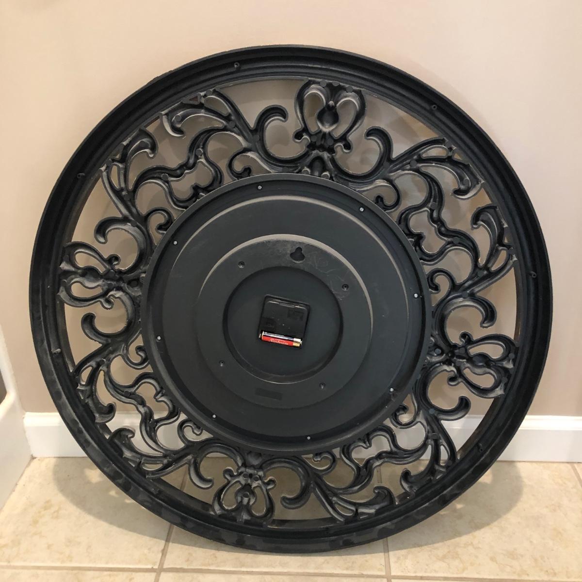 Clock has brown copper plastic edge with a plastic face. Clock is ticking and is battery operated. It measures 26” in diameter.