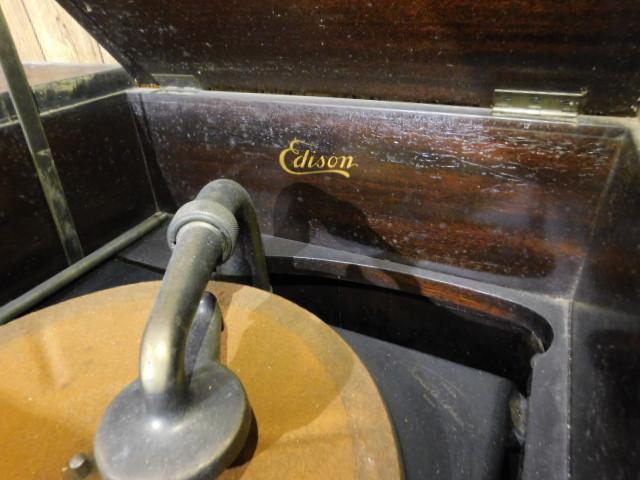 Edison Turntable Phonograph and Cabinet 39"x 20"x28" has some scratches and wear to surface. Cranks and spins