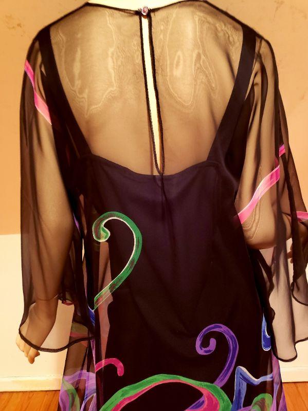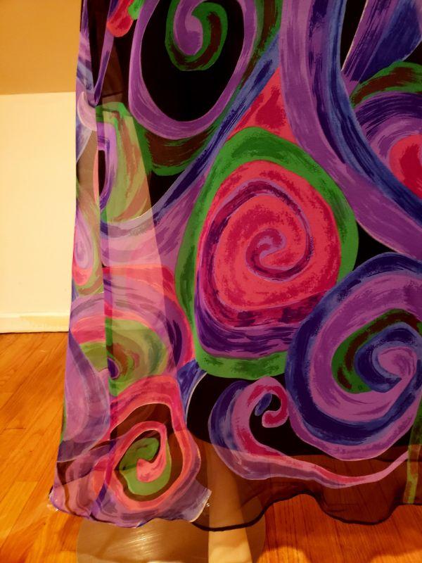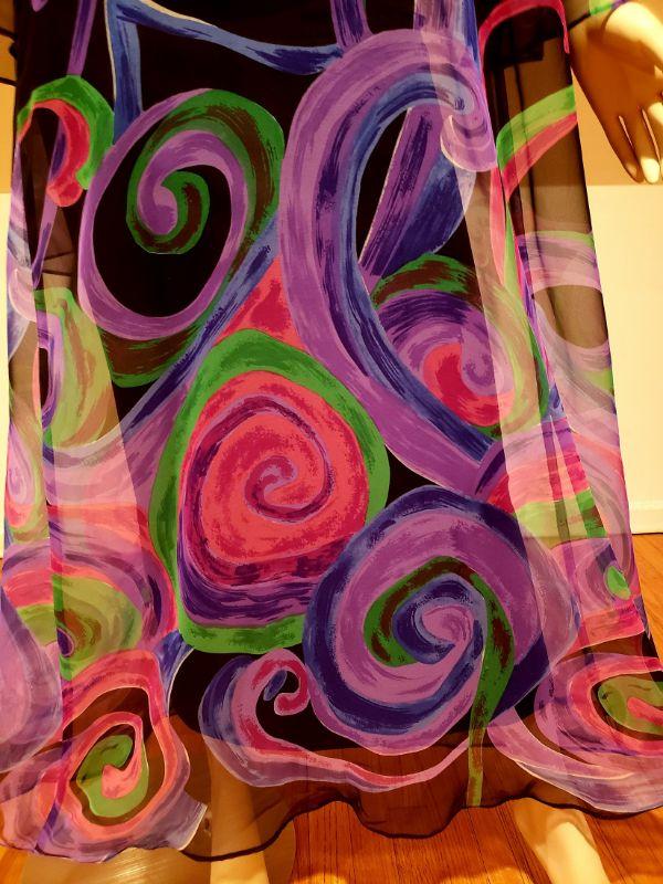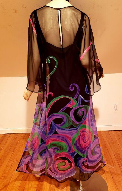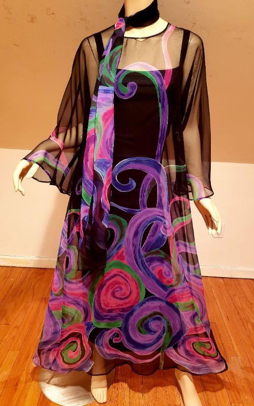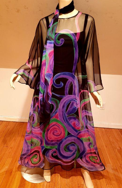 Rare and special under layer maxi solid dress and Hand painted Chiffon over layering maxi dress with long hand painted scarf. Ensemble is by Edith Flagg California