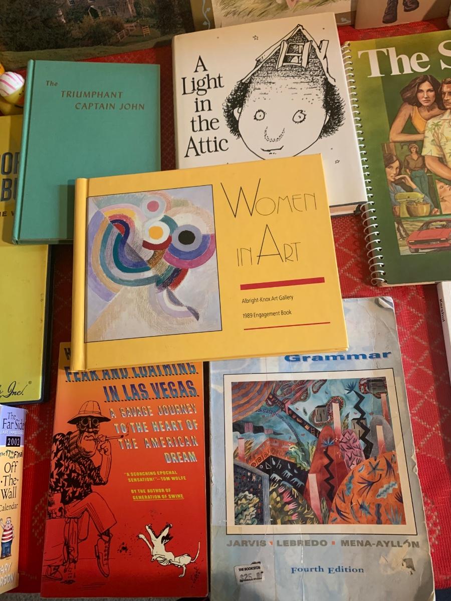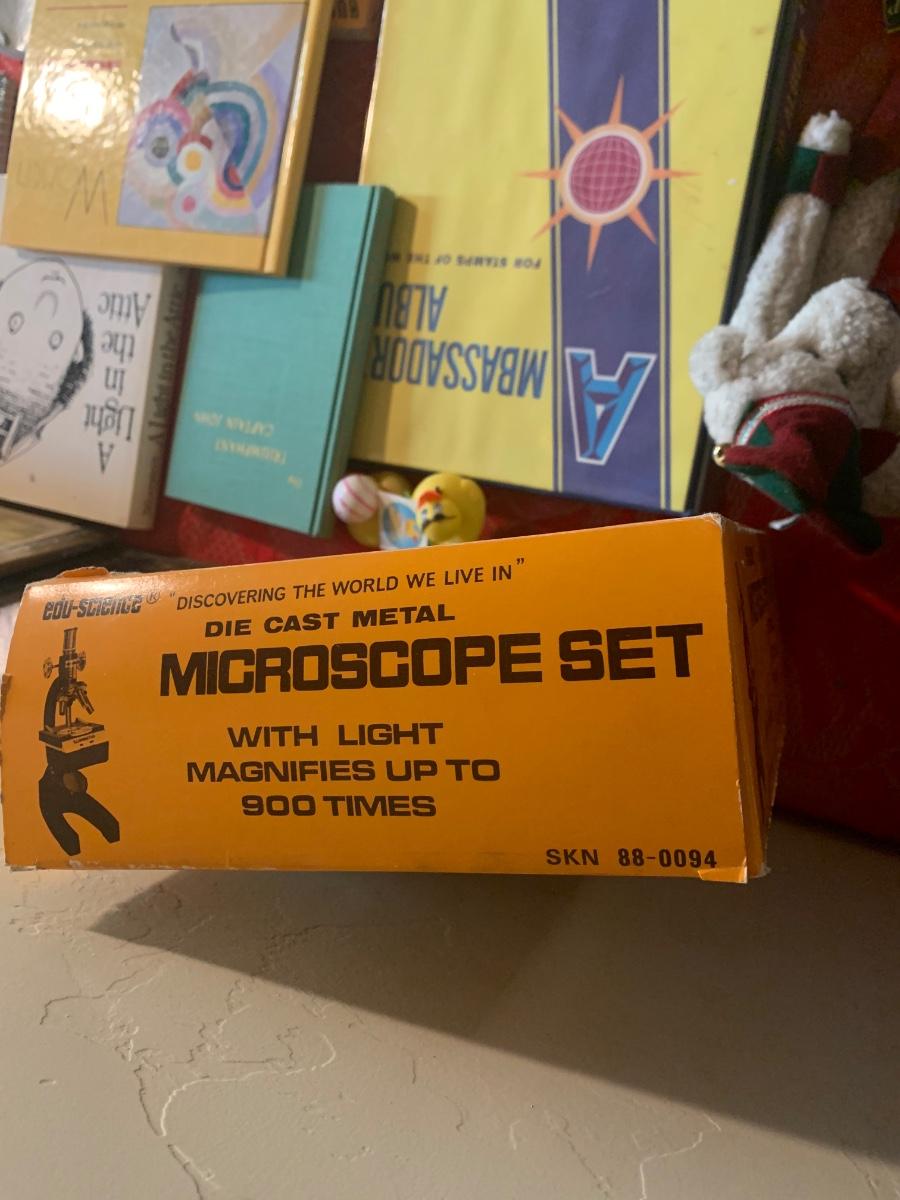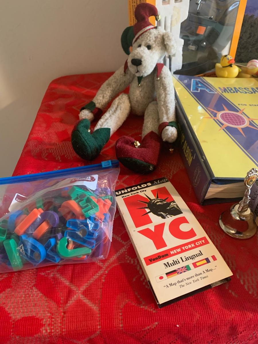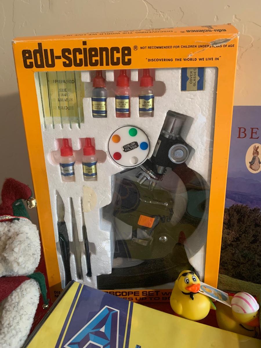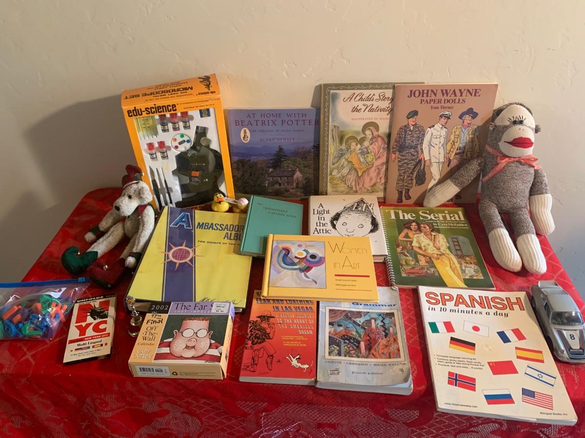 Lot includes a Edu-Science microscope, kids books and other, sock monkey, collector’s bell and other items.