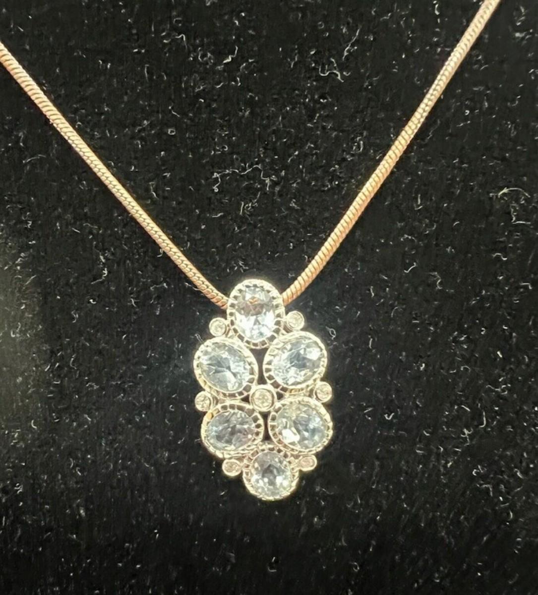 Aquamarine gems set in 14K white gold setting, 925 Sterling 18 inch chain.