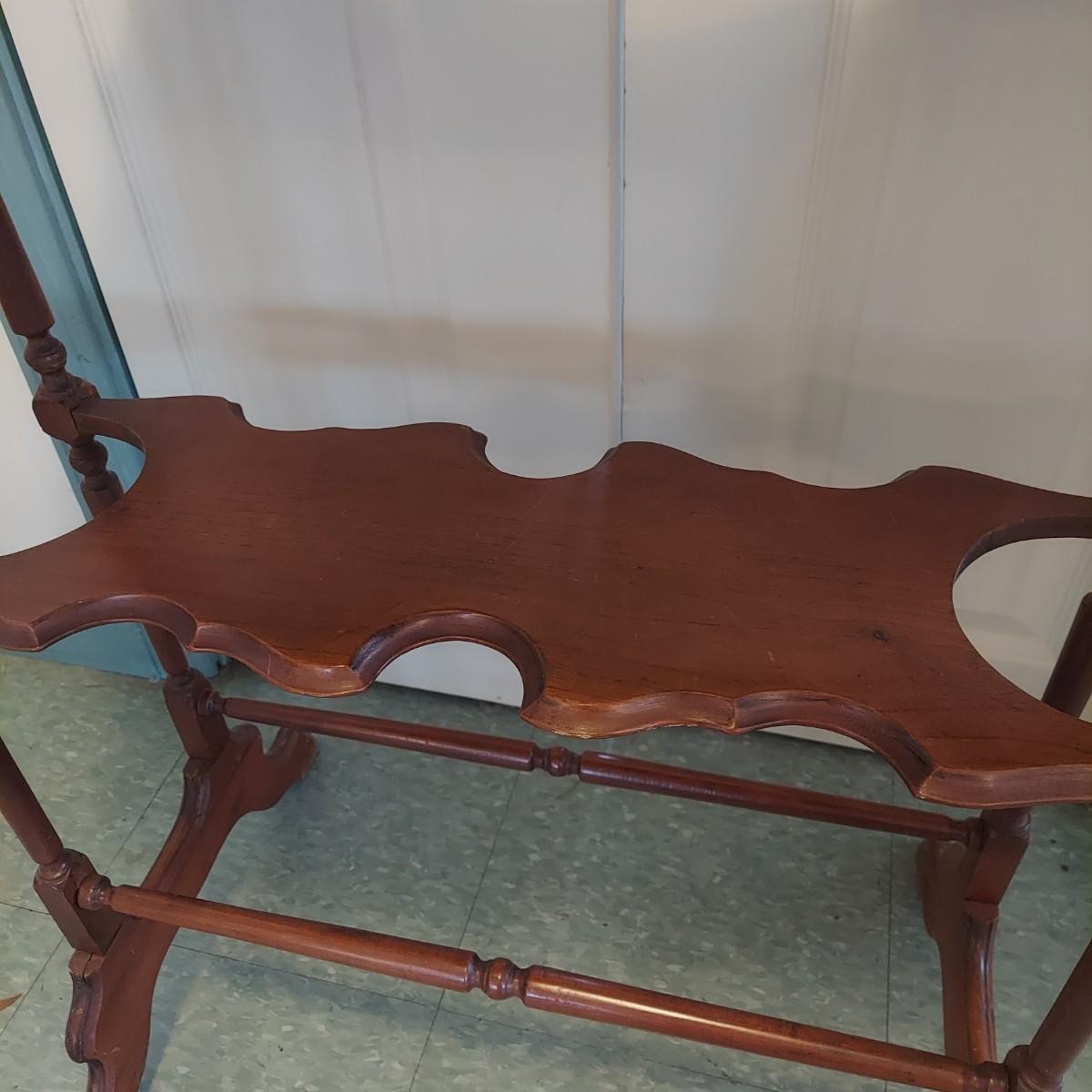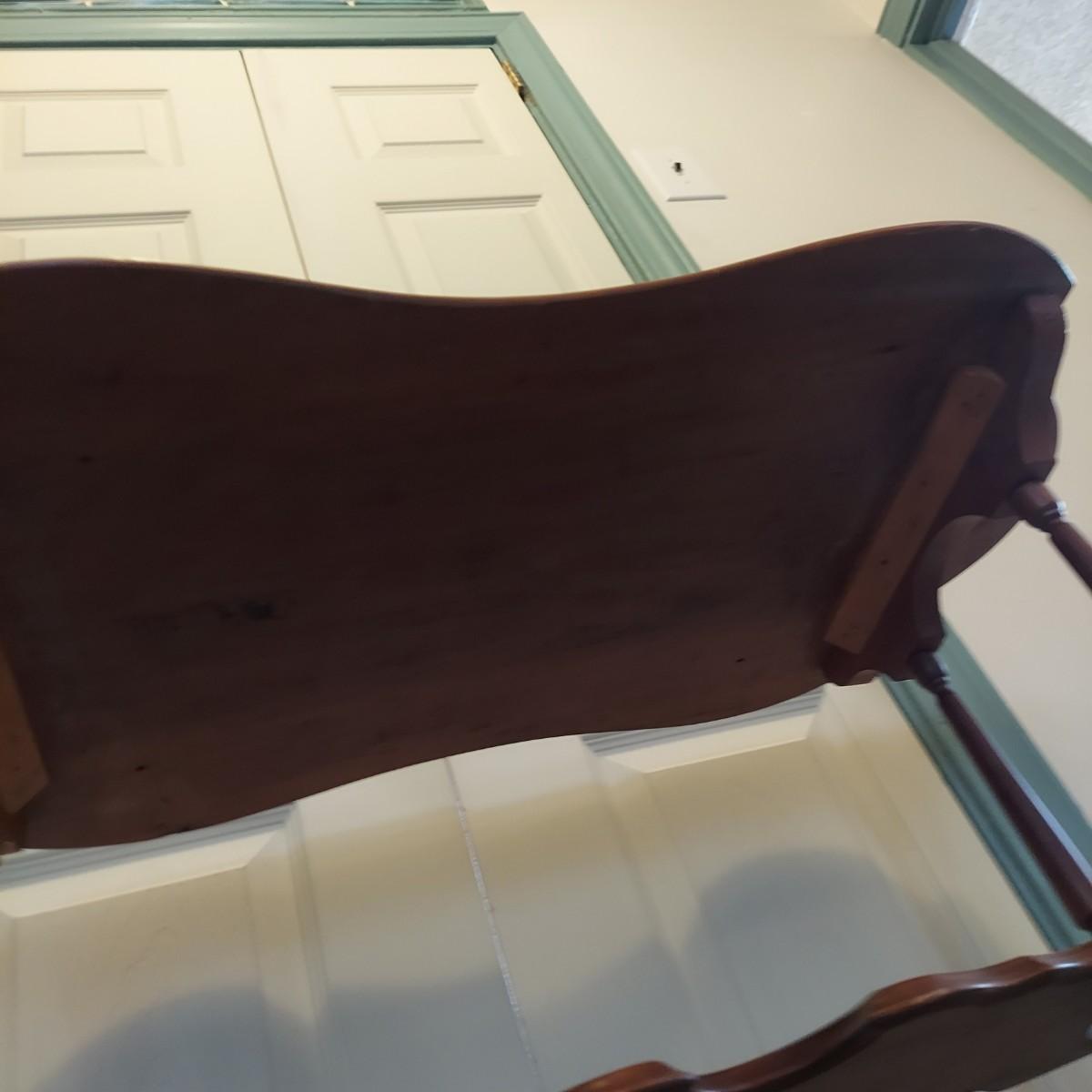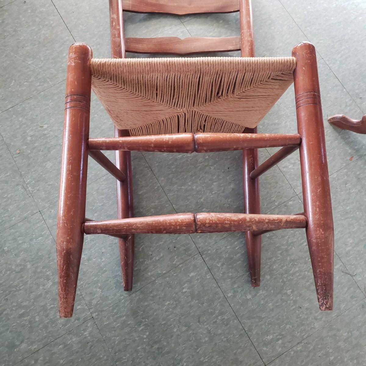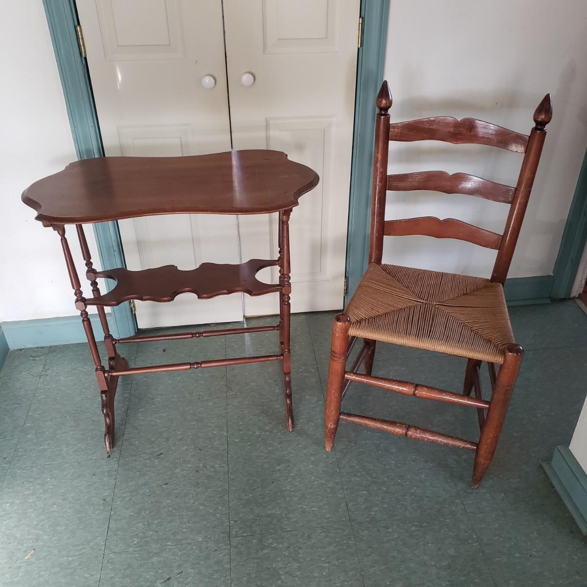 This two piece lot features a wooden side table in an Edwardian style that measures 29” x 16” x 29"H. Table is solid wood but is slightly rickety. Some wear to the top. The rush wooden chair measures 17" x 15" x 37"H, with a seat height of 18". The chair appears to be solid and blemish free. Please see photos for details. Local Pickup Only